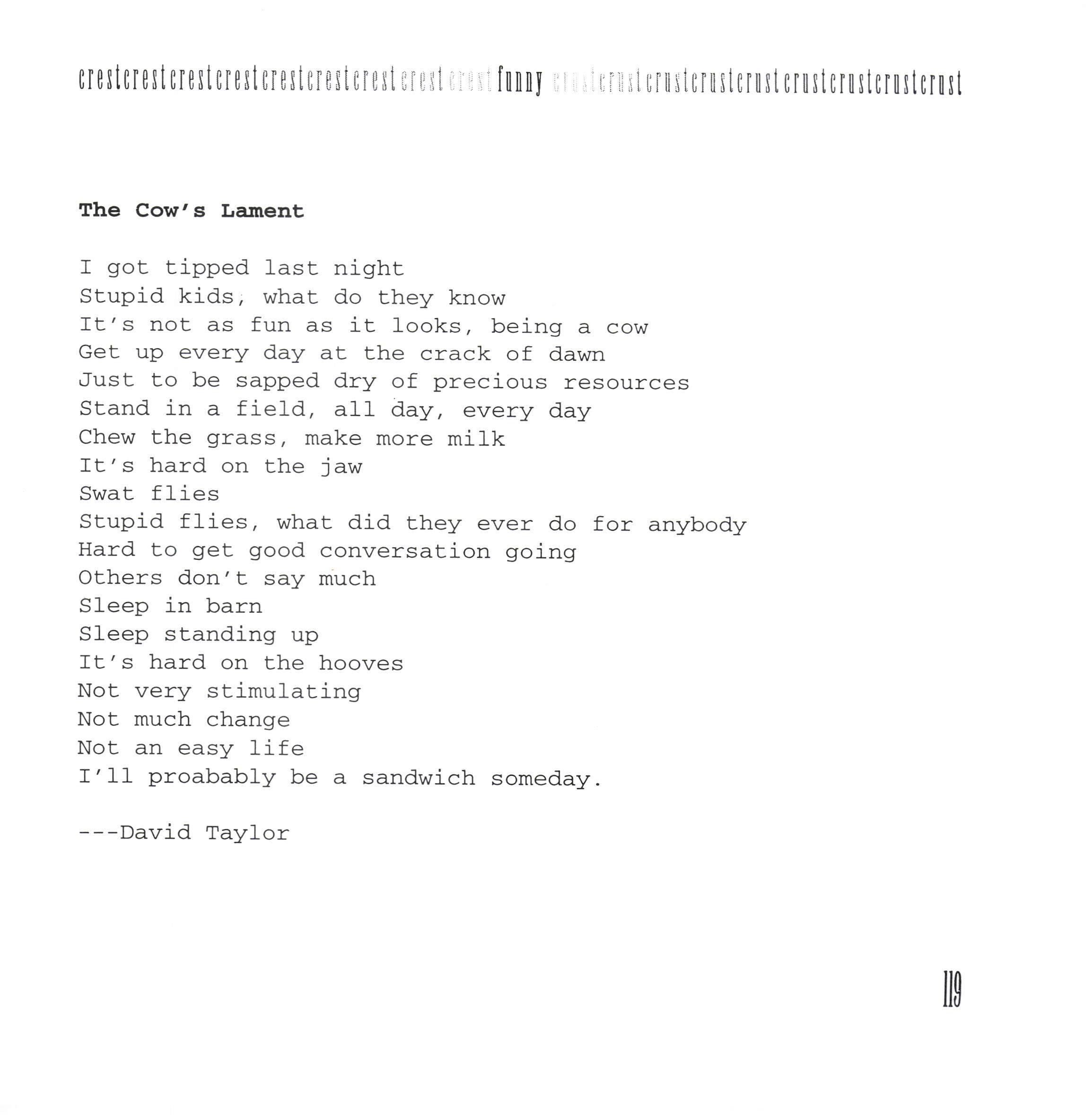 Stupid kids; what do they know It's not as fun as it looks, being a cow Get up every day at the crack of dawn Just to be sapped dry of precious resources Stand in a fieId, all d.y, every day Chew the grass, make more milk It's hard on the jaw Swat flies