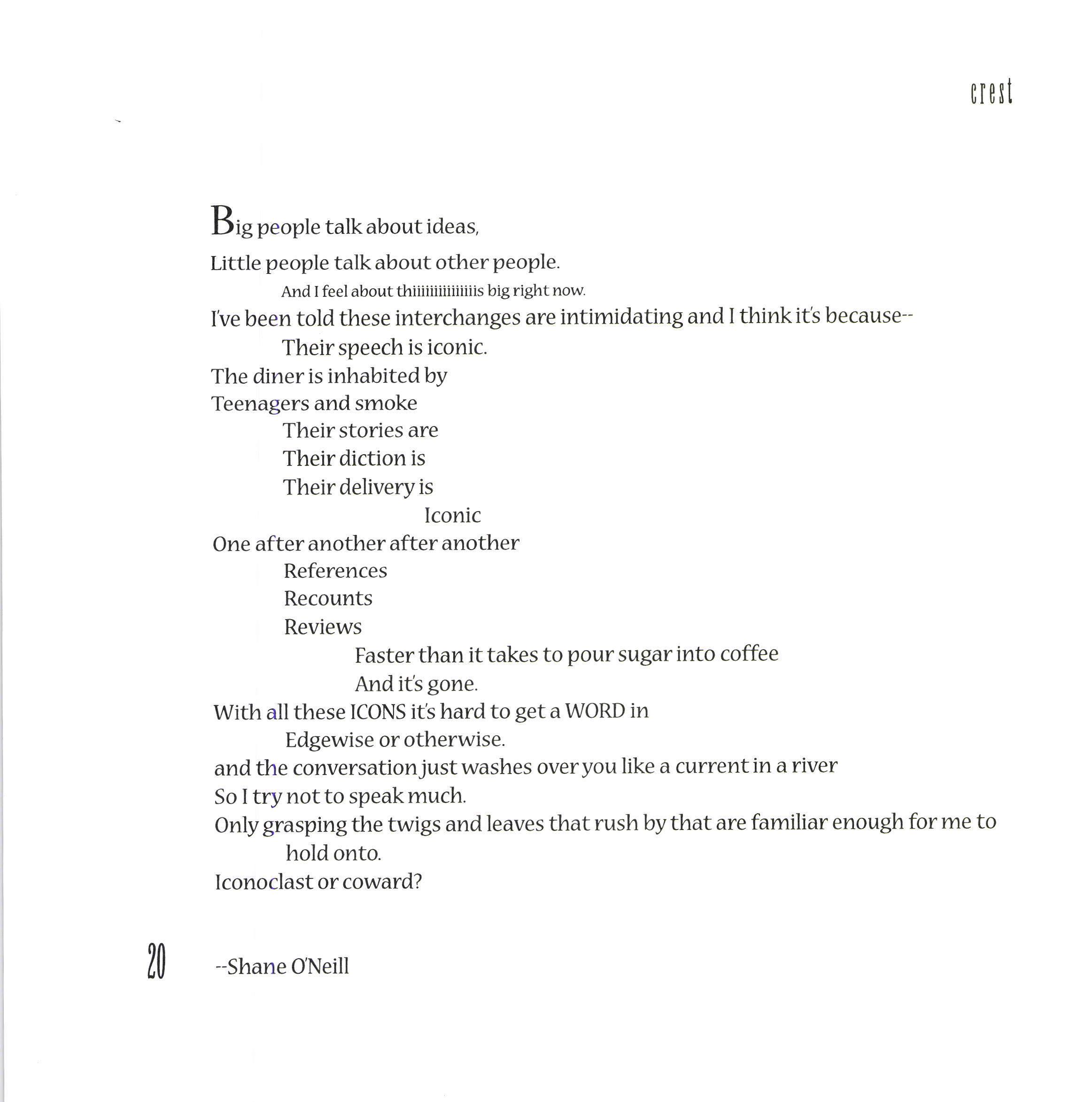 Almost as the situation came to a pace, even and steady, a voice called to me. Cold, frigid and common. I knew who it was. The sound was all too familiar. Simon Veralis; third grader,lg79 with brown hair,ll fingers, green eyes and an unbreakable cigarette addiction. He had a walk to him. His left foot would always hit a split second afterhis right. He sounded like a horse, coming down the hall. Cla-Click, etc....