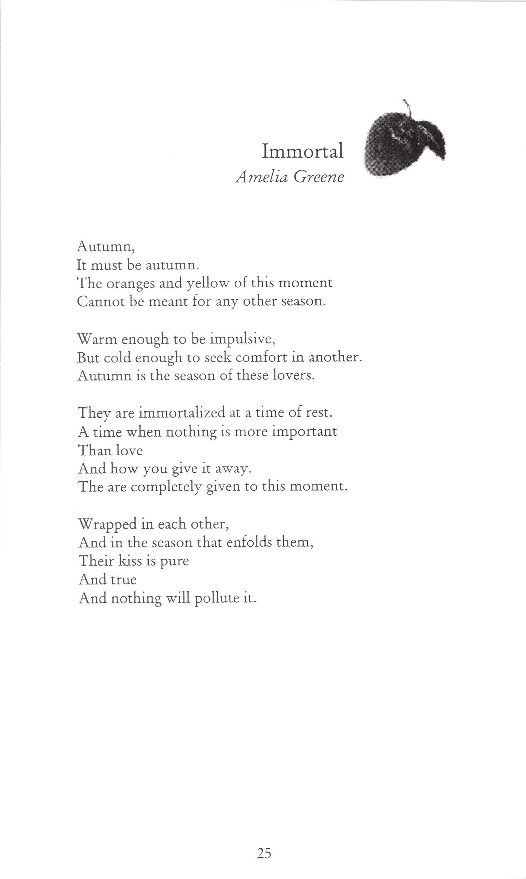38. Katherine Parker. There were trenches. 39. Lisa Locascio. Hymn. 40. Michael Seidman. Don't Cry. 41. Justin Perez. Footprints. 42. Penelope Hudak. 50s Sitcoms. 43. Kate Merrick. Comic Book Love Story. 46. Max Bjornson. Jacob. 47' EmrlY'uflhite' JellYfish' 48. Ashley Adler. I am Light and Caffeine. 4g.ZekeZverow. The rain comes. 51,. Lucy'W'ilson. Napkins and Forks. 52. John Clark. Da Field. Prose 54. Justin Perez:'Walter. 56. Adam Schleimer. I can't really define ugly. 58. Stephanie Jetter. Snap Back to Conciousness. e+' v'nnrosfirr,* J;tsr"';:m: Neyfakh.'Wild Roger. Huskie Pride 74. Christina J Tooth Vizard. 75. Christina 76- Adrrenne'W the Innocent 79. Stefanie Curry