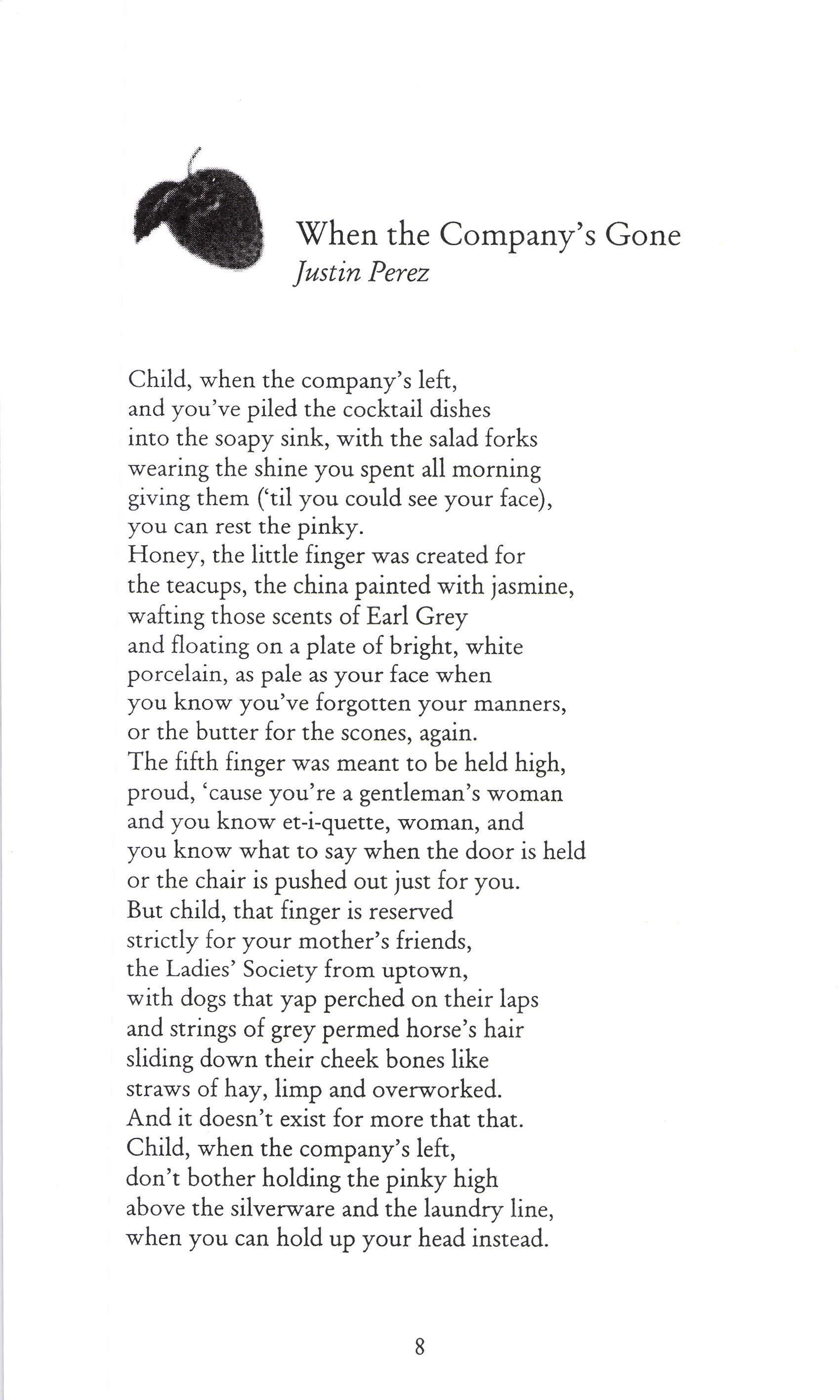 Child, when the company's left, and you've piled the cocktail dishes into the soapy sink, with the salad forks wearing the shine you spent all morning giving them ('til you could see your face), you can rest the pinky. Floney, the little finger was created for the teacups, the china painted with jasmine, wafting those scents of Earl Grey and floating on a plate of bright, white porcelain, as pale as your face when you know you've forgotten your marlners, or the butter for the scones, again. The fifth finger was meant to be held high, proud, 'cause you're a gentleman's woman and you know et-i-quette, woman, and you know what to say when the door is held or the chair is pushed out just for you. But child, that finger is reserved strictly for your mother's friends, the Ladies' Society from uptown, with dogs thar yap perched on their laps and strings of grey permed horse's hair sliding down their cheek bones like straws of. hay, limp and overworked. And it doesn't exist for more that that. Child, when the company's left, don't bother holding the pinky high above the silverware and the laundry line, vrhen you can hold up your head instead.