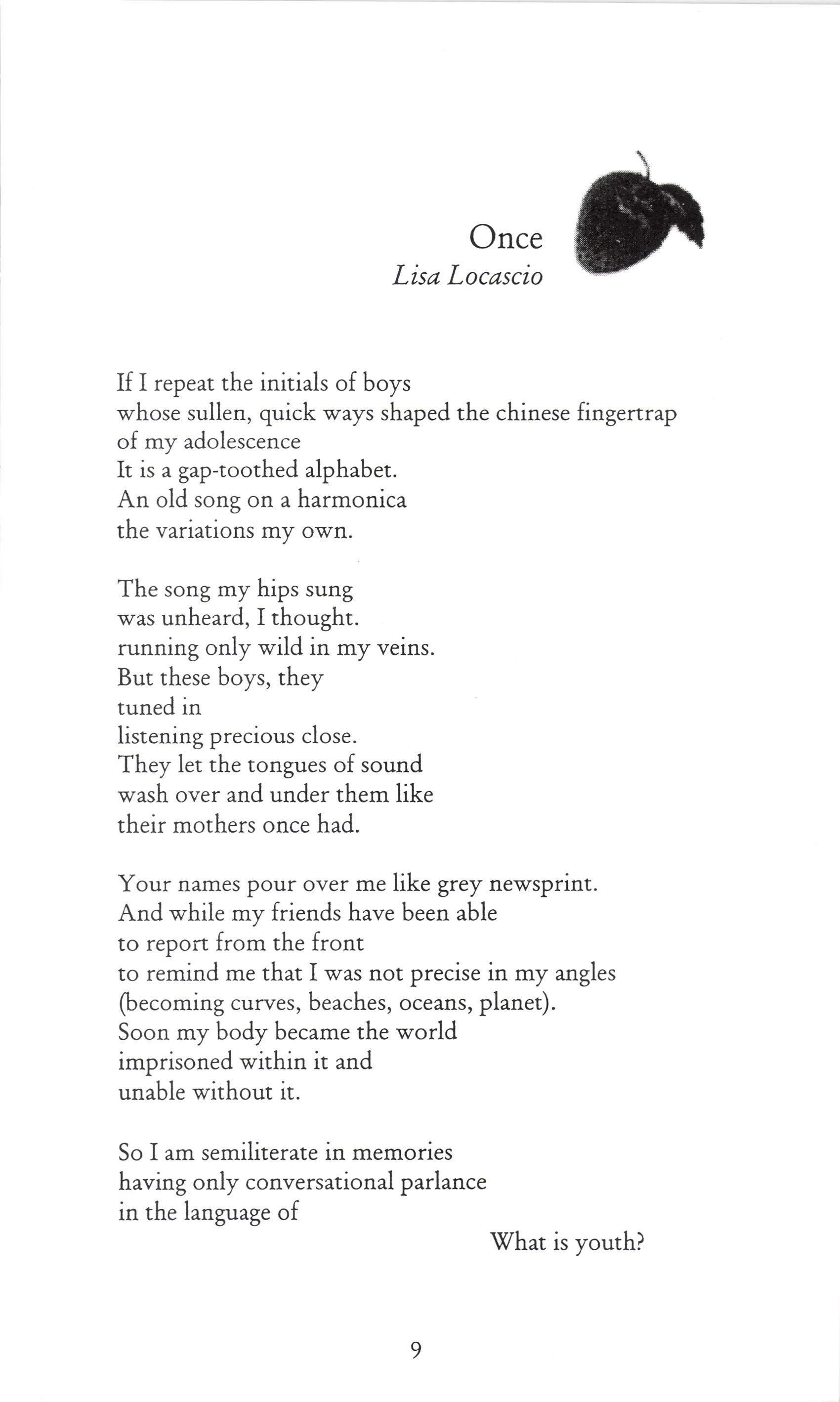 This was all due to the indisputable truth: summer nights when I caught scent of his absence. Slammed screen-doors to remind me that there was a time of darkness and the moisture of love when my body did not matter and my lips were wet with knowing.