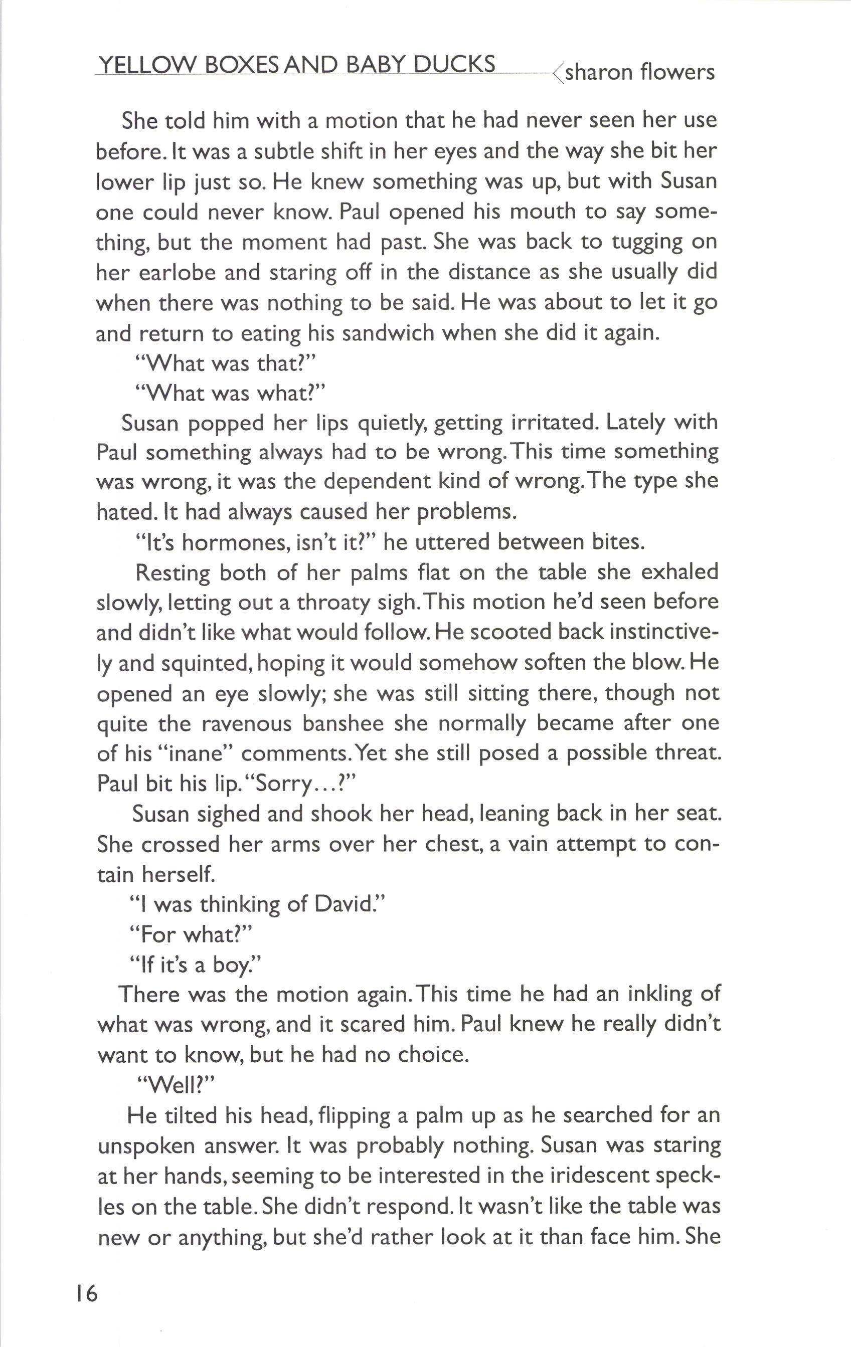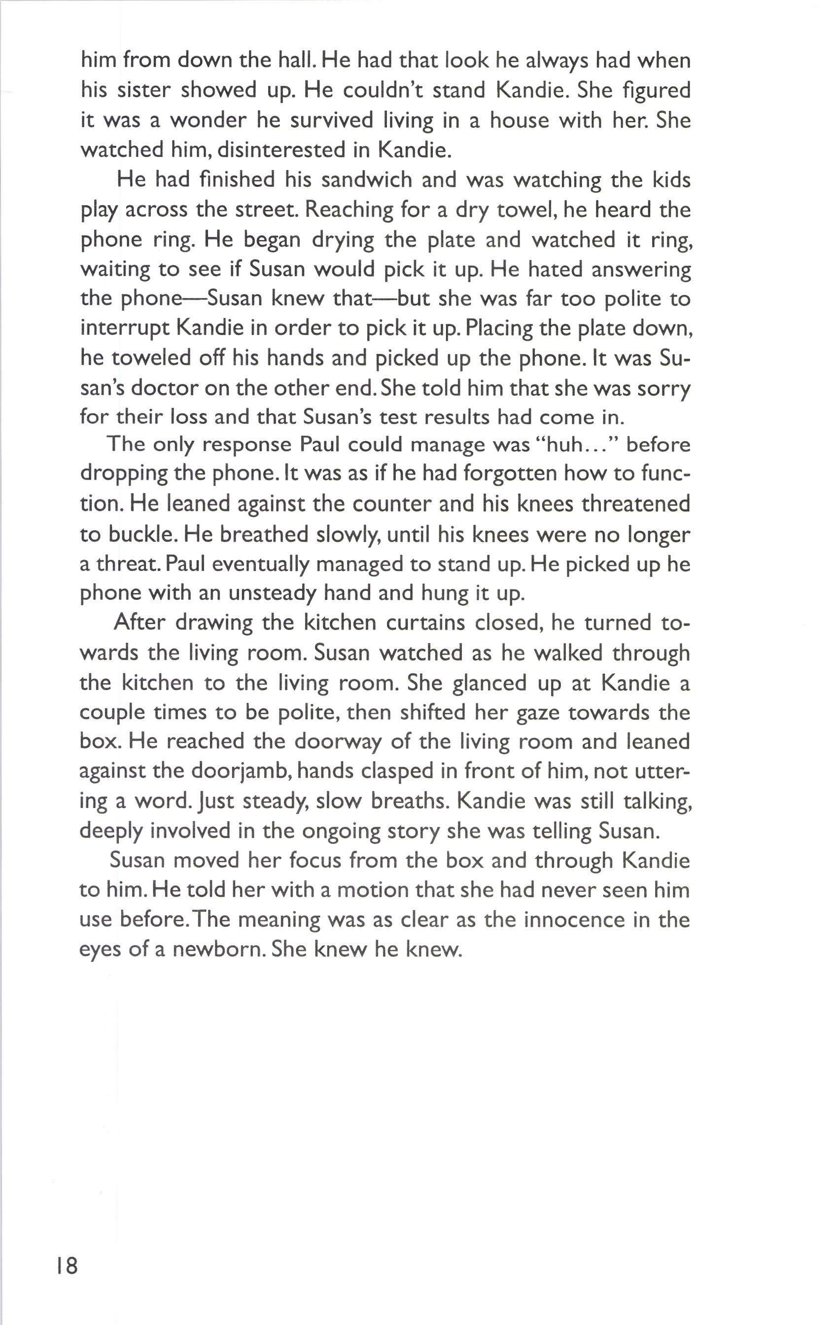 She told him with a motion that he had never seen her use before.lt was a subtle shift in her eyes and the way she bit her lower lip just so. He knew something was up, but with Susan one could never know. Paul opened his mouth to say something, but the moment had past. She was back to tugging on her earlobe and staring off in the distance as she usually did when there was nothing to be said. He was about to let it go and return to eating his sandwich when she did it again.
