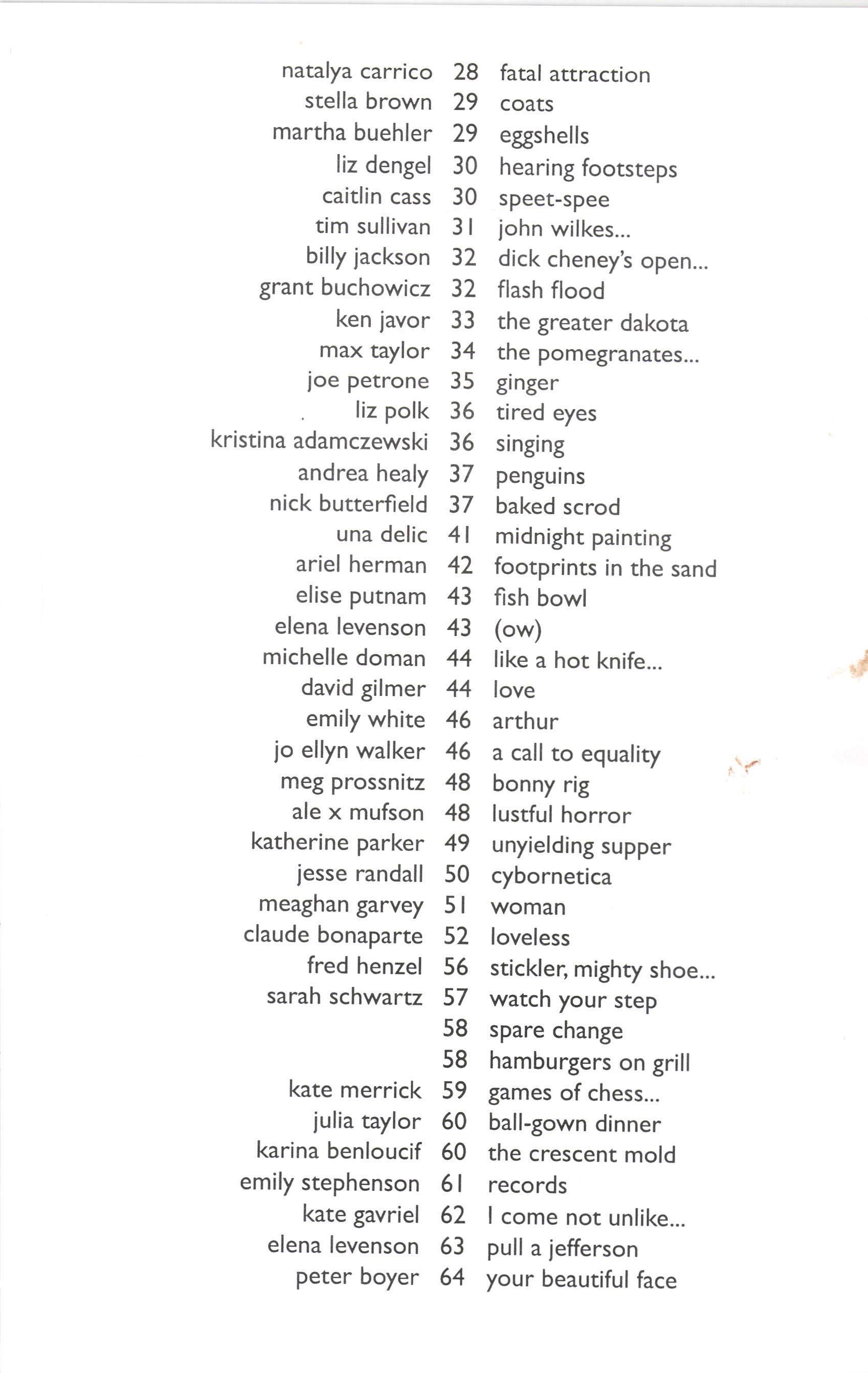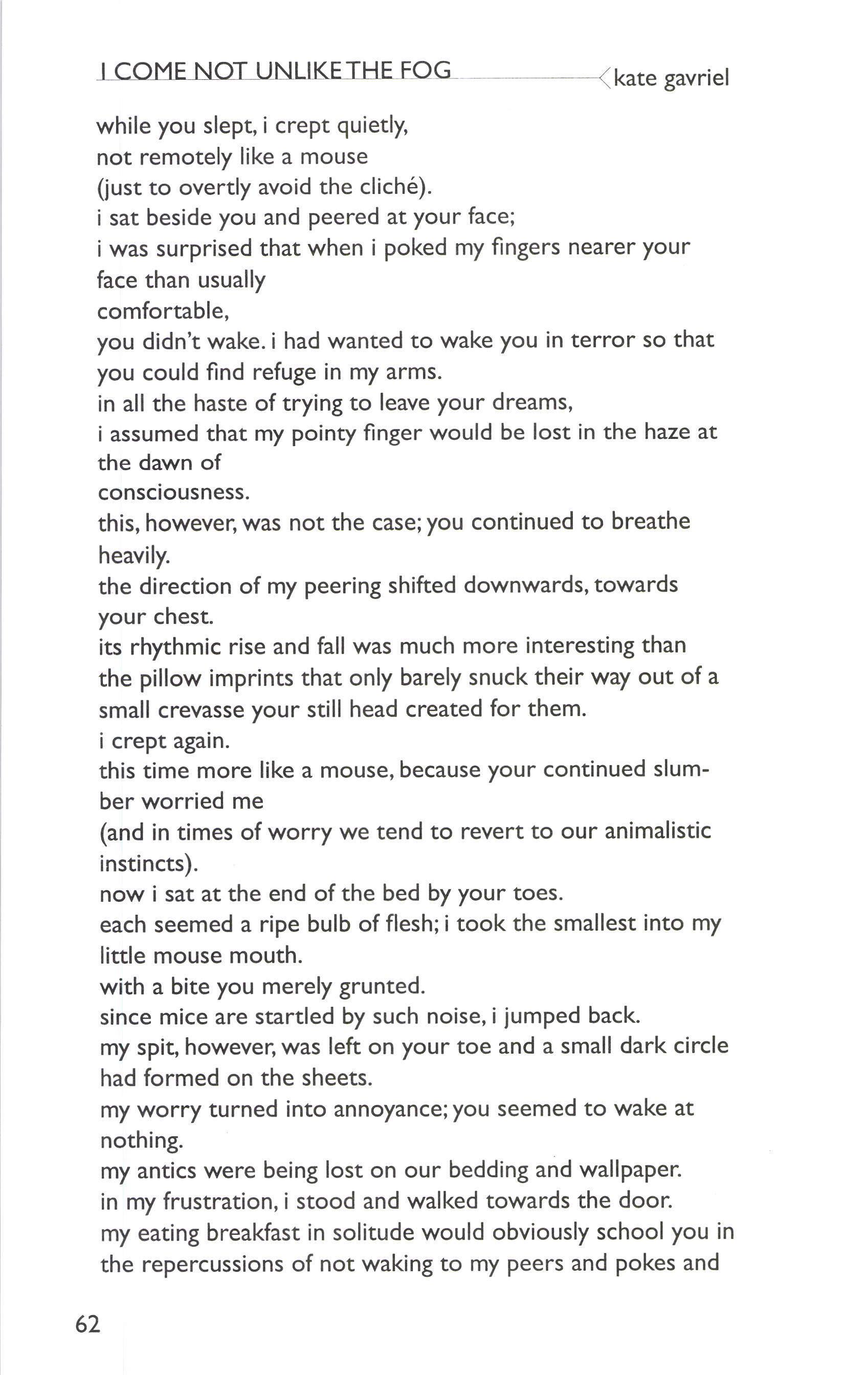Meaghan Garvey enjoys sailing in the blue salt water of your tears. 5 I Kate Gavriel enjoys the occasional tapdance and the freguent potluck. I 3, 62