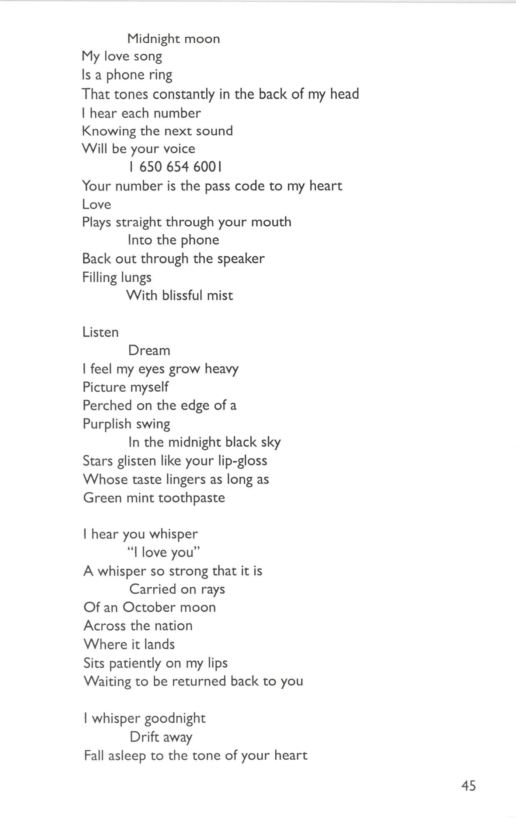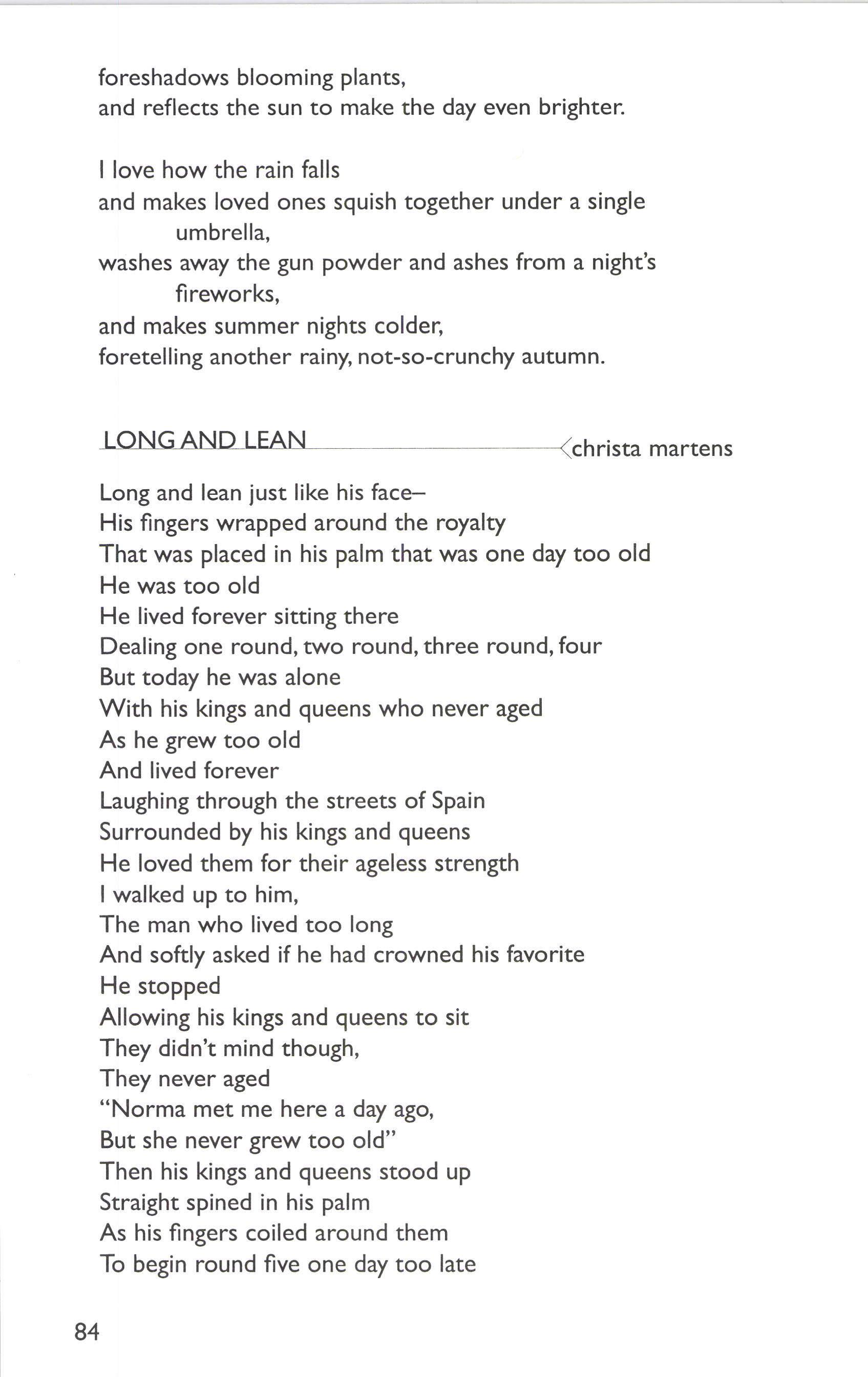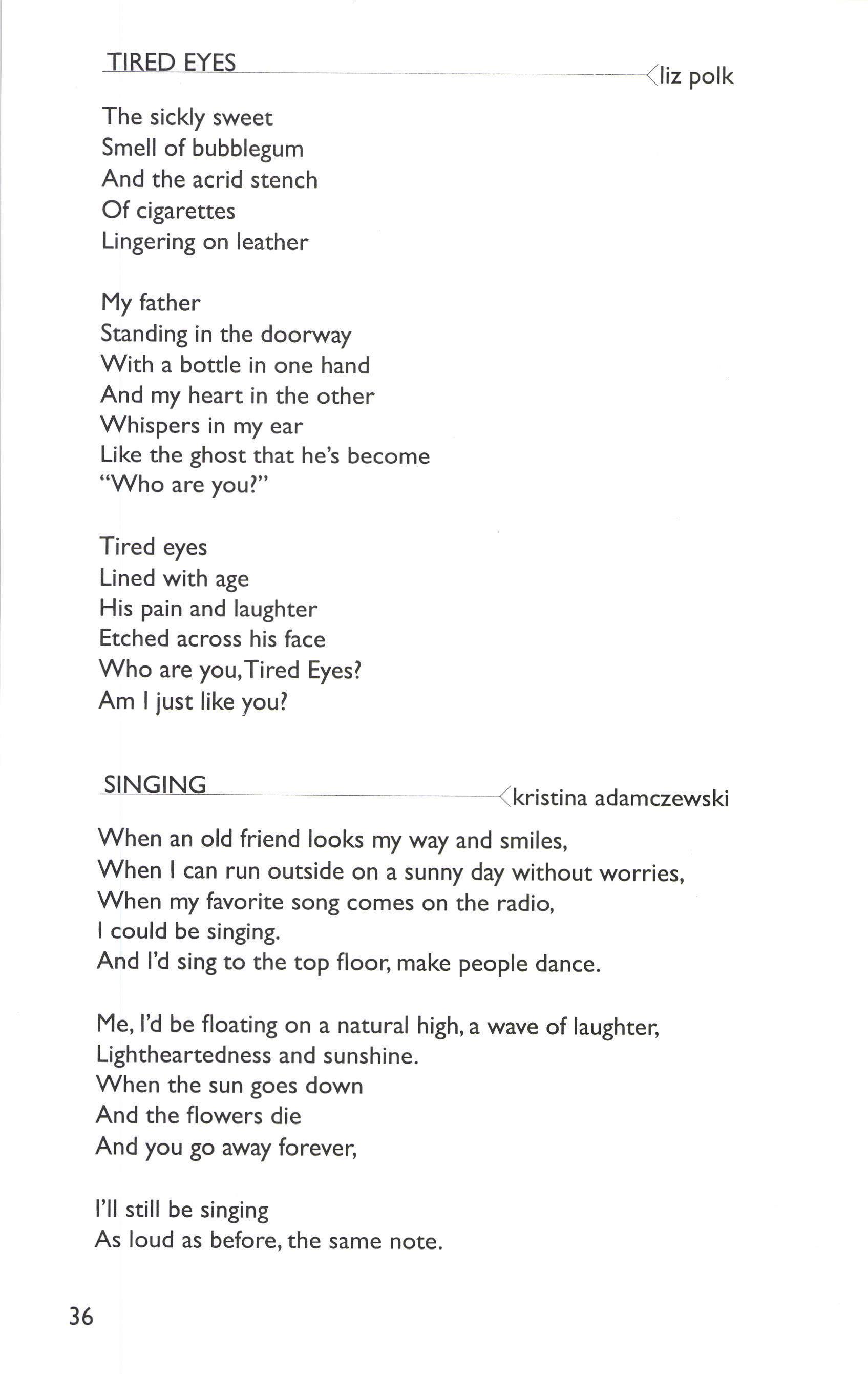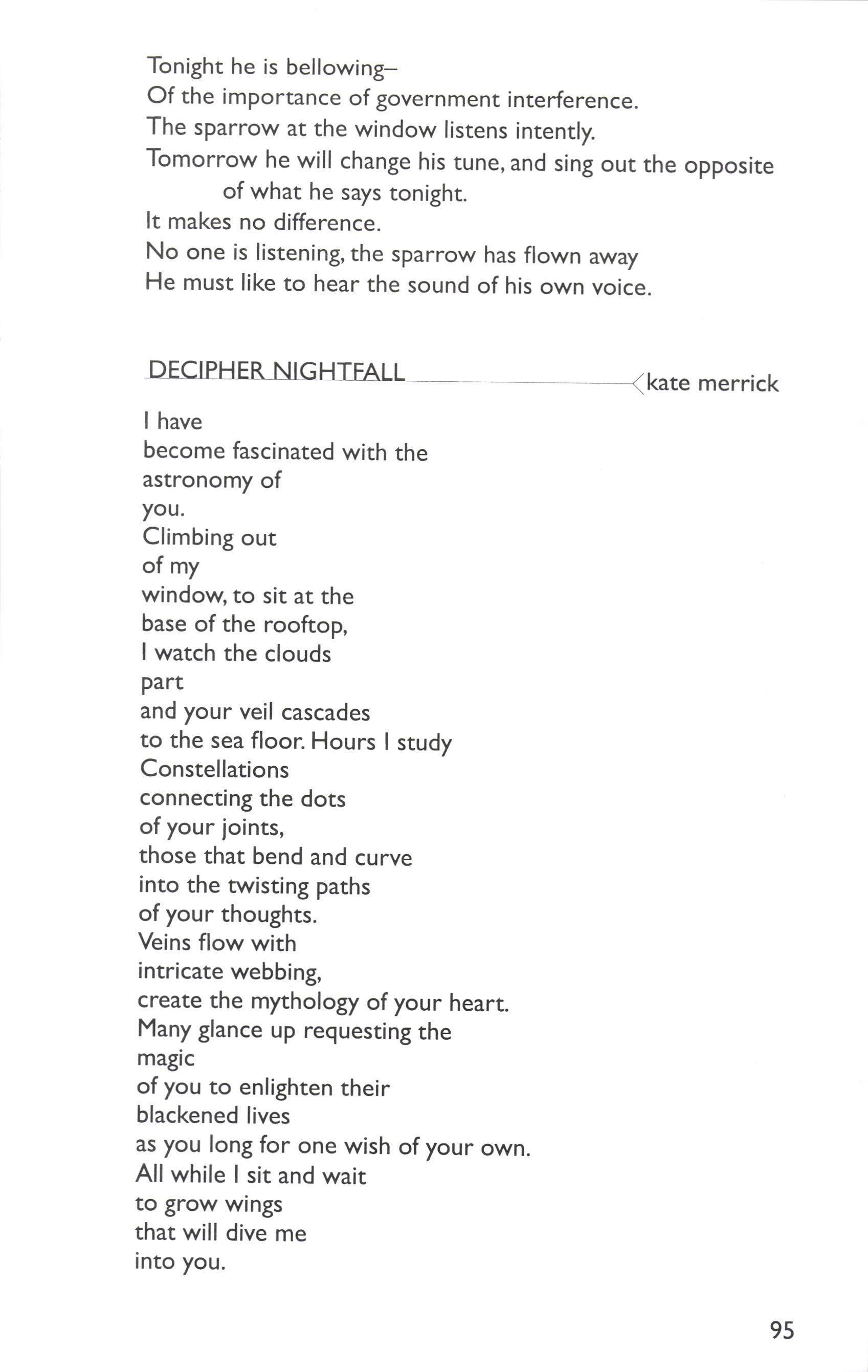 64 untitled 00 65 her list 65 remembrance 66 struggles 66 struggles 66 struggles 69 pyroflies 70 writer's block... 73 this is the story 74 hummingbird 74 afteri again 75 I stepped on an ant... 76 child's play 78 stiletto dreams 78 where I am from 79 losing pride 80 shotgun 80 keo's plea 8l leaves 82 single flower 82 thanks for giving me... 83 I love how the rain falls 84 long and lean 85 daughter of earth 89 women 89 cloak 90 here I sit 90 elevated 9l children 92 fade to black 93 sun porch sestina 94 he must like... 95 decipher nightfall