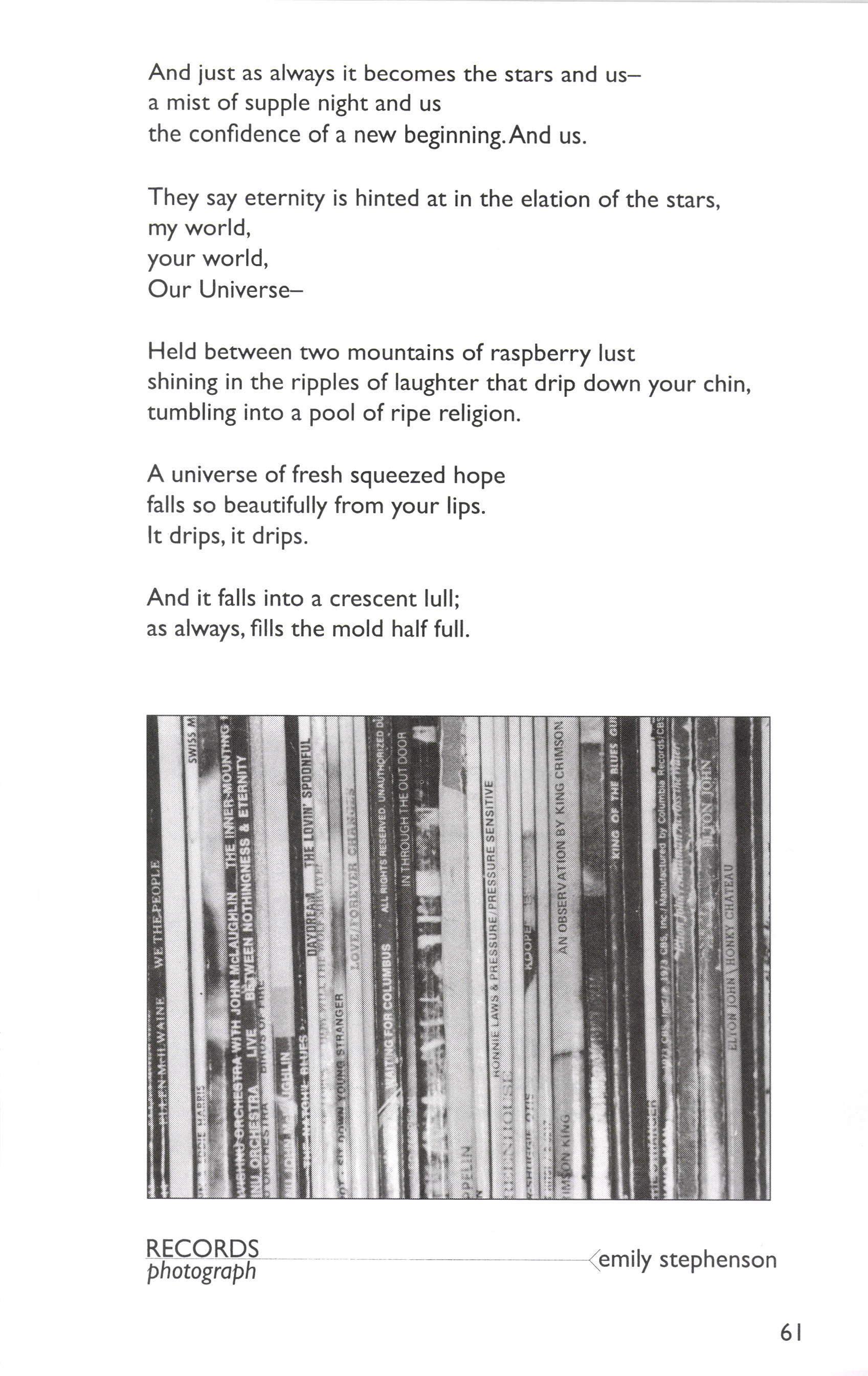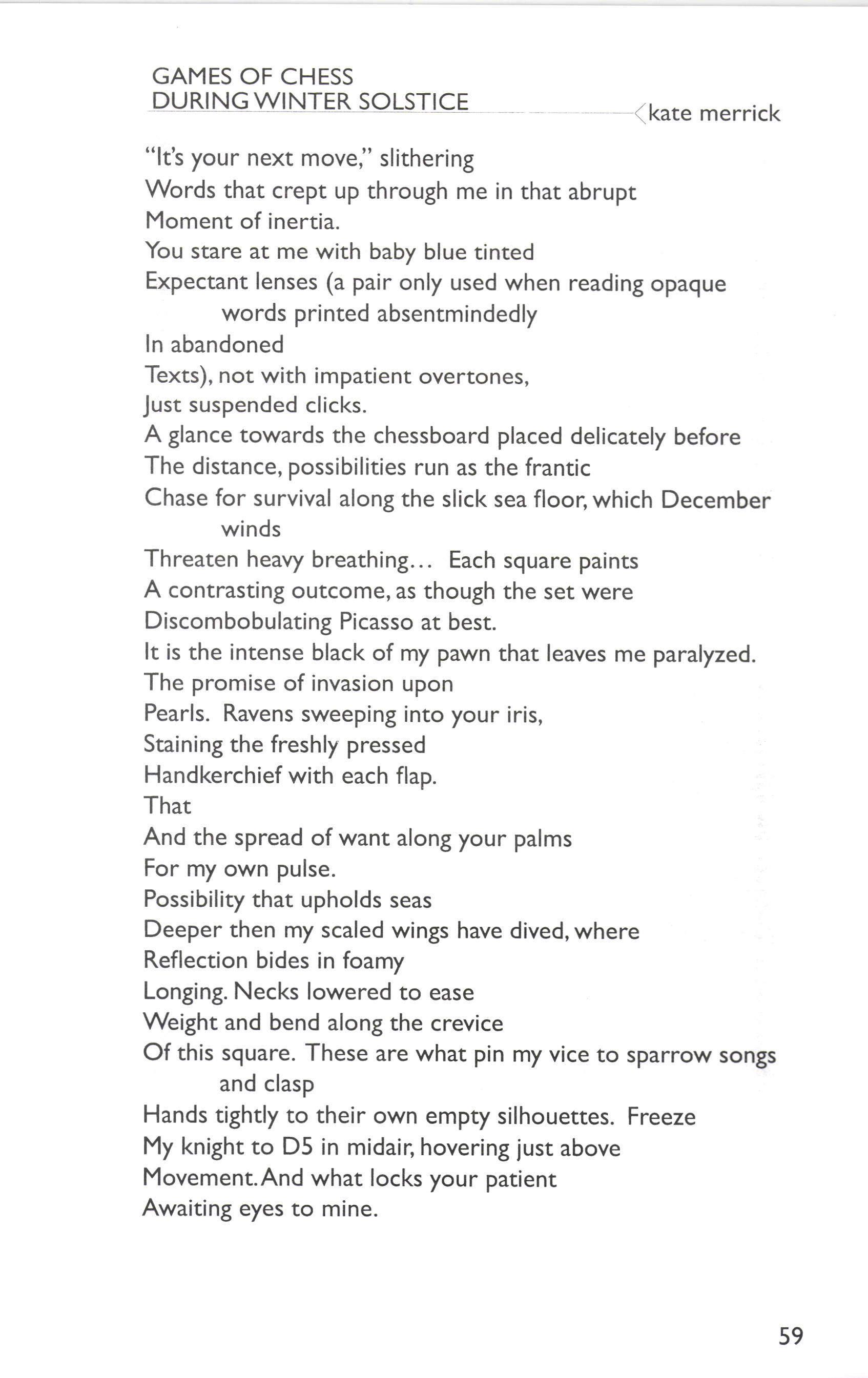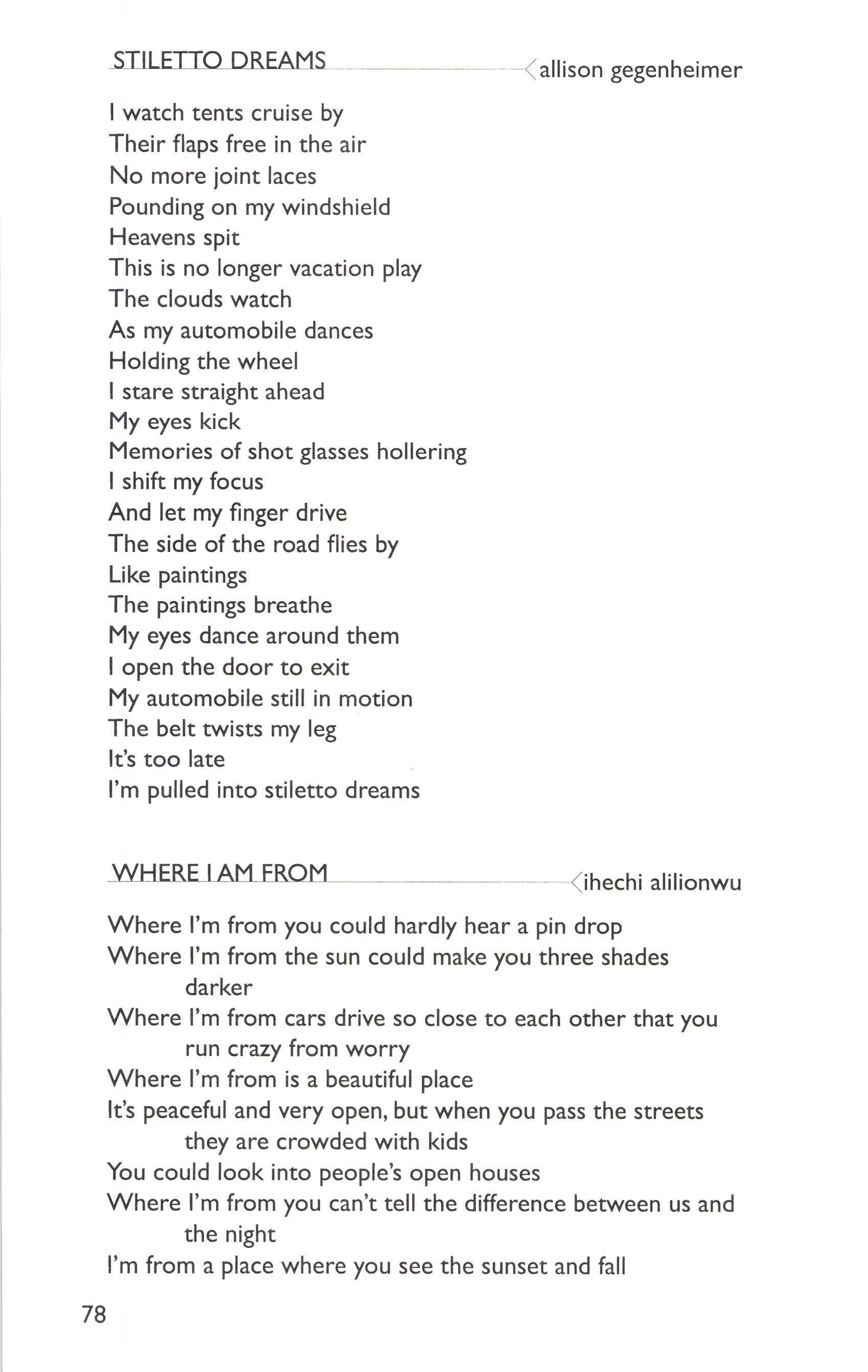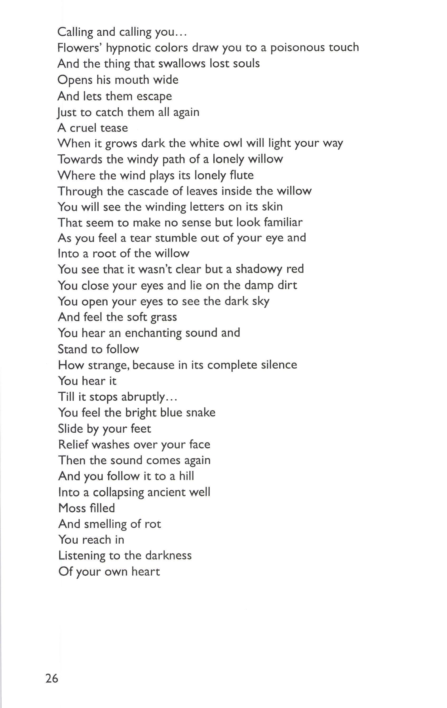 64 untitled 00 65 her list 65 remembrance 66 struggles 66 struggles 66 struggles 69 pyroflies 70 writer's block... 73 this is the story 74 hummingbird 74 afteri again 75 I stepped on an ant... 76 child's play 78 stiletto dreams 78 where I am from 79 losing pride 80 shotgun 80 keo's plea 8l leaves 82 single flower 82 thanks for giving me... 83 I love how the rain falls 84 long and lean 85 daughter of earth 89 women 89 cloak 90 here I sit 90 elevated 9l children 92 fade to black 93 sun porch sestina 94 he must like... 95 decipher nightfall