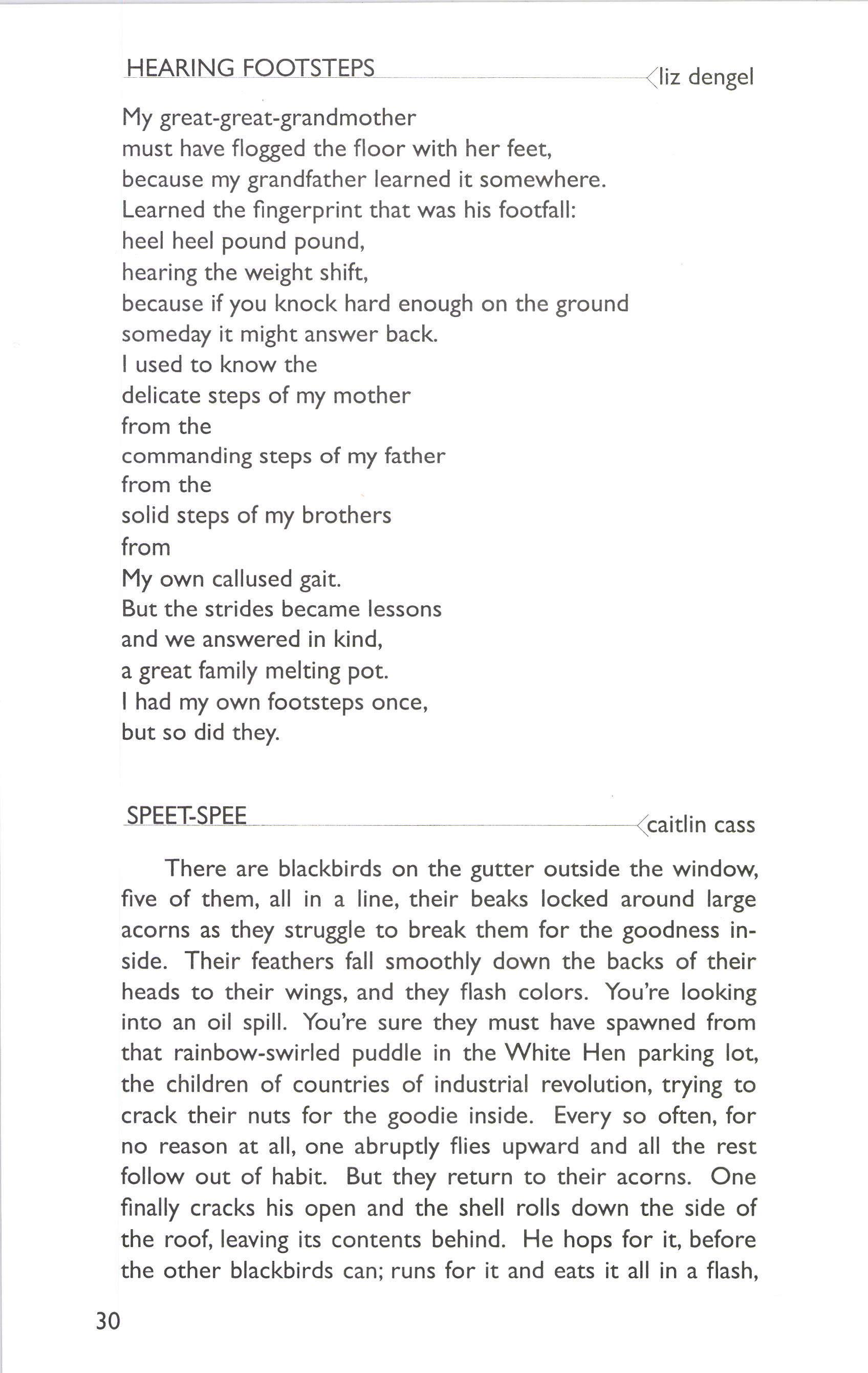 liz dengel 30 hearing footsteps caitlin cass tim sullivan billy jackson grant buchowicz ken javor max taylor joe petrone . liz polk kristina adamczewski andrea healy nick butterfield una delic ariel herman elise putnam elena levenson michelle doman david gilmer emily white jo ellyn walker meg prossnitz ale x mufson katherine parker jesse randall meaghan garyey claude bonaparte fred henzel sarah schwartz kate merrick fulia taylor karina benloucif emily stephenson kate gavriel elena levenson peter boyer