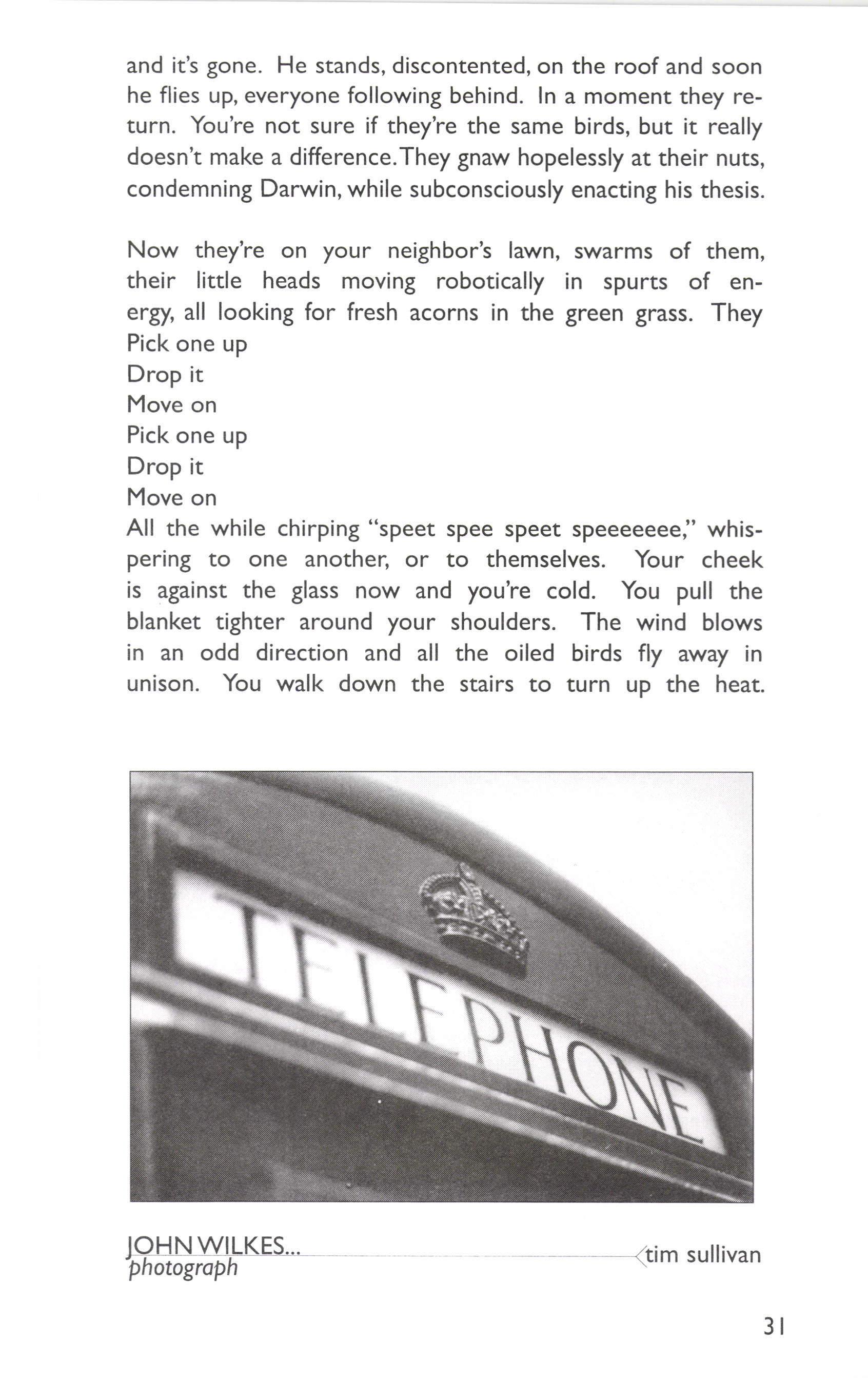 He must like to hear the sound of his own voice. Resonating throughout the room, No one listening but maybe a lost sParrow at the window. He drones on and on, relentlessly, Mumbli ng high praises, reprimanding unsuspecti n8 passersby. Maybe he likes to hear the sound of his own voice. His audience was not always an impenetrable wall, We used to pay great heed to the words he uttered. But now no one is listening, excePt, perhaps, a sParrow at the window. We grew accustomed to his tricks and gags. His insecurities played out by over-embellished feats, grown greater with each telling. Yet he has continued to talk. He must like the sound of his own voice.