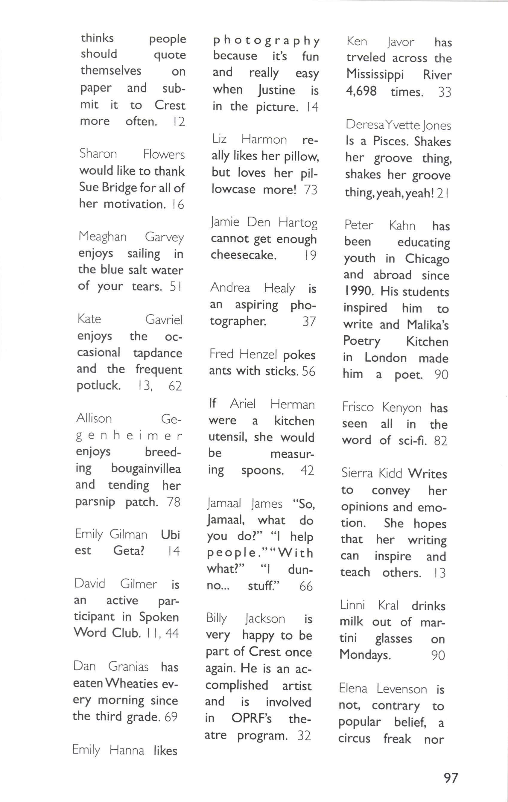Billy Jackon is very h"ppy to be part of Crest once again. He is an accomplished artist and is involved in OPRF's theatre program. 32