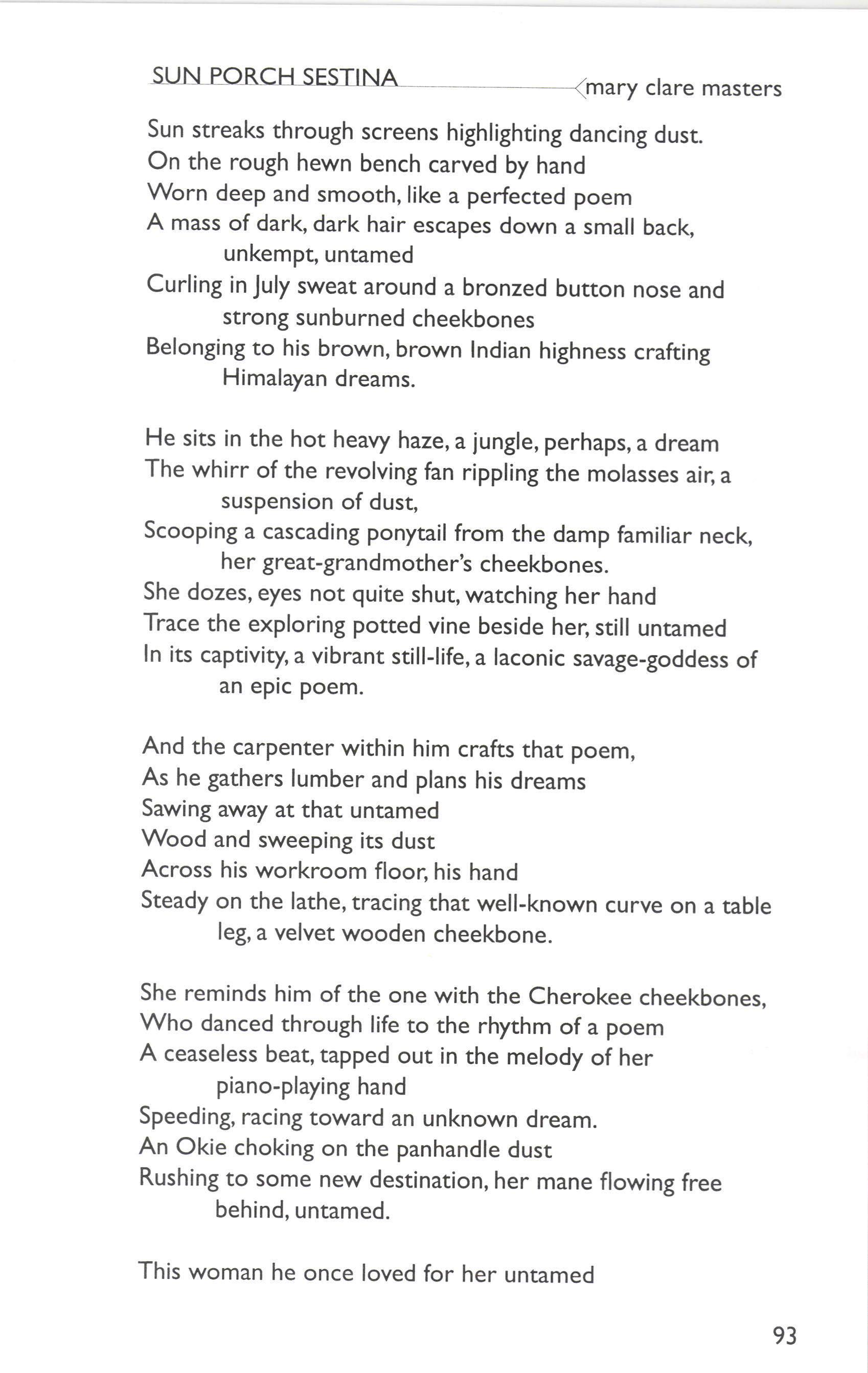 And he rouses his lndian princess with his war-storied hand, She, sepia and sleeping, yet untamed Lost in inherited dreams.