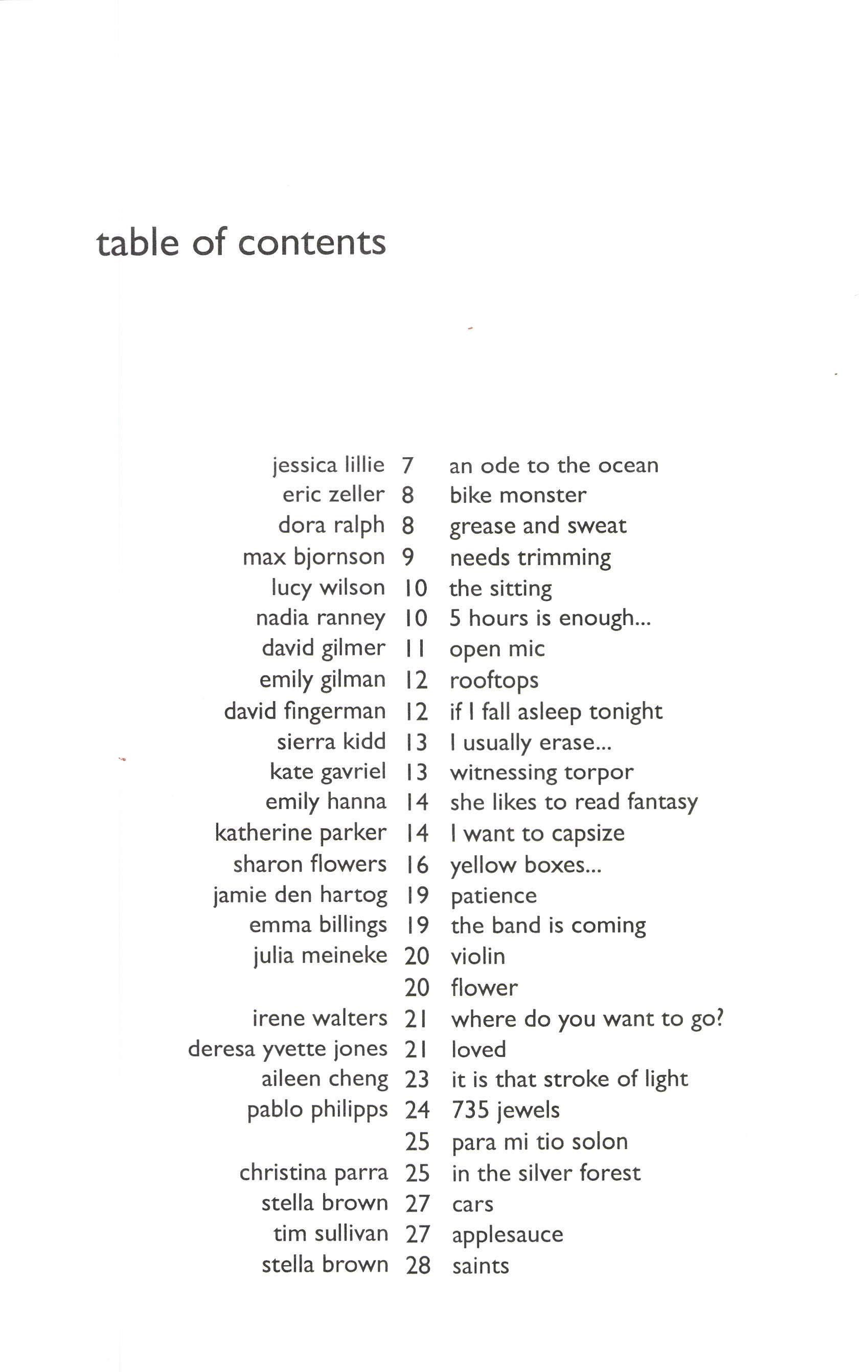 jessica lillie 7 eric zeller 8 dora ralph 8 max bjornson 9 lucy wilson l0 nadia ranney l0 david gilmer I I emily gilman l2 david fingerman 12 sierra kidd l3 kate gavriel l3 emily hanna l4 katherine parker l4 sharon flowers l6 jamie den hartog 19 emma billings l9 iulia meineke 20 20