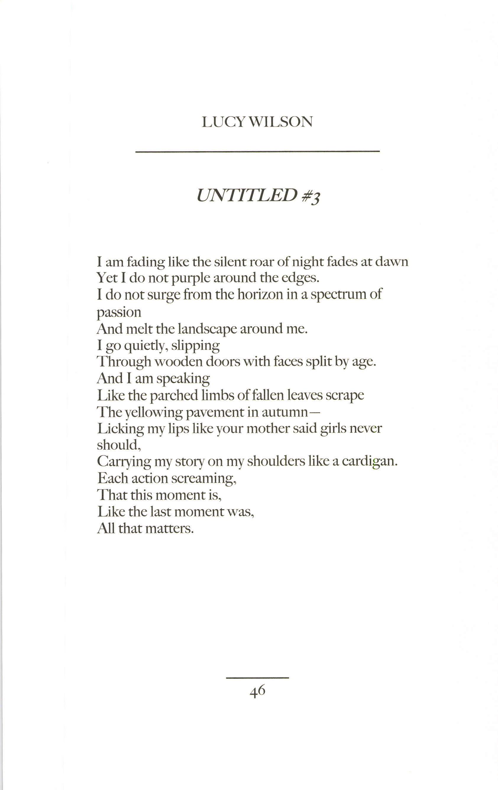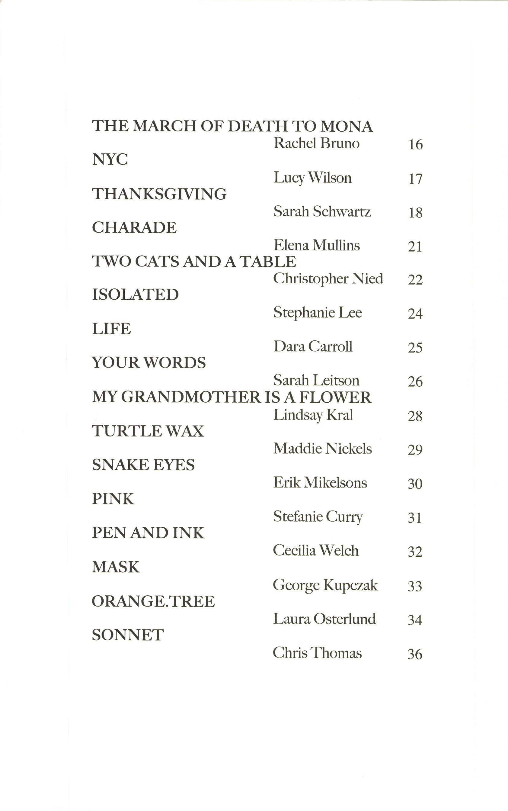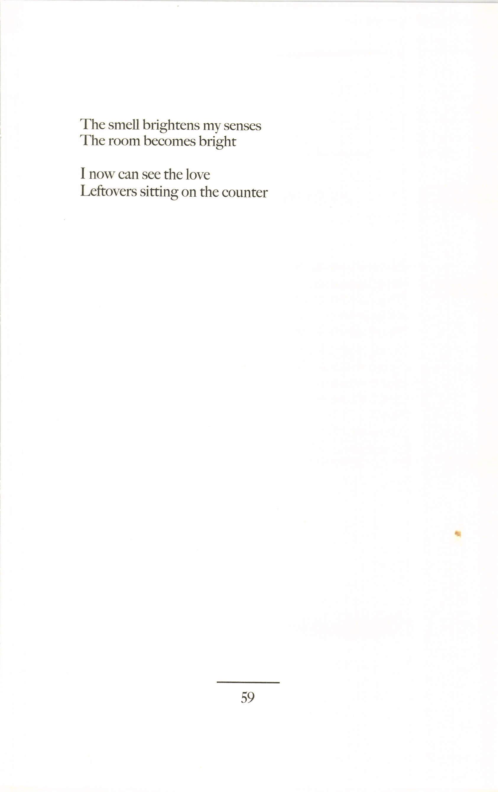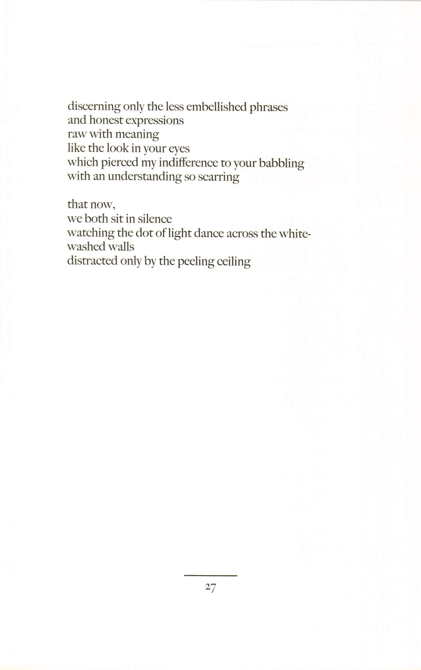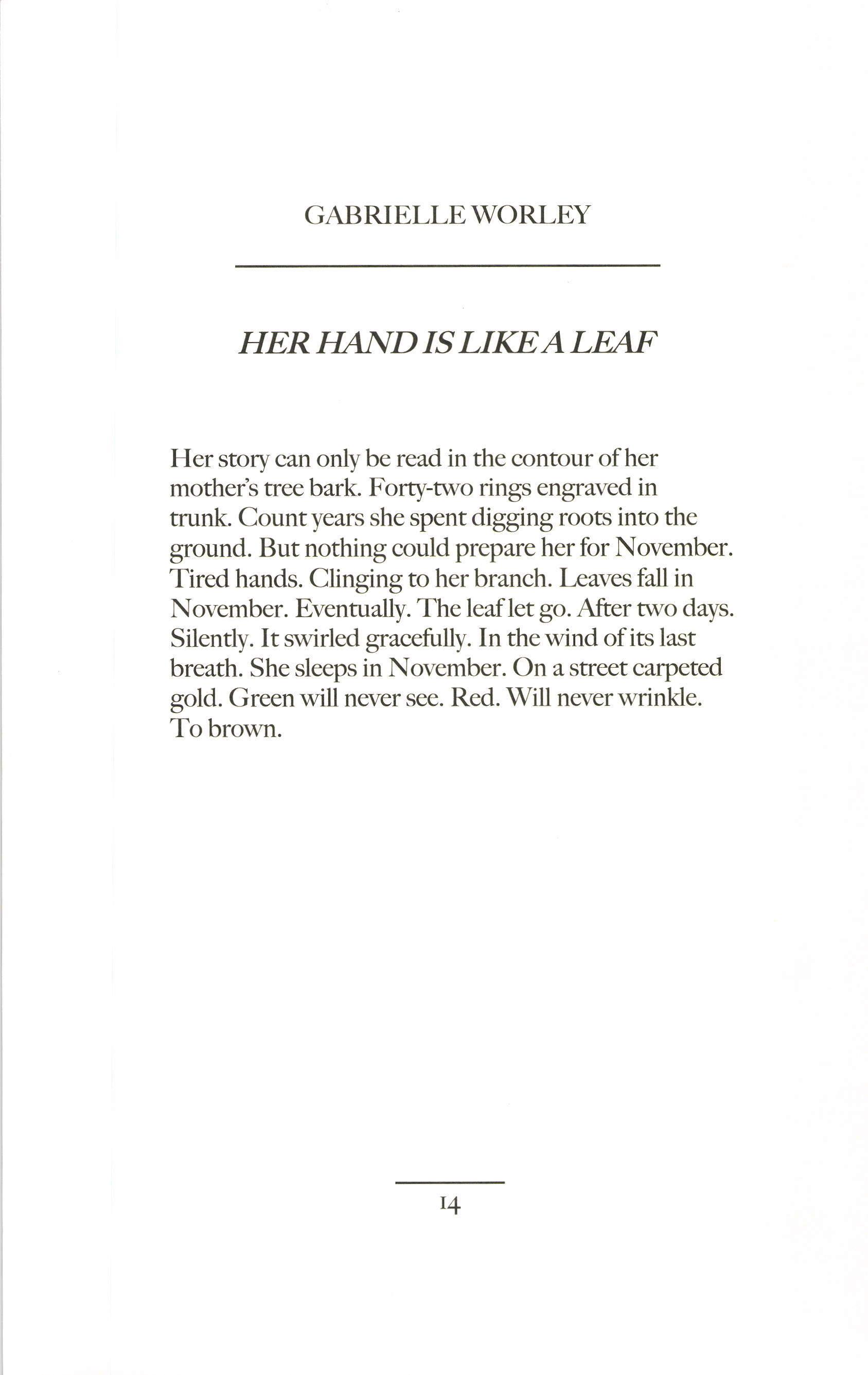 Her story can only be read in the contour of her mother's tree bark Forty-t'wo rings engraved in trunk Countyears she spentdigging roots into the ground. But nothing could prepare her for November. Tired hands. Clingingto herbranch. Iravesfall in November. Eventually. The leaf let go. After nvo days. Silently. It swirled gracefully. In thewind of its last breath. She sleeps in November. On a street carpeted gold. Greenwill never see. Red. Will neverwrinkle. To bror,vn.