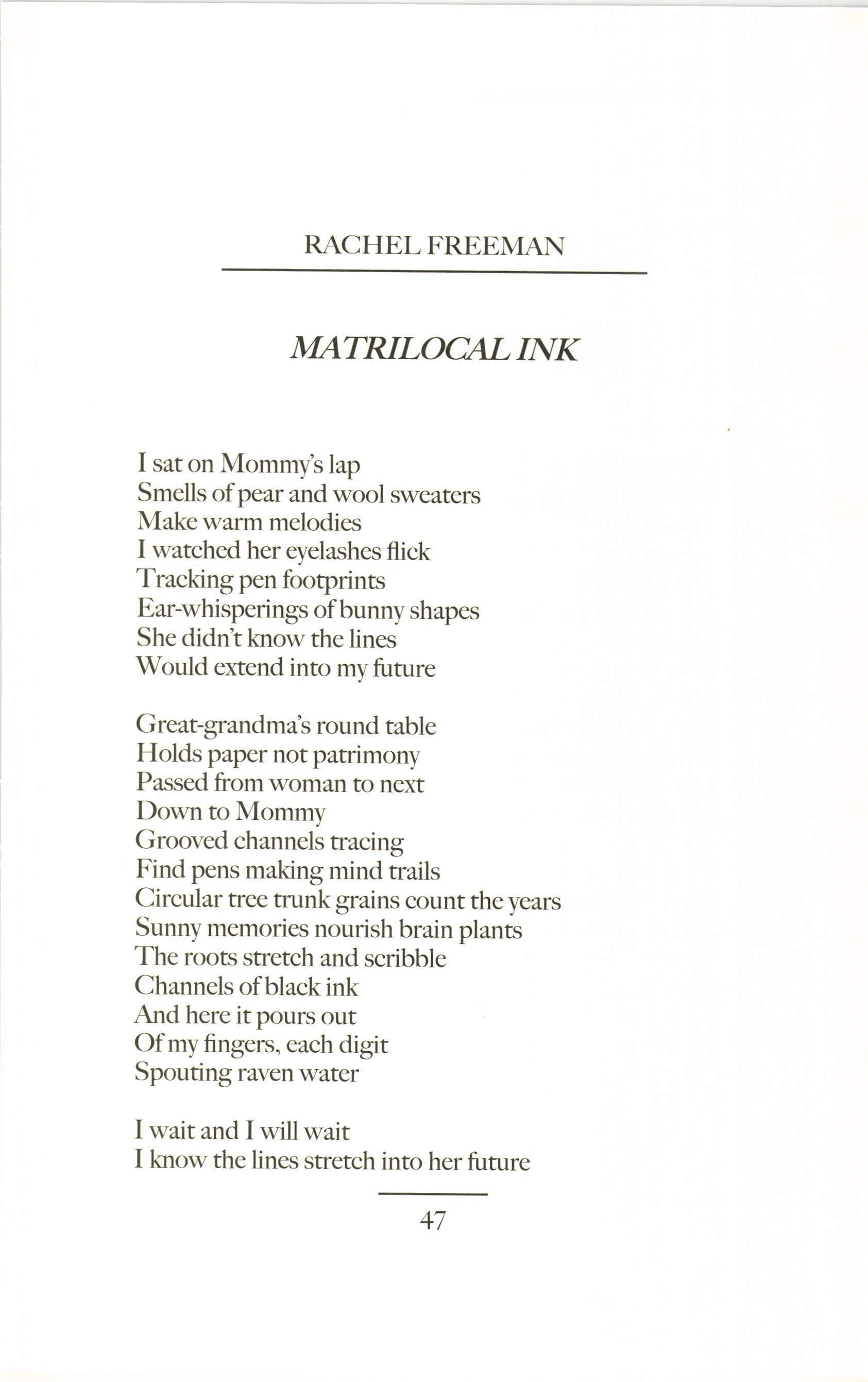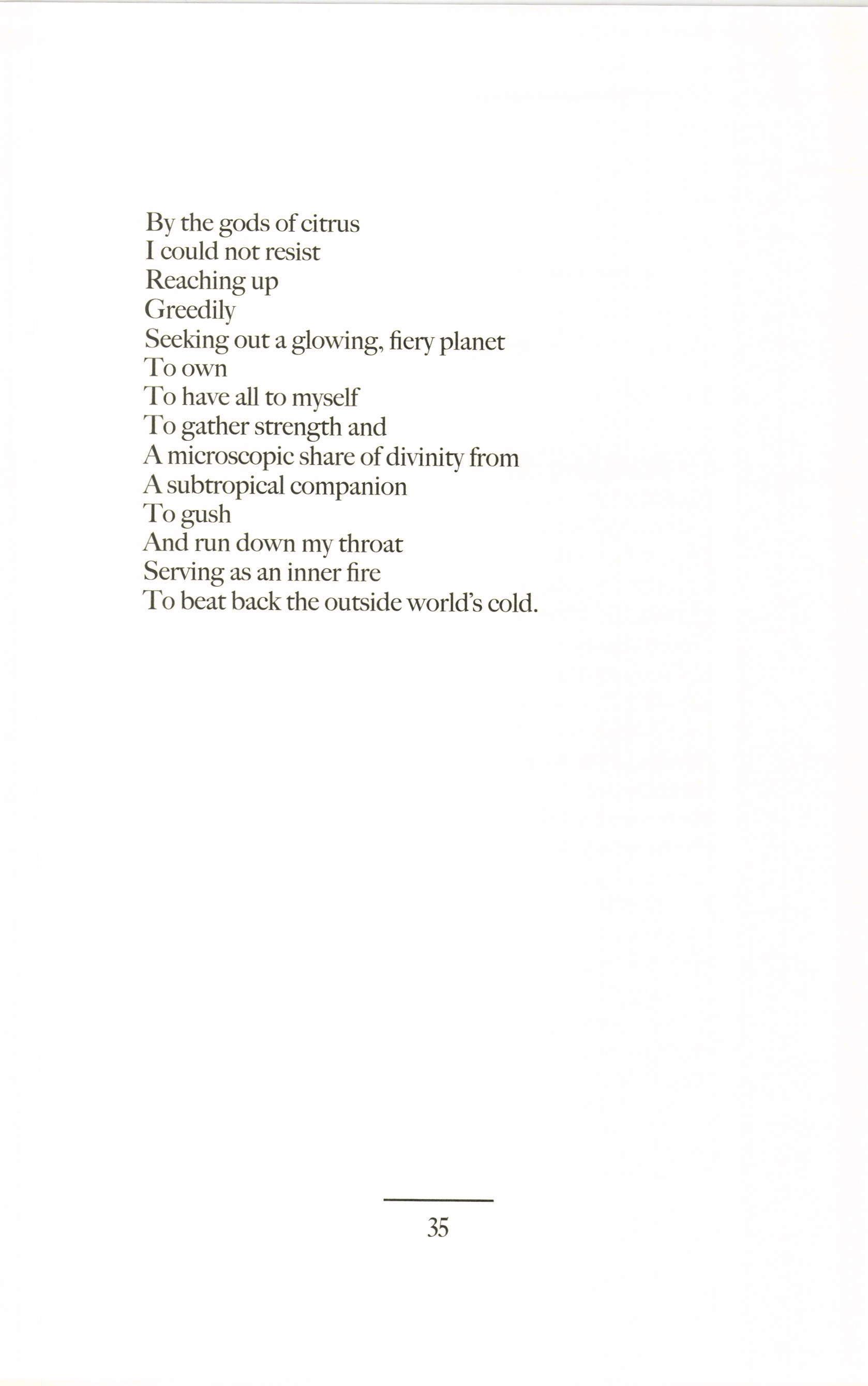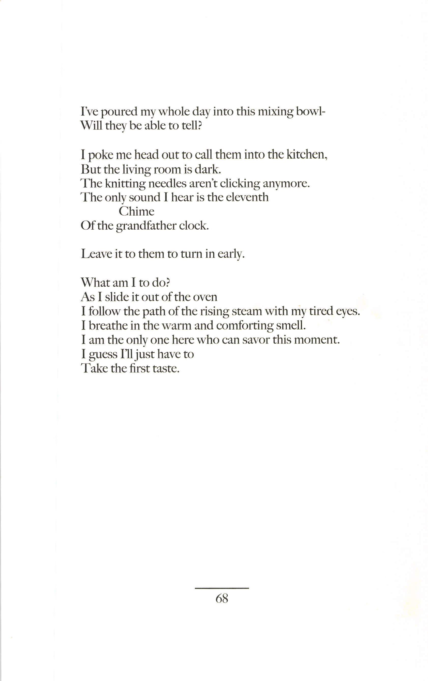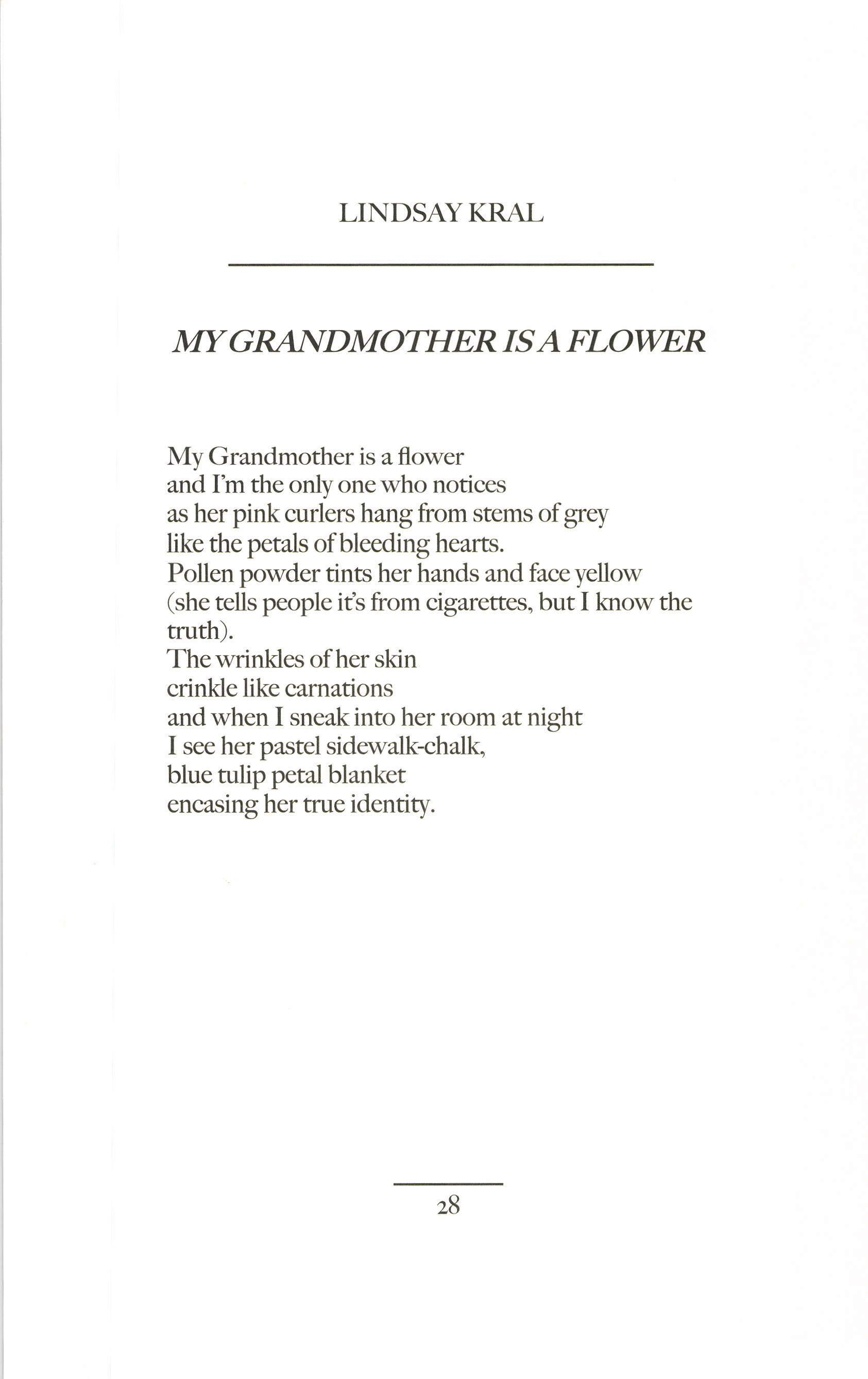 Her story can only be read in the contour of her mother's tree bark Forty-t'wo rings engraved in trunk Countyears she spentdigging roots into the ground. But nothing could prepare her for November. Tired hands. Clingingto herbranch. Iravesfall in November. Eventually. The leaf let go. After nvo days. Silently. It swirled gracefully. In thewind of its last breath. She sleeps in November. On a street carpeted gold. Greenwill never see. Red. Will neverwrinkle. To bror,vn.
