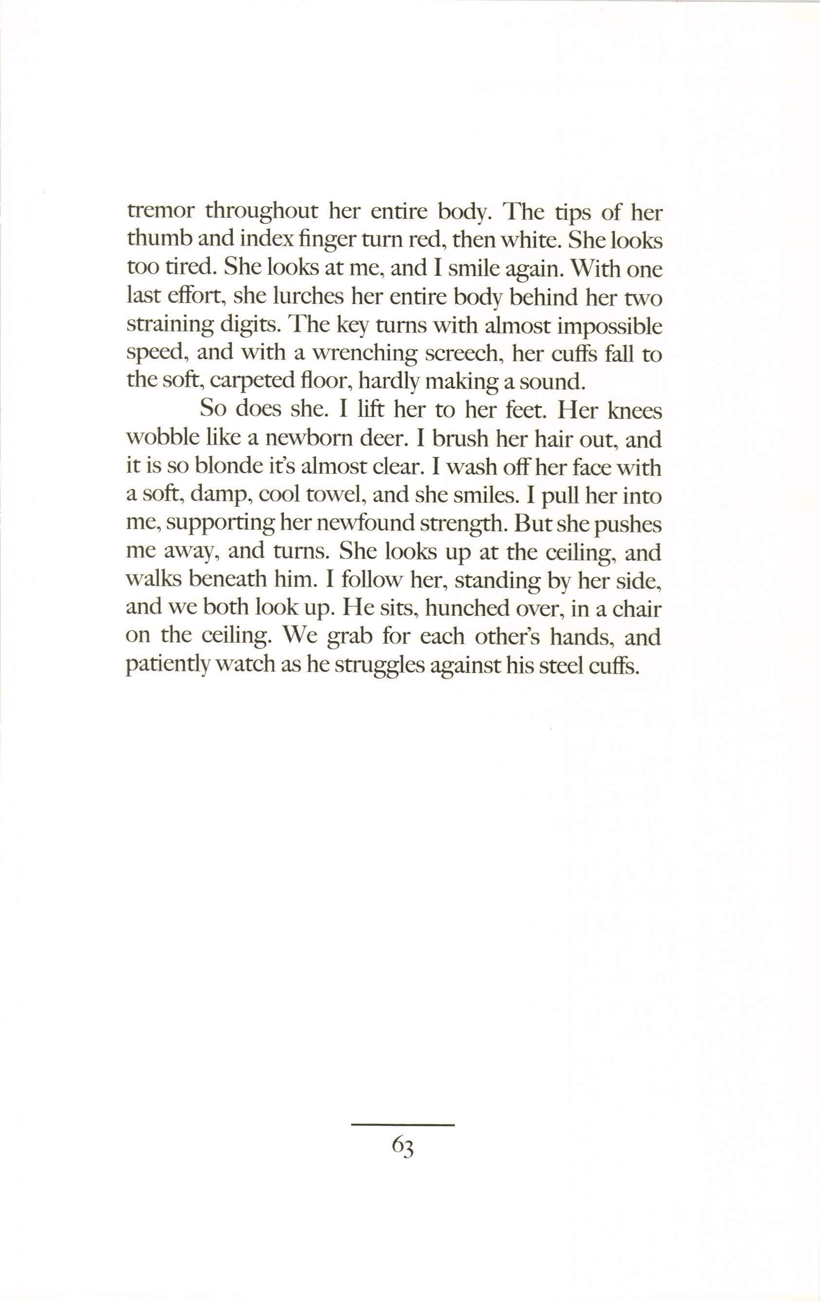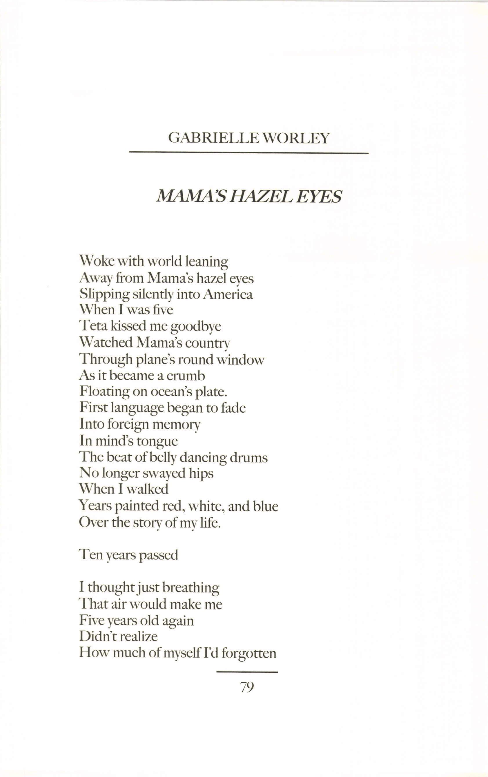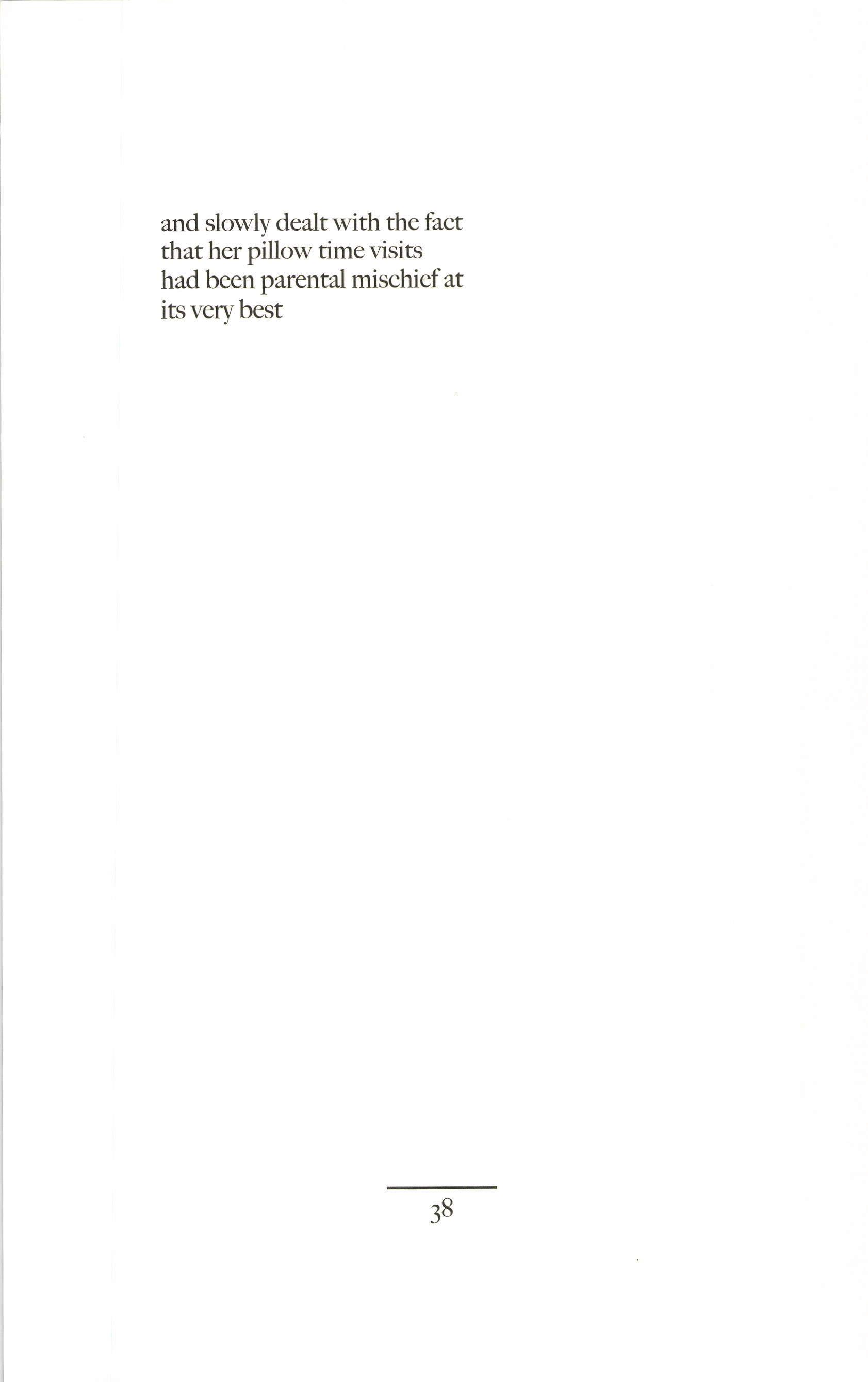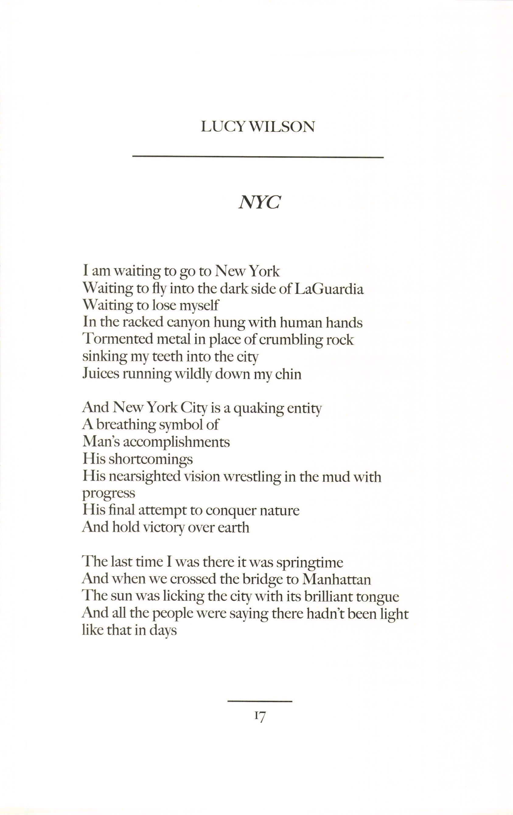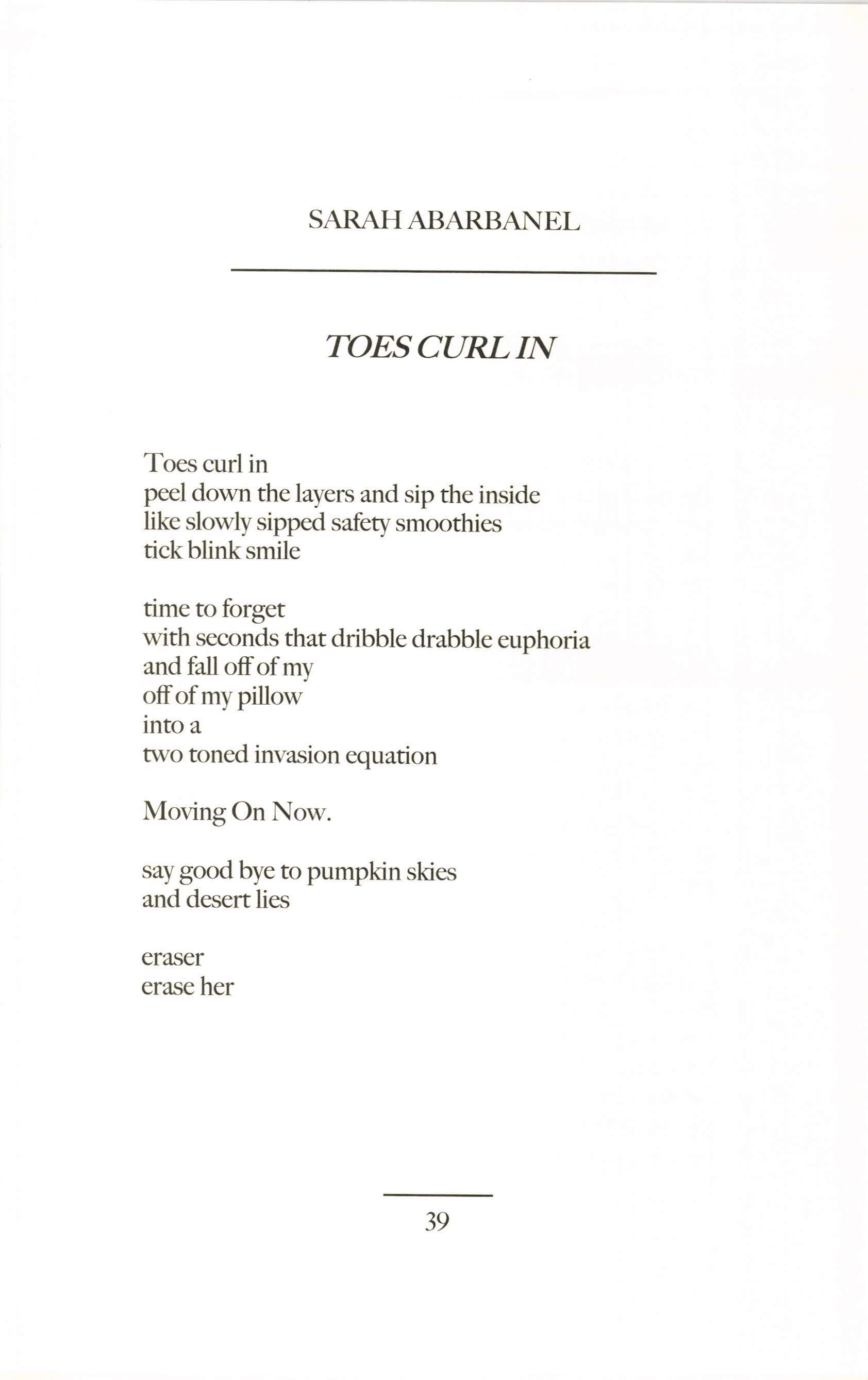 Her story can only be read in the contour of her mother's tree bark Forty-t'wo rings engraved in trunk Countyears she spentdigging roots into the ground. But nothing could prepare her for November. Tired hands. Clingingto herbranch. Iravesfall in November. Eventually. The leaf let go. After nvo days. Silently. It swirled gracefully. In thewind of its last breath. She sleeps in November. On a street carpeted gold. Greenwill never see. Red. Will neverwrinkle. To bror,vn.