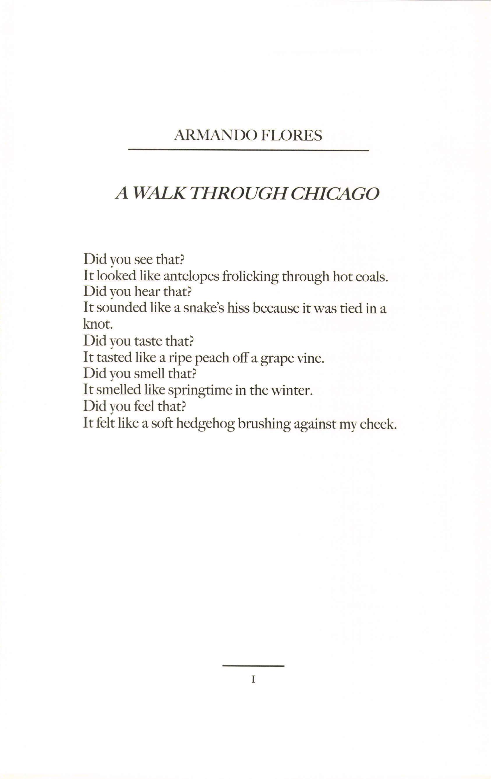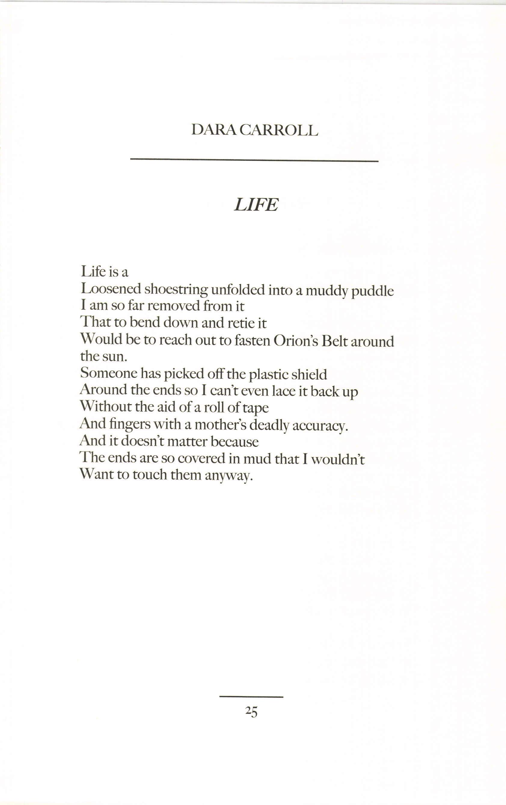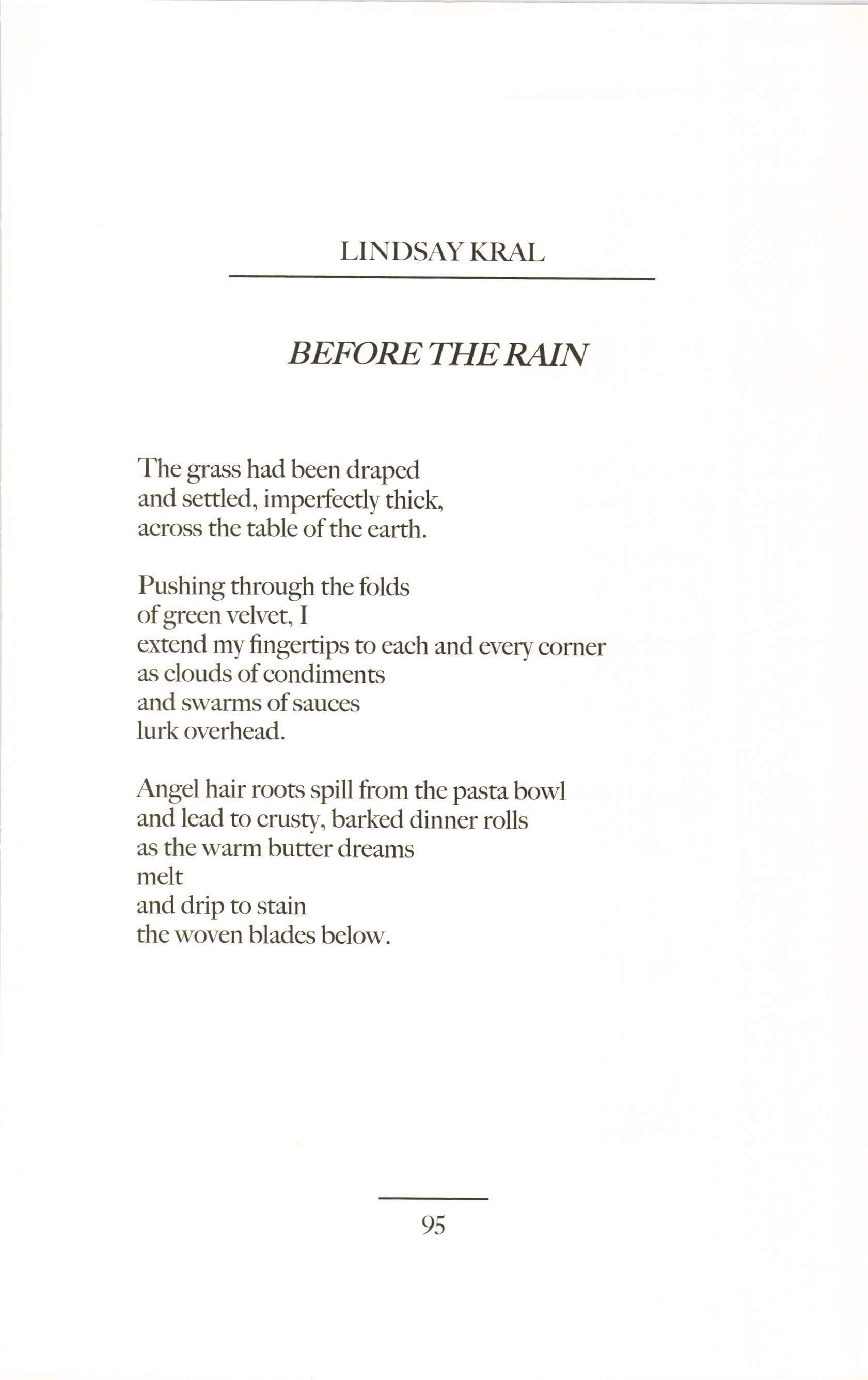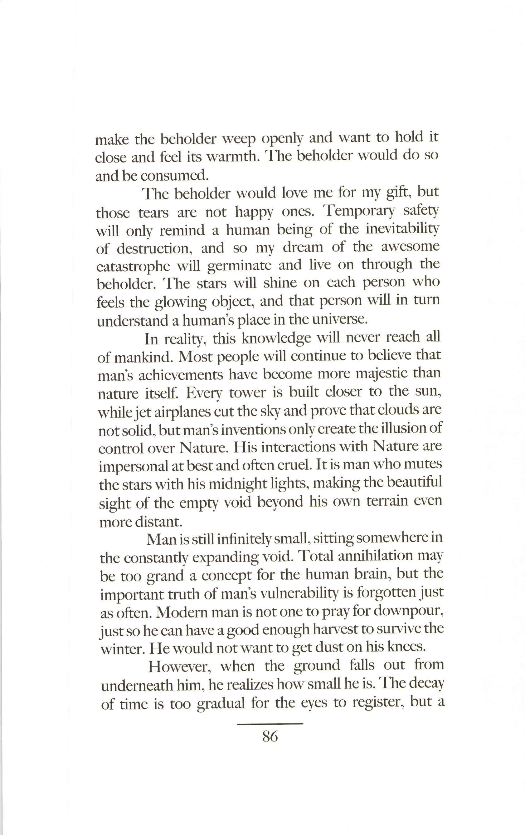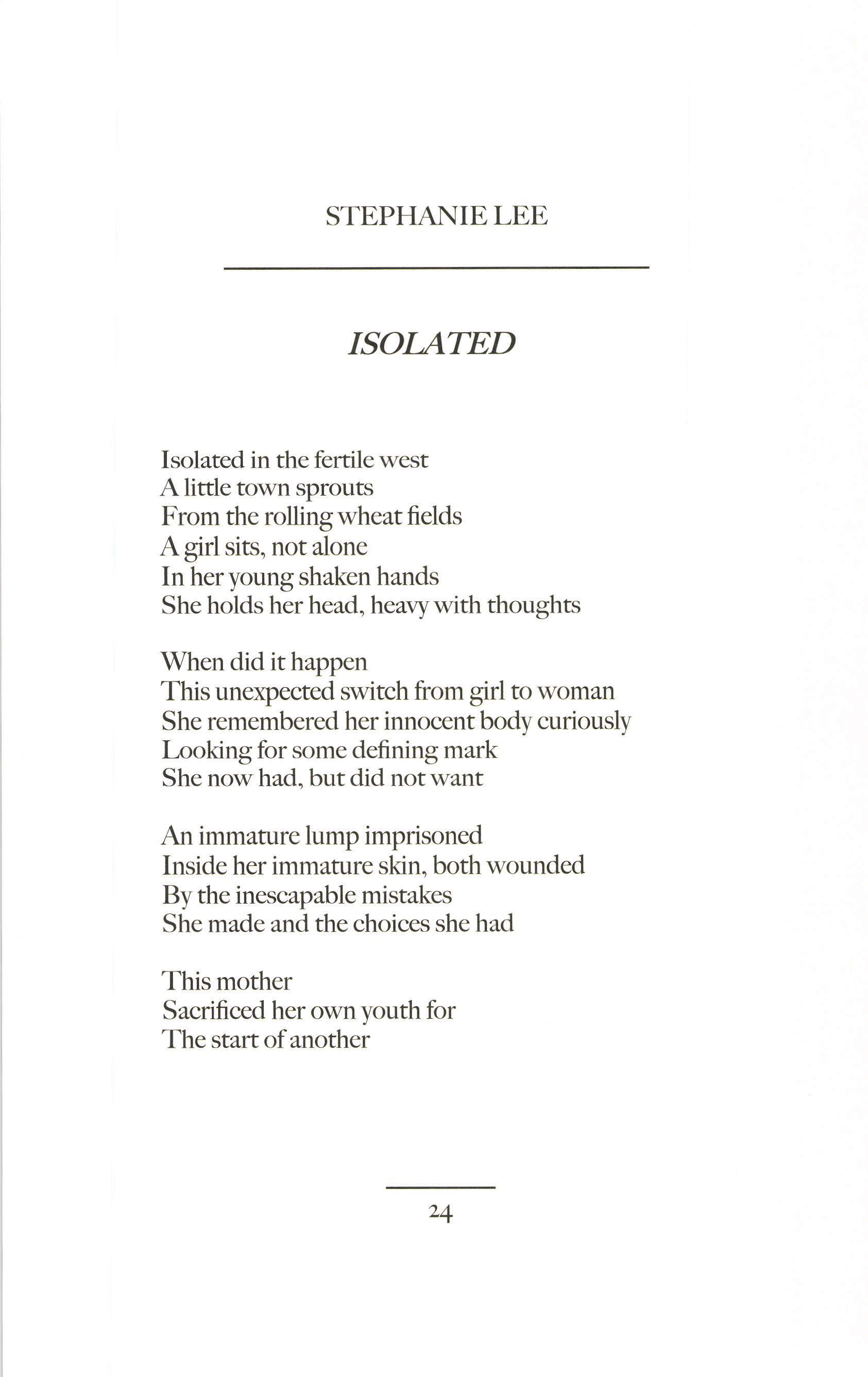 Her story can only be read in the contour of her mother's tree bark Forty-t'wo rings engraved in trunk Countyears she spentdigging roots into the ground. But nothing could prepare her for November. Tired hands. Clingingto herbranch. Iravesfall in November. Eventually. The leaf let go. After nvo days. Silently. It swirled gracefully. In thewind of its last breath. She sleeps in November. On a street carpeted gold. Greenwill never see. Red. Will neverwrinkle. To bror,vn.