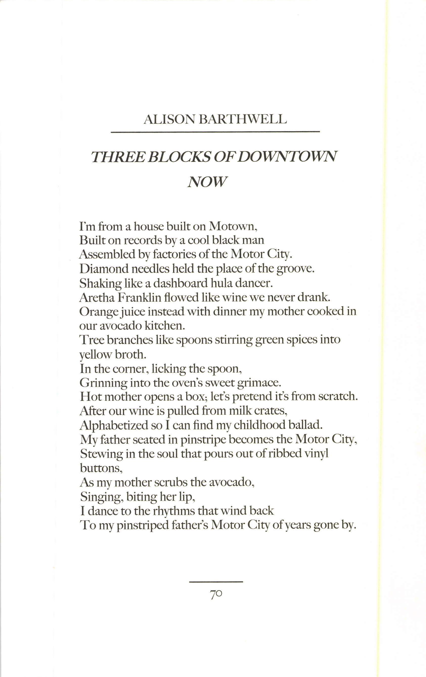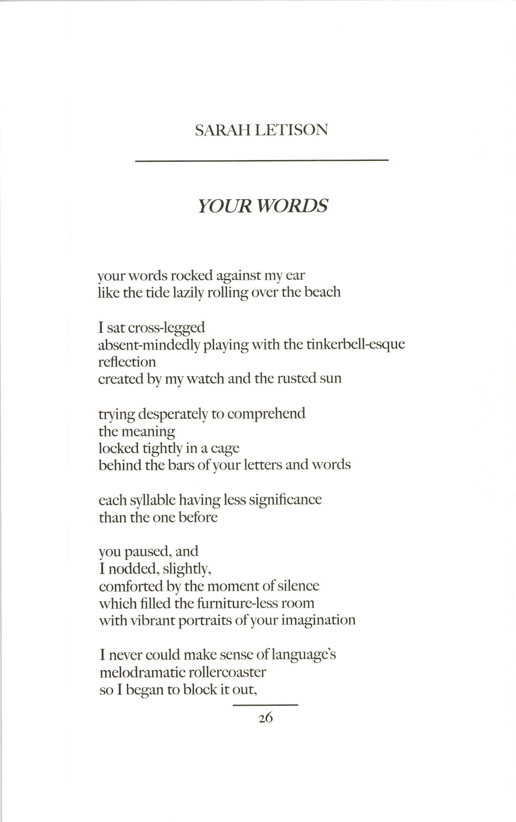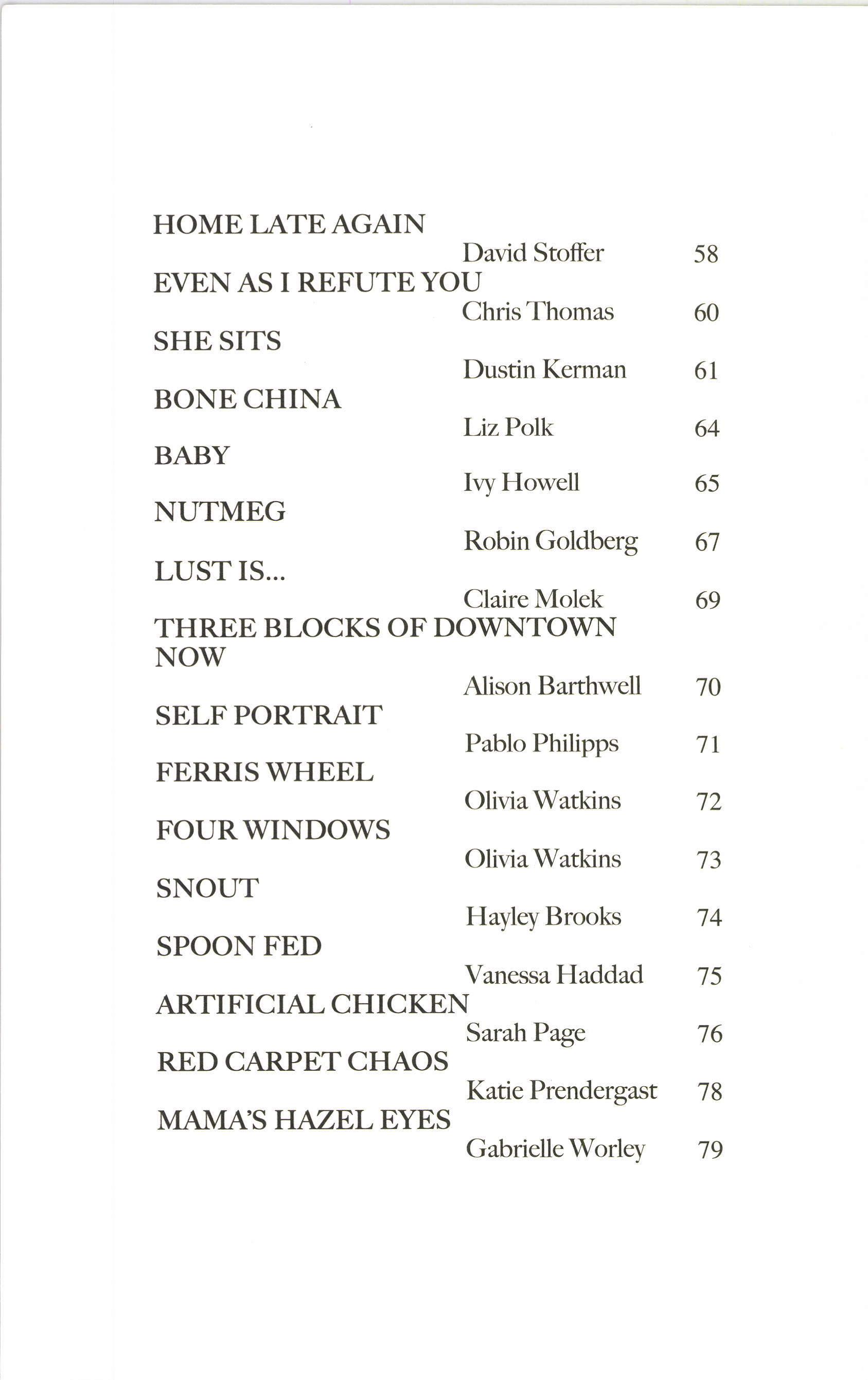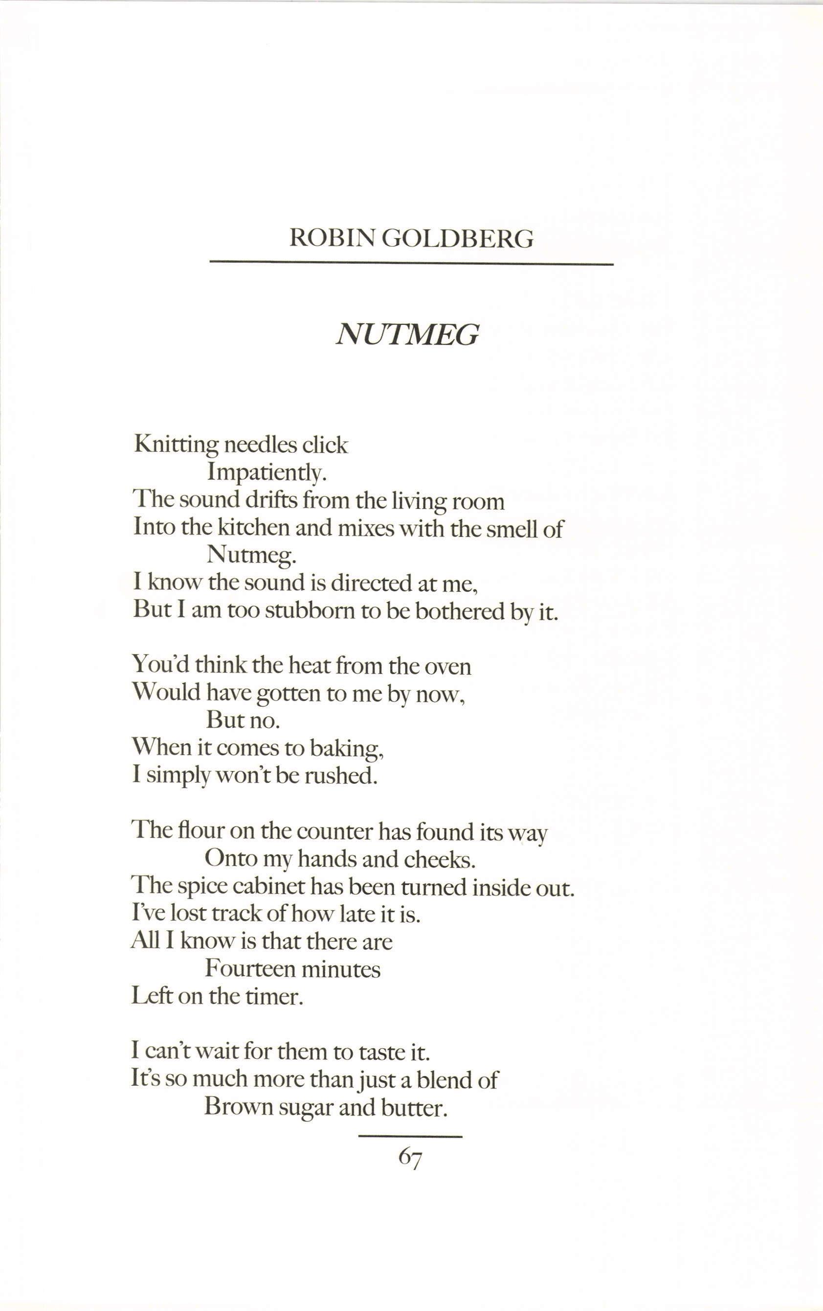 Her story can only be read in the contour of her mother's tree bark Forty-t'wo rings engraved in trunk Countyears she spentdigging roots into the ground. But nothing could prepare her for November. Tired hands. Clingingto herbranch. Iravesfall in November. Eventually. The leaf let go. After nvo days. Silently. It swirled gracefully. In thewind of its last breath. She sleeps in November. On a street carpeted gold. Greenwill never see. Red. Will neverwrinkle. To bror,vn.