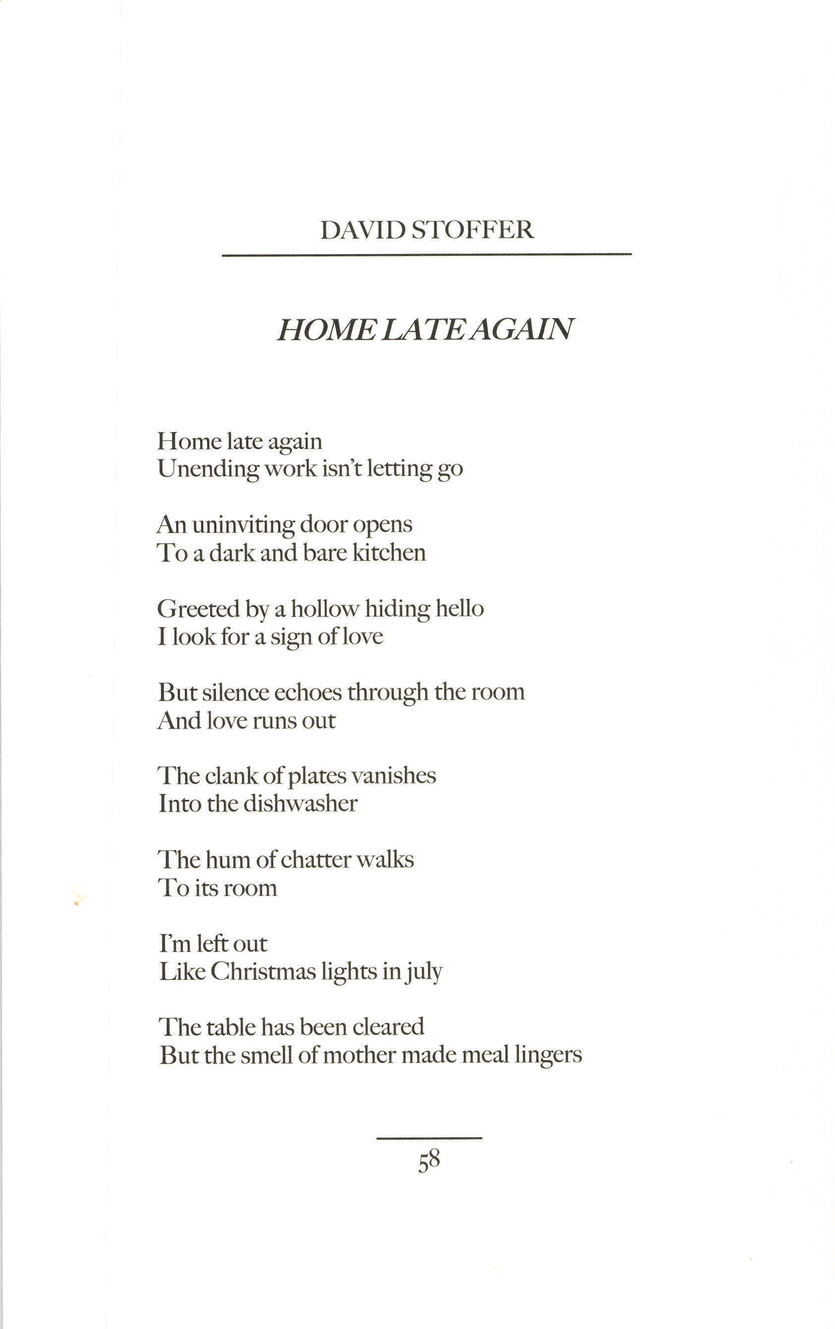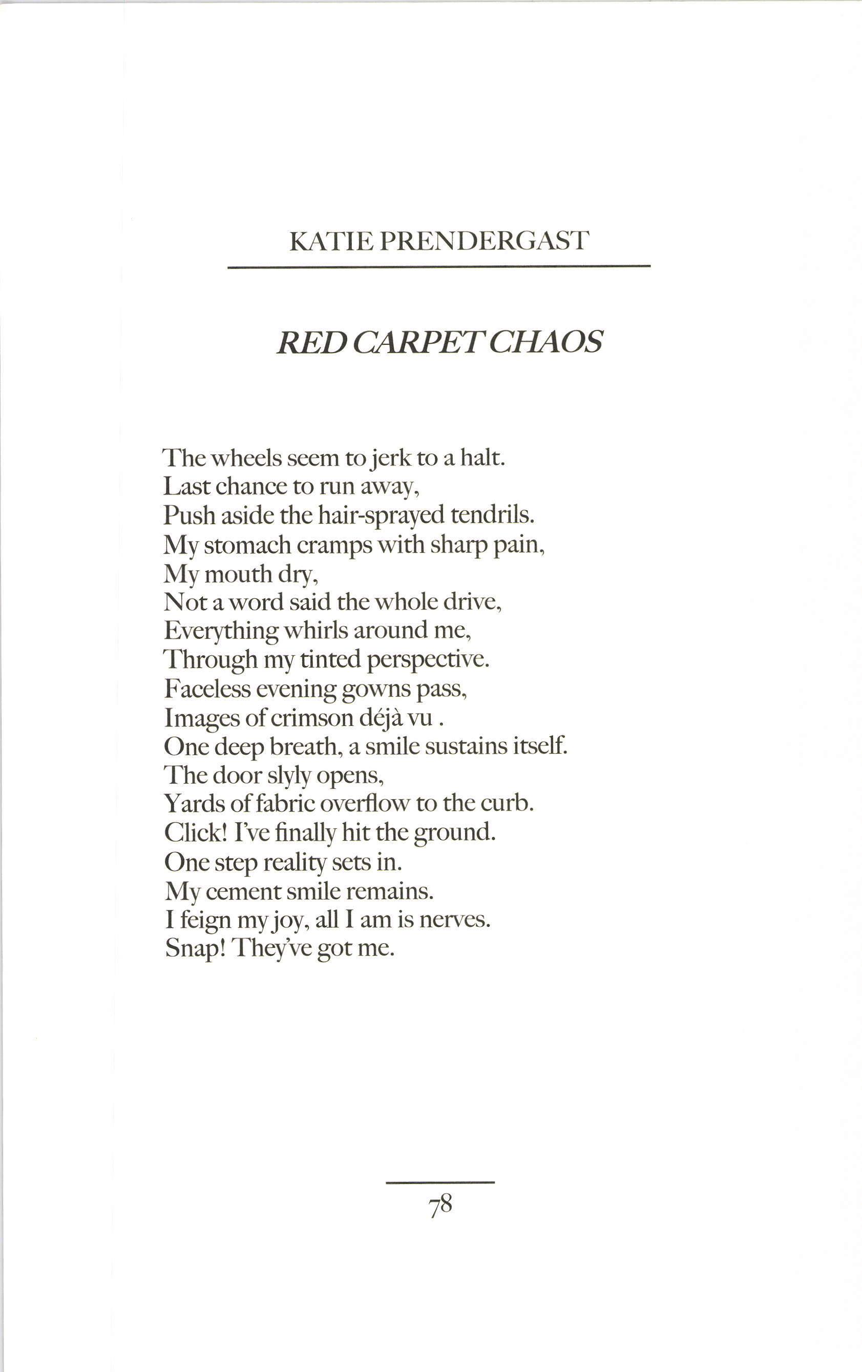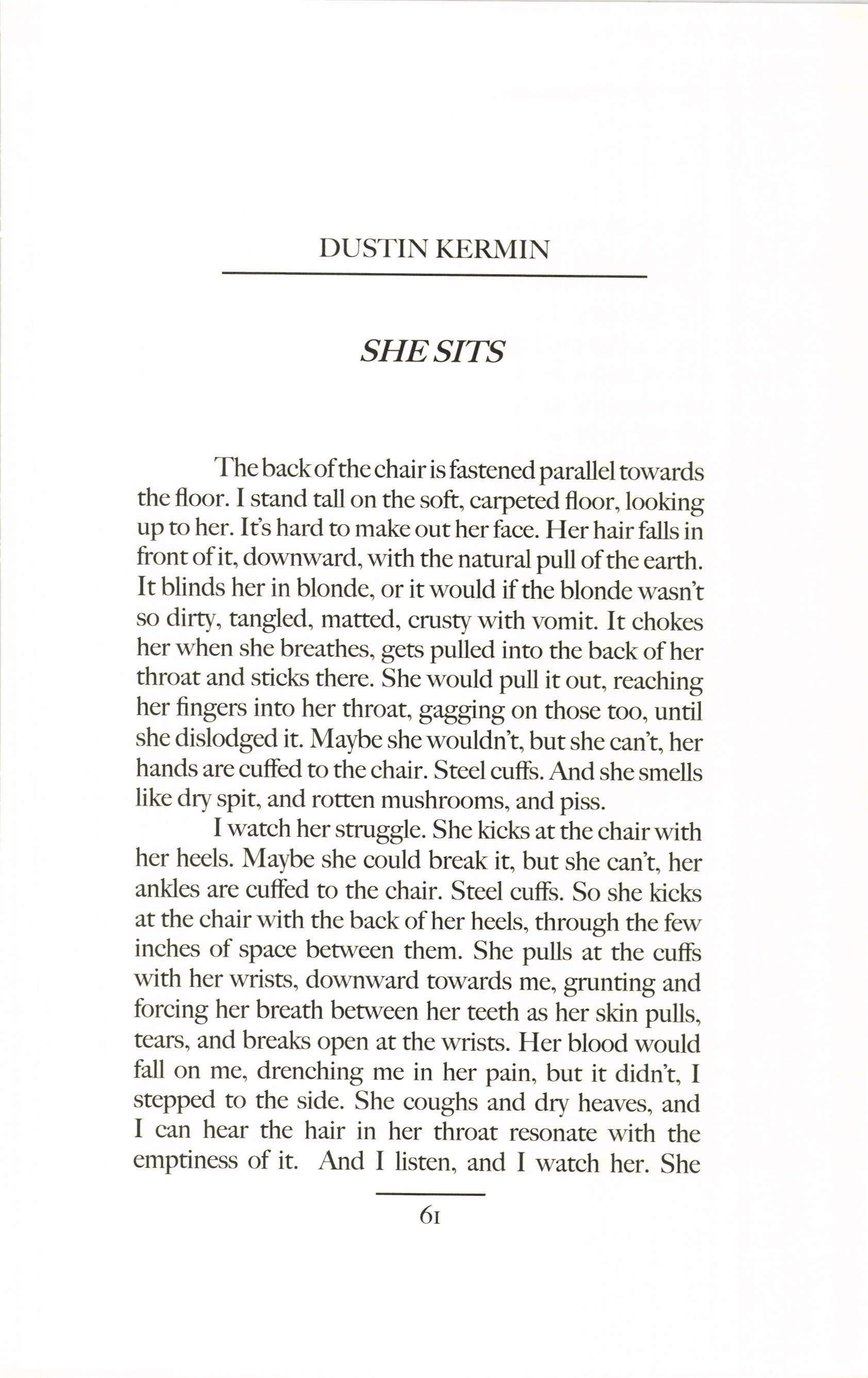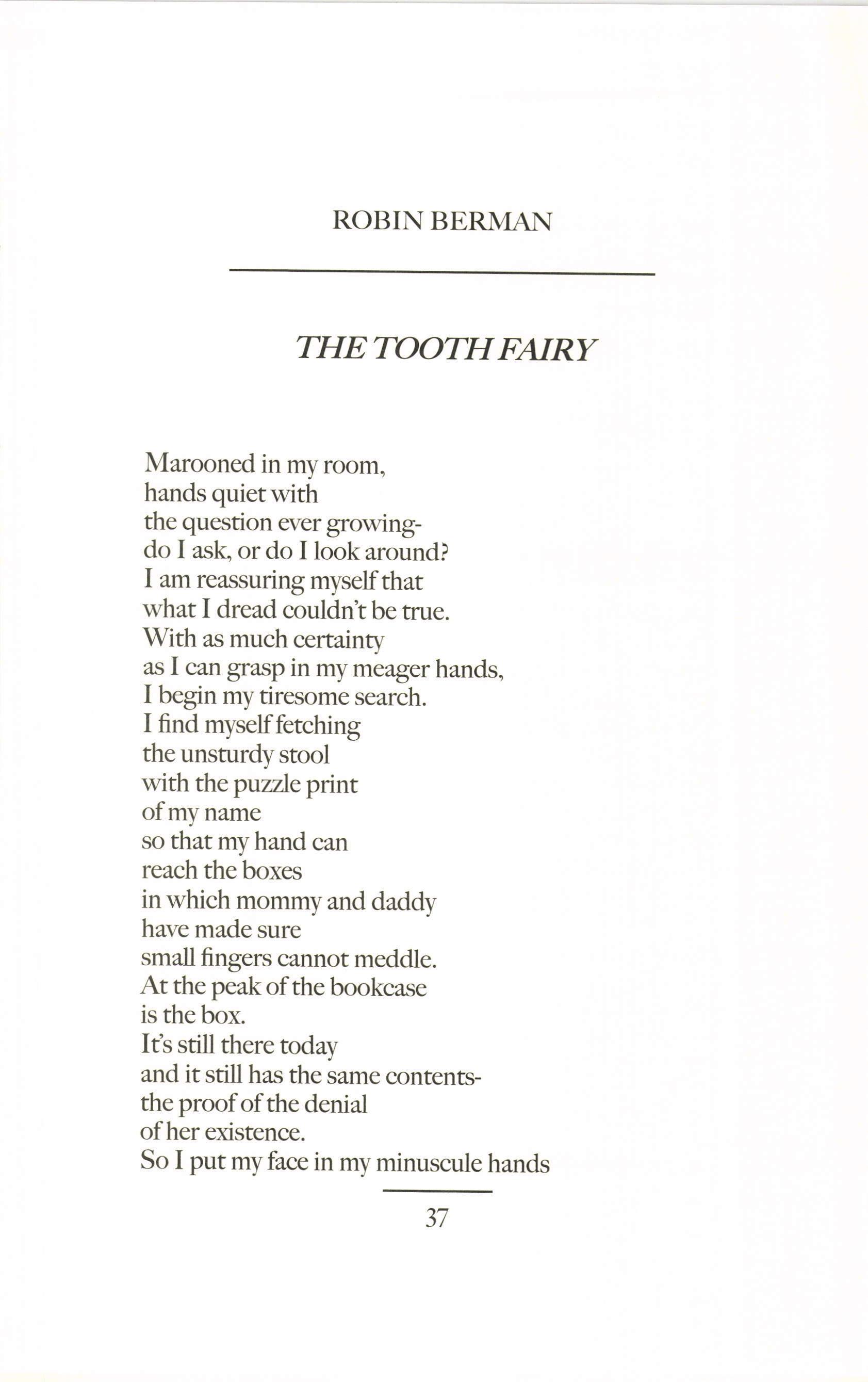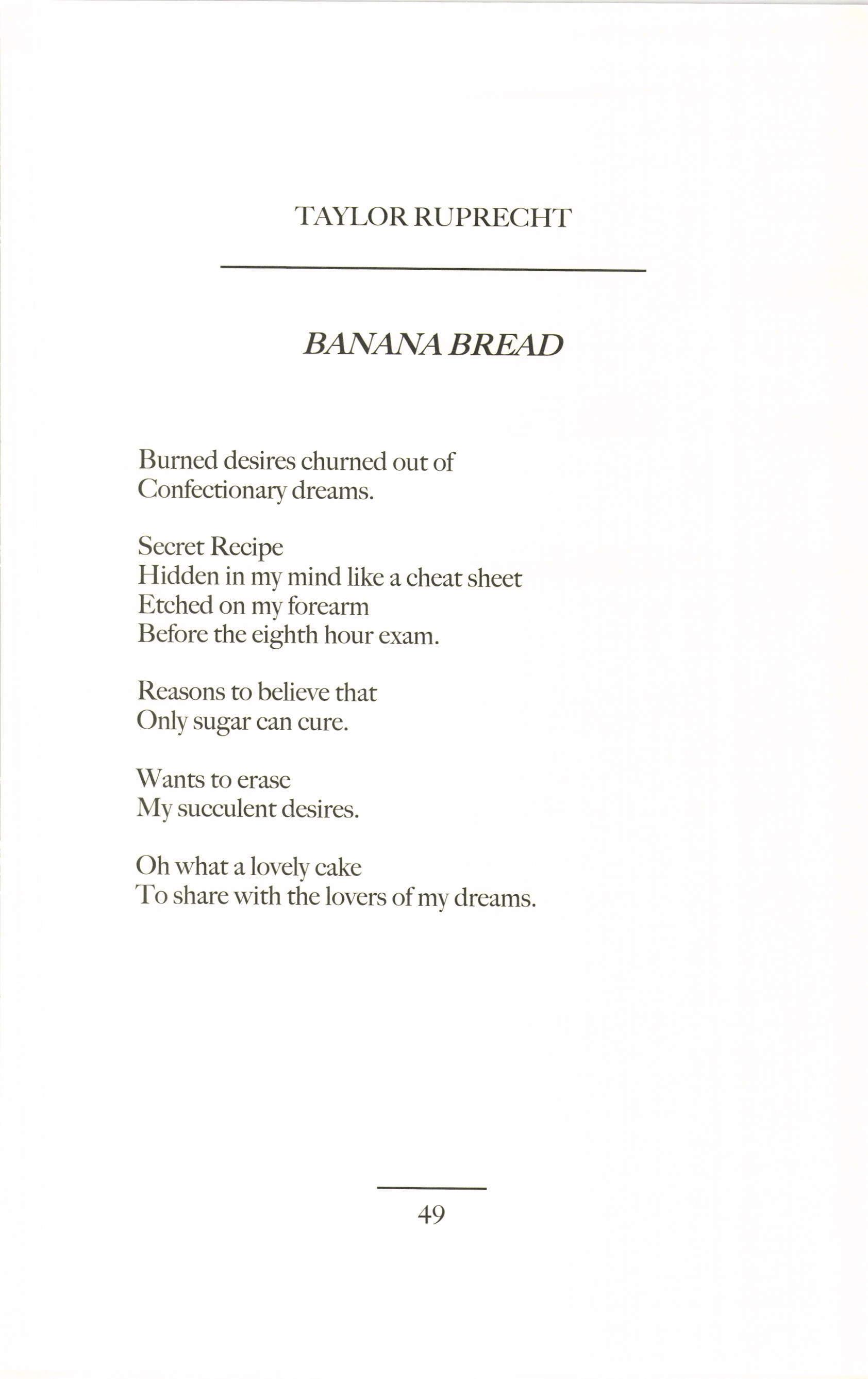 Her story can only be read in the contour of her mother's tree bark Forty-t'wo rings engraved in trunk Countyears she spentdigging roots into the ground. But nothing could prepare her for November. Tired hands. Clingingto herbranch. Iravesfall in November. Eventually. The leaf let go. After nvo days. Silently. It swirled gracefully. In thewind of its last breath. She sleeps in November. On a street carpeted gold. Greenwill never see. Red. Will neverwrinkle. To bror,vn.