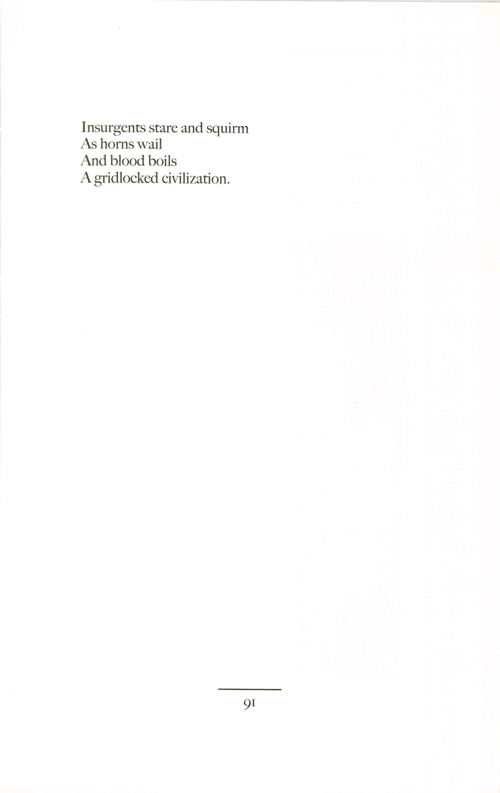 Incapacitated cars Surround the amphitheater Of imaginary Squawkand chatter.