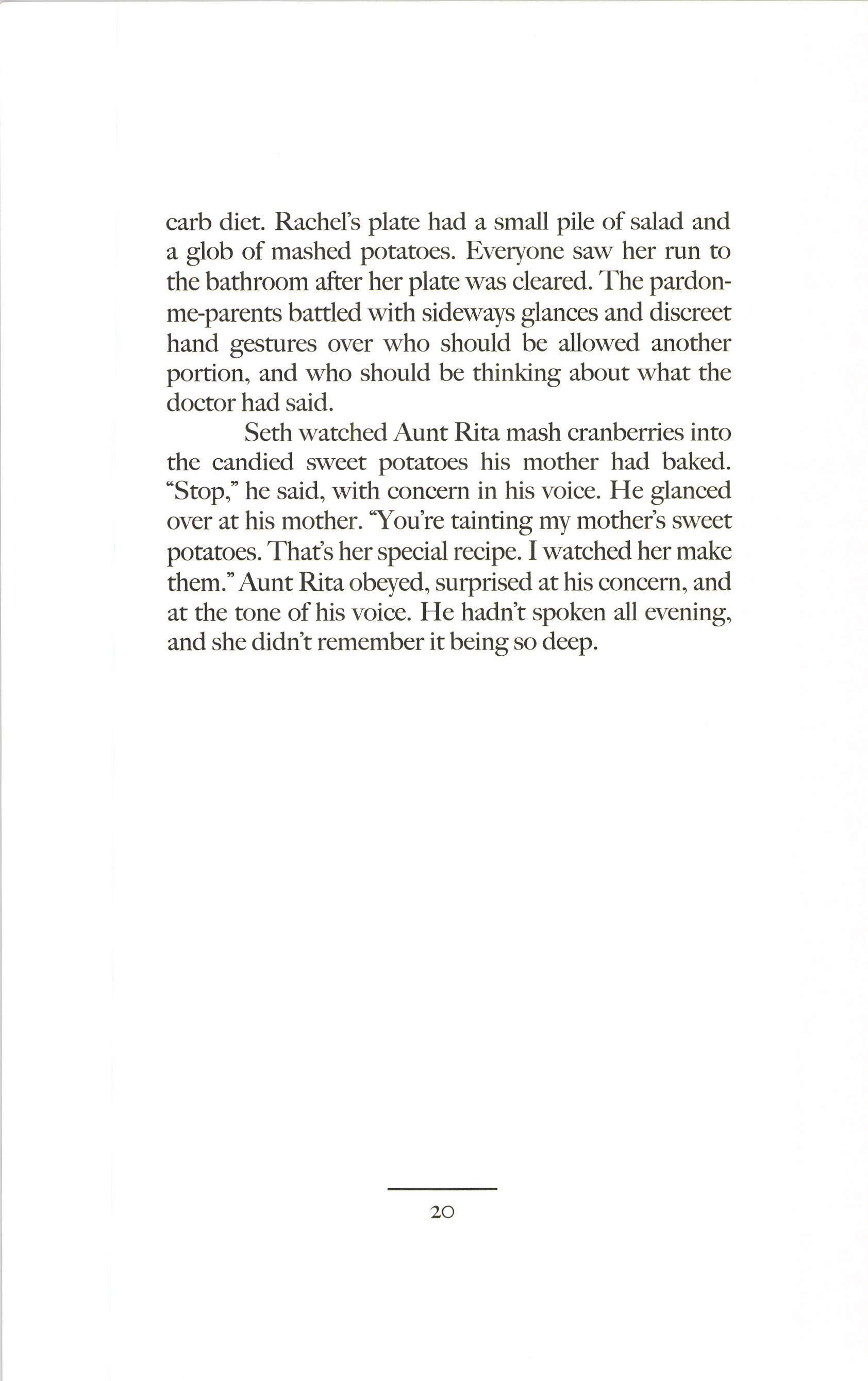 carb diet. Rachel's plate had a small pile of salad and a glob of mashed potatoes. Everyone saw her run to the bathroom after her platewas cleared. The pardonme-parents battled with sideways glances and discreet hand gestures over who should be allowed another poftion, and who should be thinking about what the doctor had said.