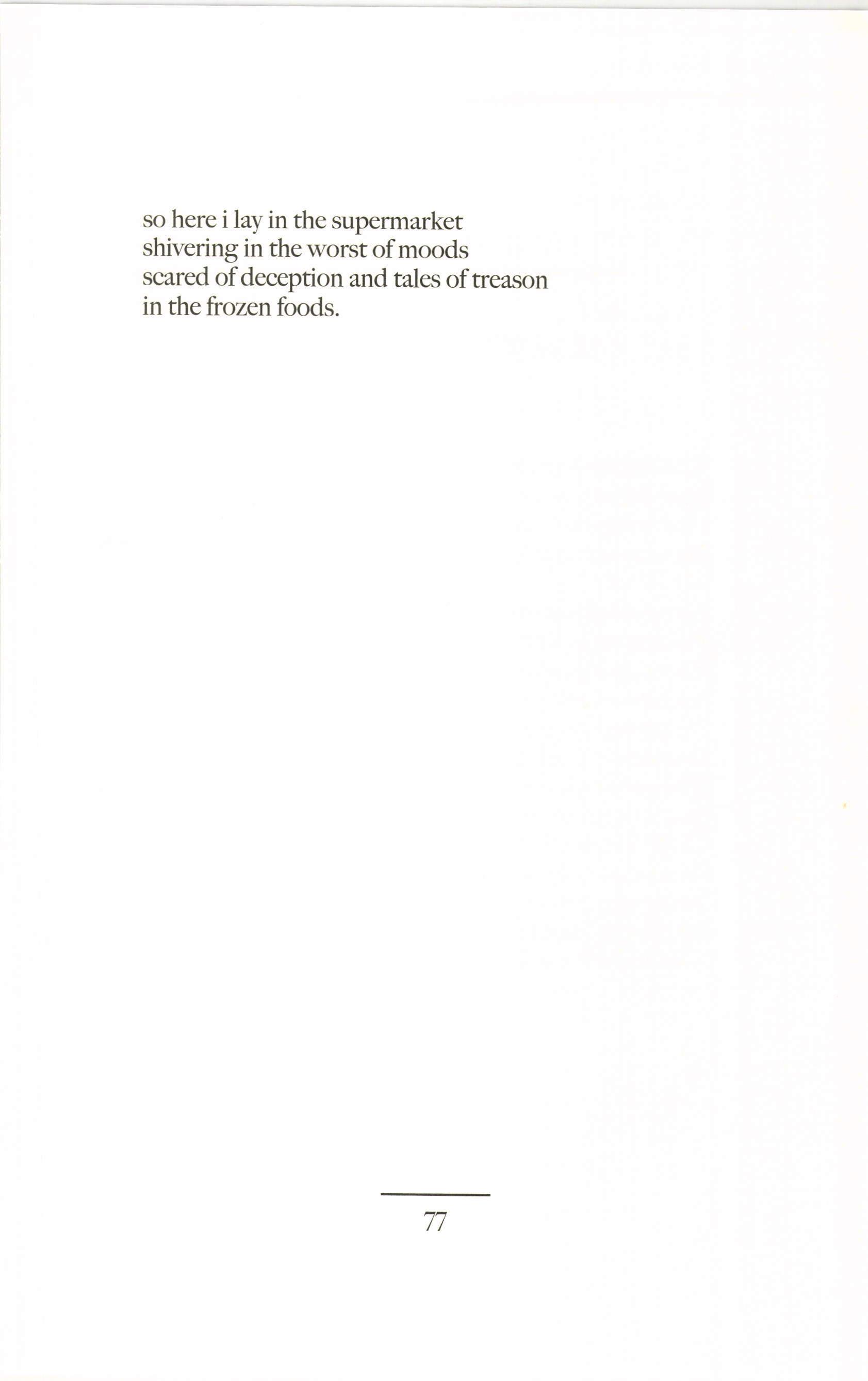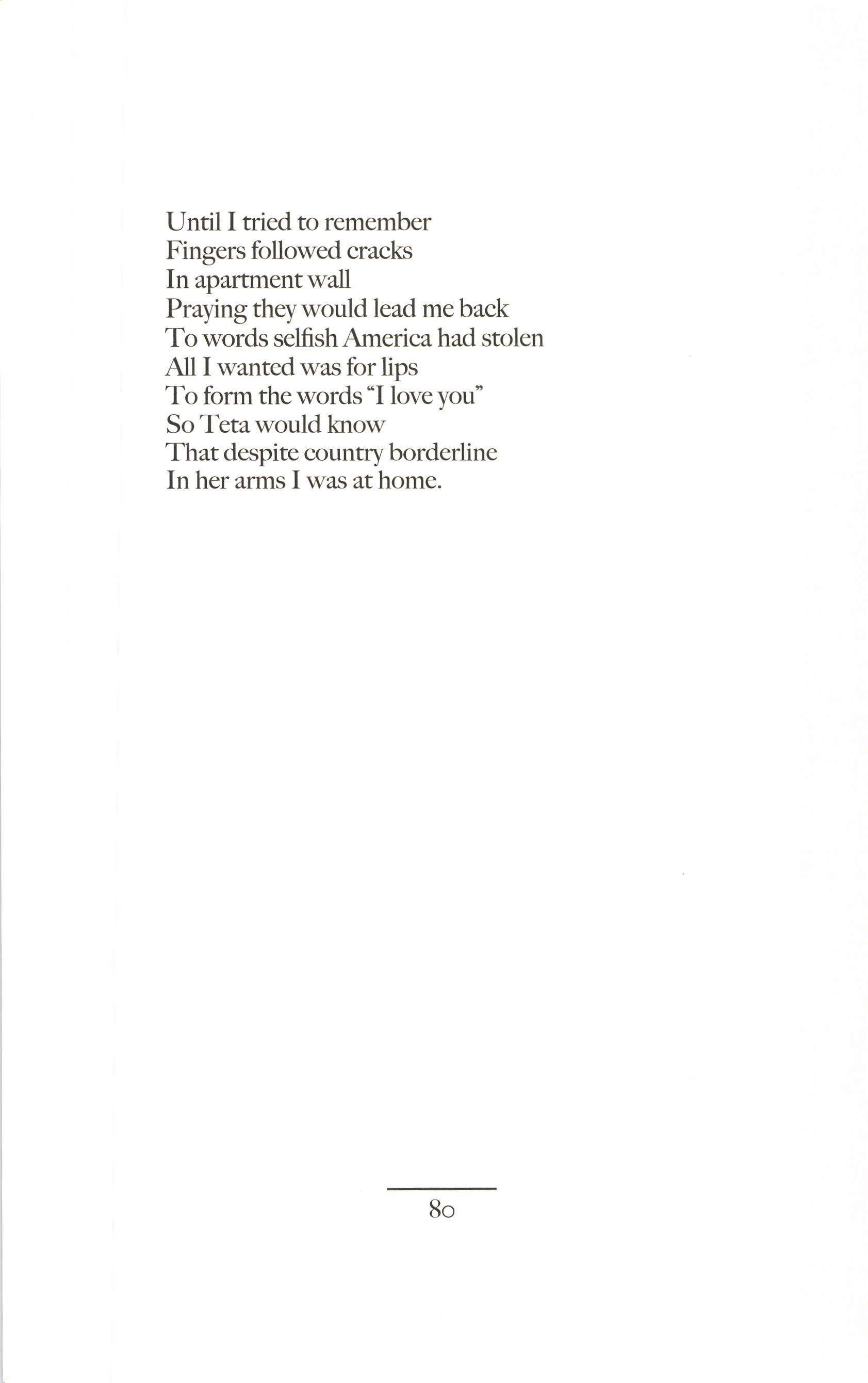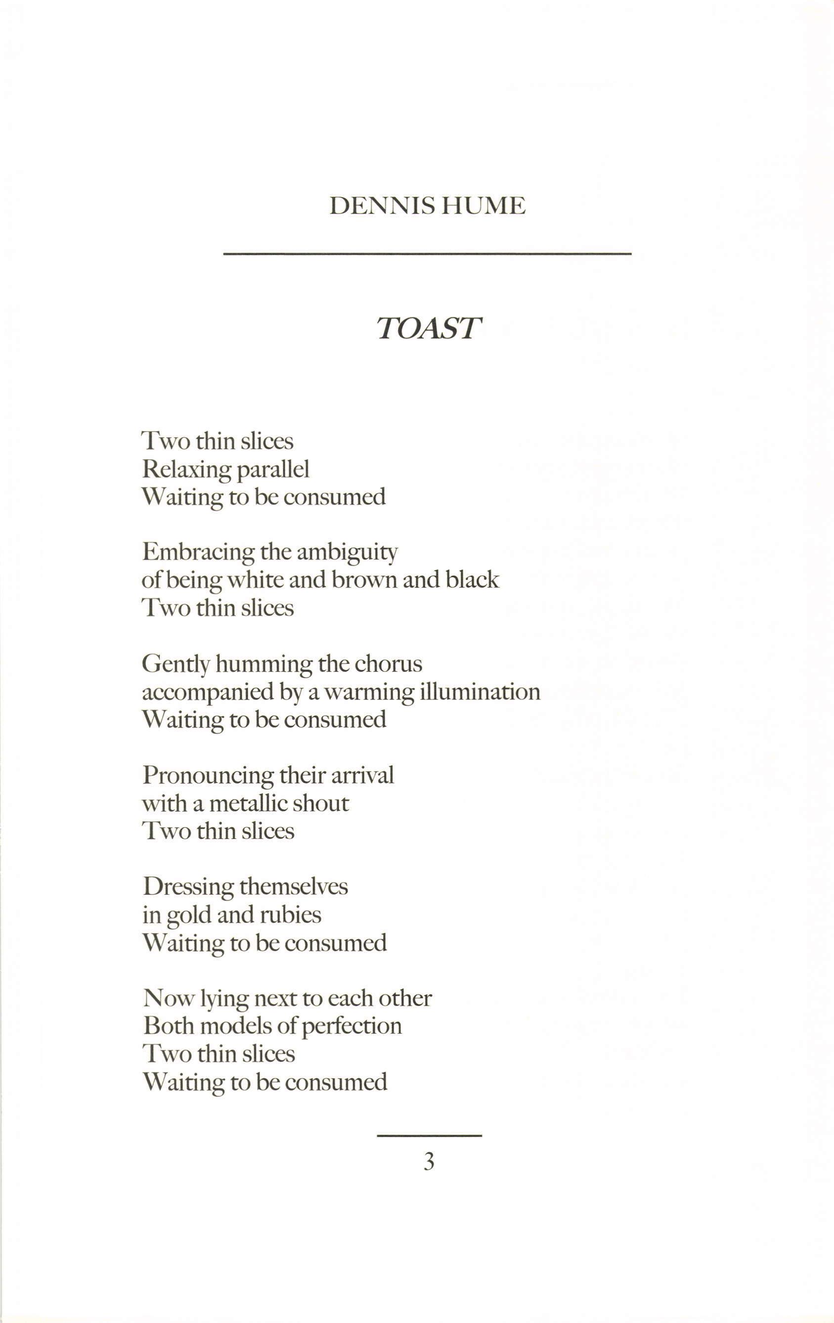 With a stampcrossed dlmamiq6e. We dreamt aboutthe night thatstood up. That nightwe dinedwith our twilight, Dewslacked and backboned, That same night againstwhich eleven became one and one became two. We pause, resting our dust-trail joints, As the igaanasnuckpast, unbitten. Over the subtle unison of the sleeping animals, We thoughtwe had heard The soundtracked wind sprinkling a prayer through ourwhistles
