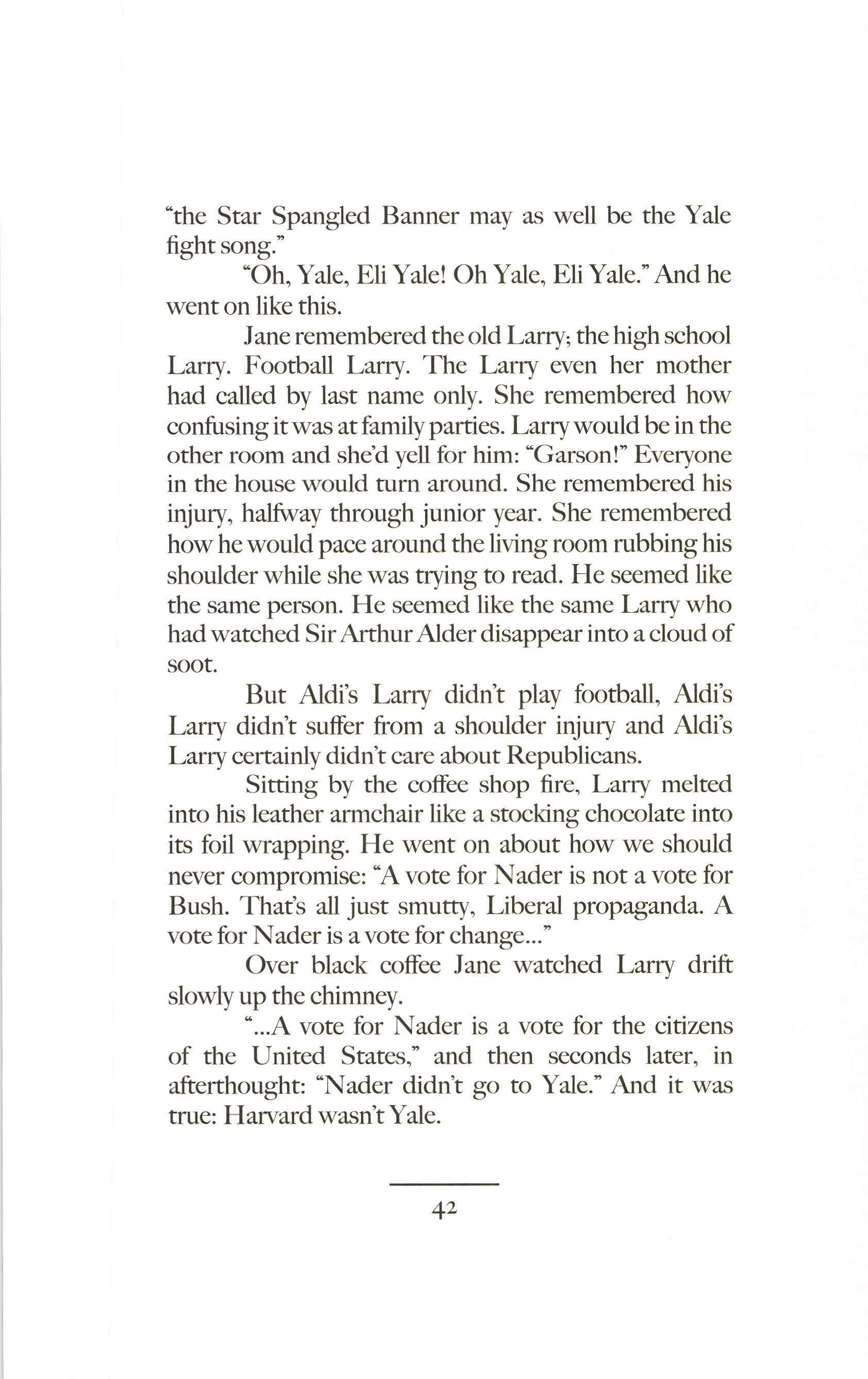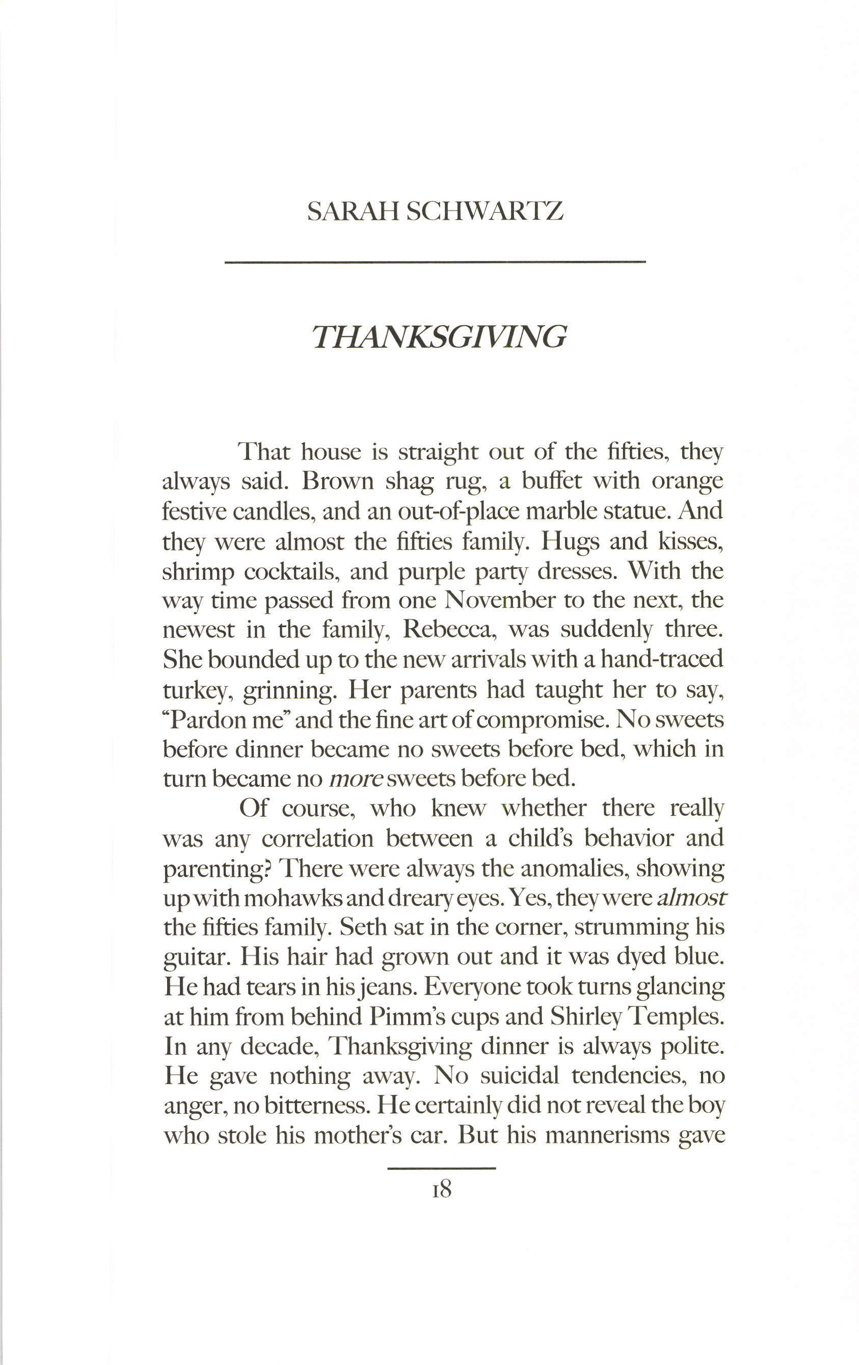Of course, who knew whether there really was any correlation between a childs behavior and parenting? There were always the anomalies, showing up with mohawks and dreary eyes. Yes, theywere almost the ffies family. Seth sat in the corner, strumming his guitar. His hair had grornn out and it was dyed blue. He had tears in hisjeans. Everyone took turns glancing at him from behind Pimm's cups and ShirleyTemples. In any decade, Thanksgiving dinner is always polite. He gave nothing away. No suicidal tendencies, no anger, no bitterness. He cerrainly did not reveal the boy who stole his mother's car. But his mannerisms gave