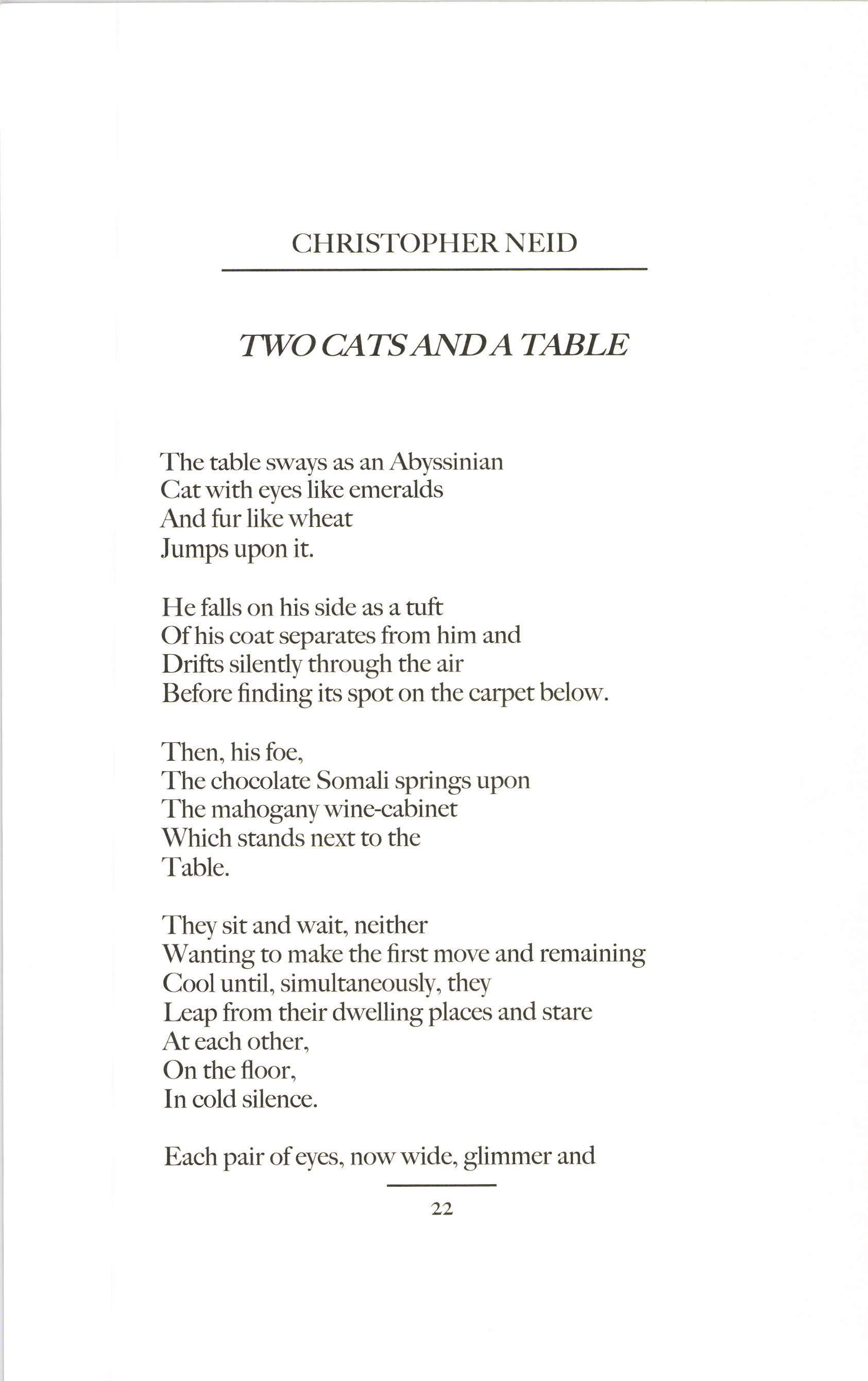 The table s\Mays as an Abyssinian Catwith eyes like emeralds Andfurlikewheat Jumps upon it.