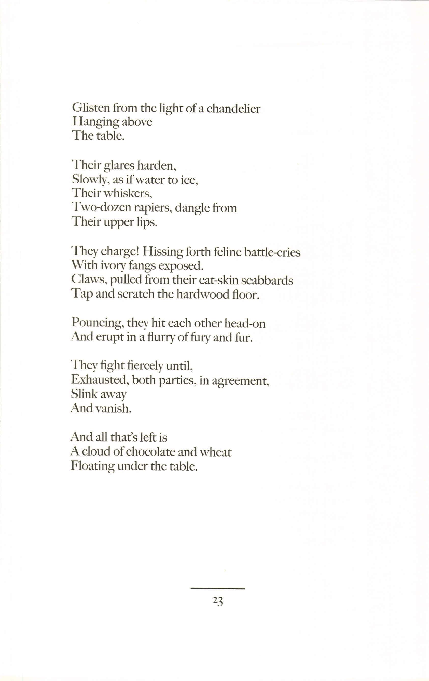 They charge! Hissing forth feline battle-cries With ivory fungr e4posed. Claws, pulled from their car-skin scabbards Tap and scratch the hardwood floor.