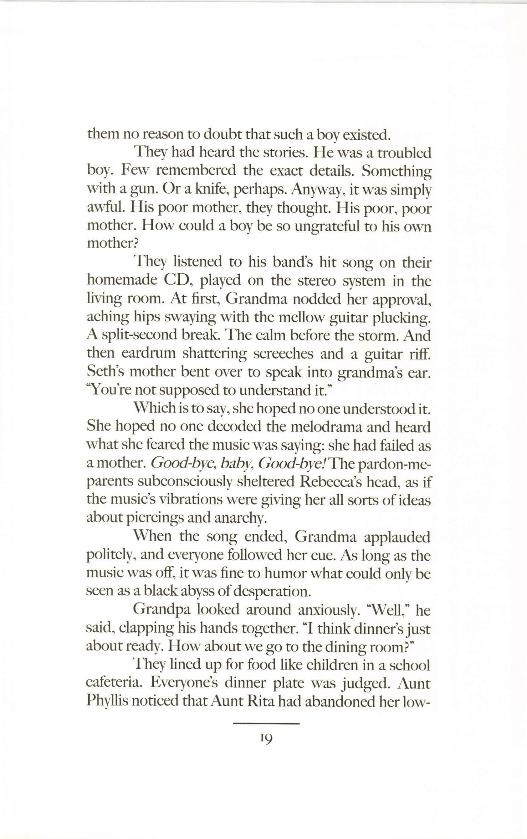 Which is to say, she hoped no one understood it. She hoped no one decoded the melodrama and heard what she feared the musicwas saying: she had failed as a mother. Good-bye, baby, Good-byelThe pardon-meparents subconsciously sheltered Rebecca's head, as if the music's vibrations were giving her all sorts of ideas about piercings and anarchy.