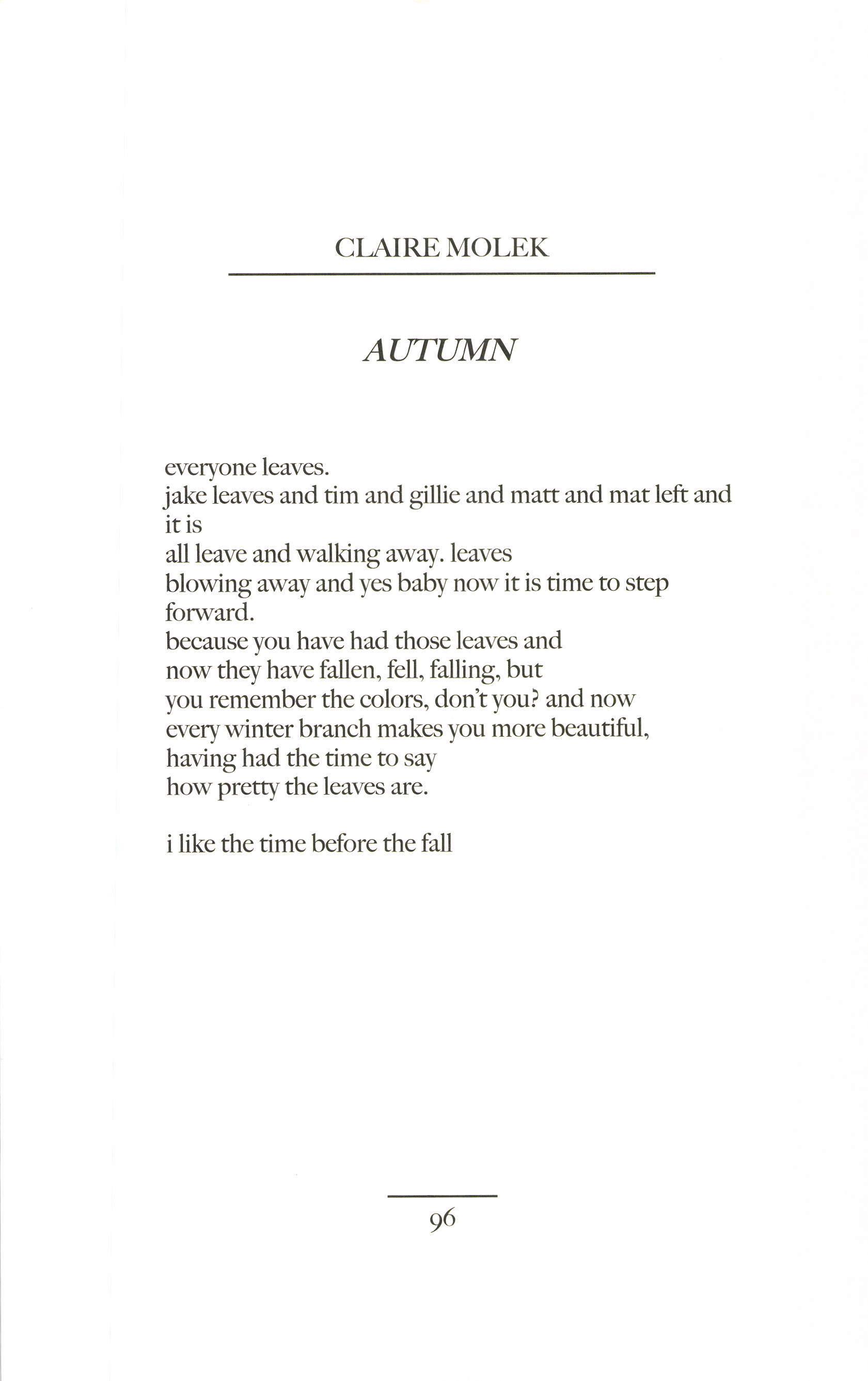 everyoneleaves. jake leaves and tim and gillie and matt and mat left and it is all leave andwalhng away. leaves blowing away and yes baby now it is time to step forward. becauseyou have had those leaves and now they have fallen, fell, falling, but you remember the colors, dontyou? and now every winter branch makes you more beautiful, having had the time to say howpretty the leaves are.