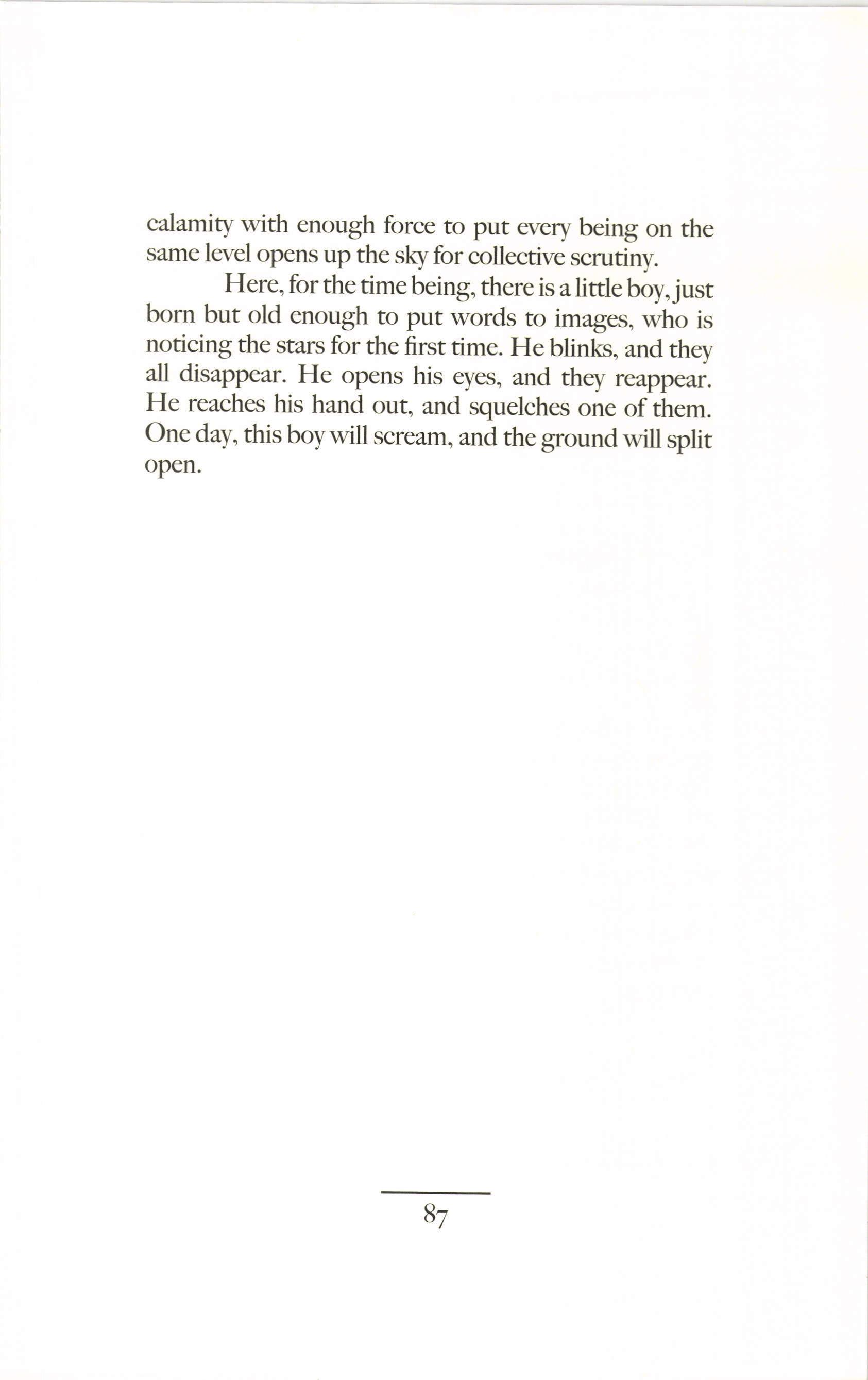 Here, for the time being, there is a litde boy, just born but old enough to put words to images, wtro is no-ticing tlre stam for the first time. He blinks, and they 4! disappear. He opens his eyes, and ttrey reapp€ar. He reaches his hand out, and squelches one of-them.