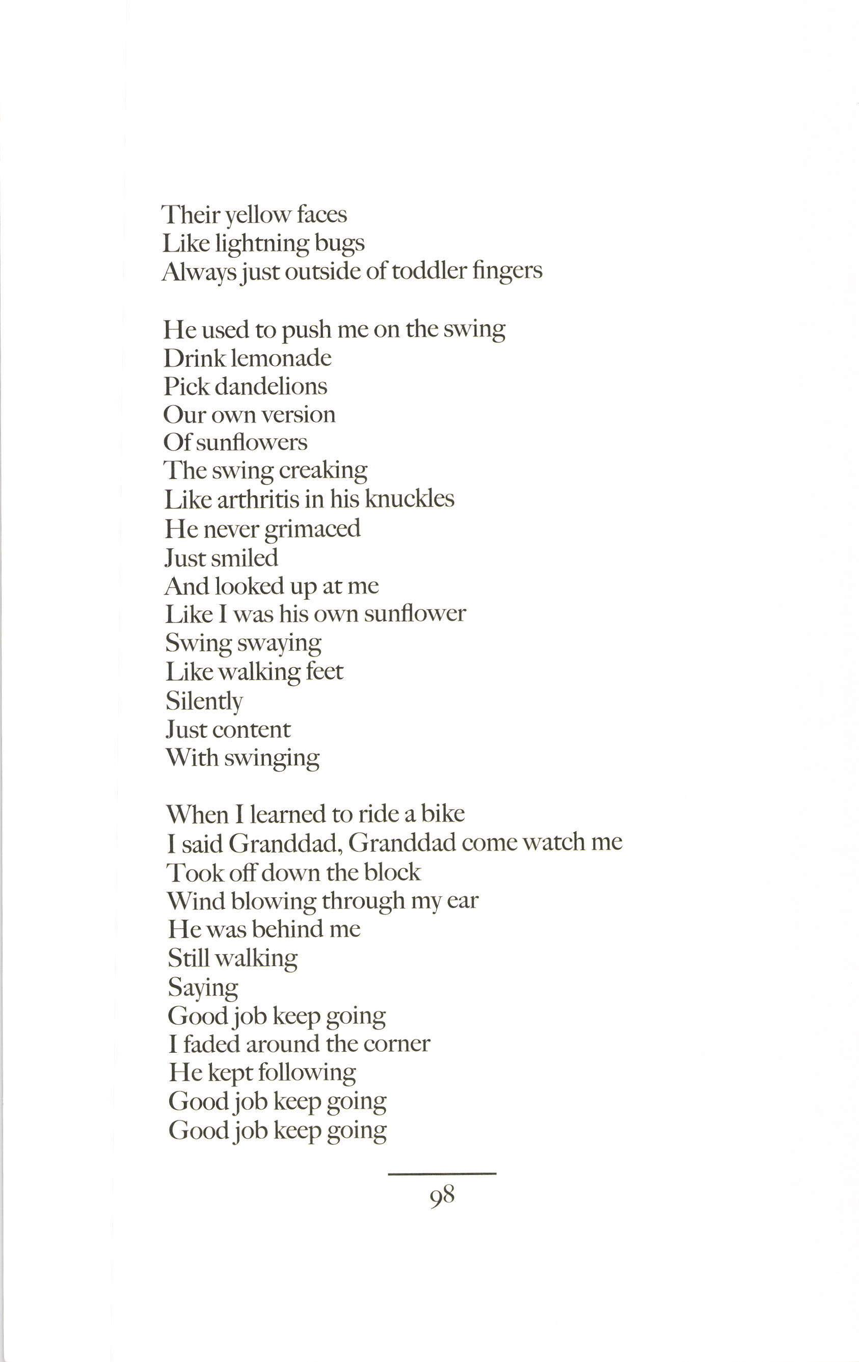 Ouroumversion Of sunflowers The swing creaking Like arthritis in his knuckles He never grimaced Justsmiled Andlookedup atme Like I was his ou,n sunflower