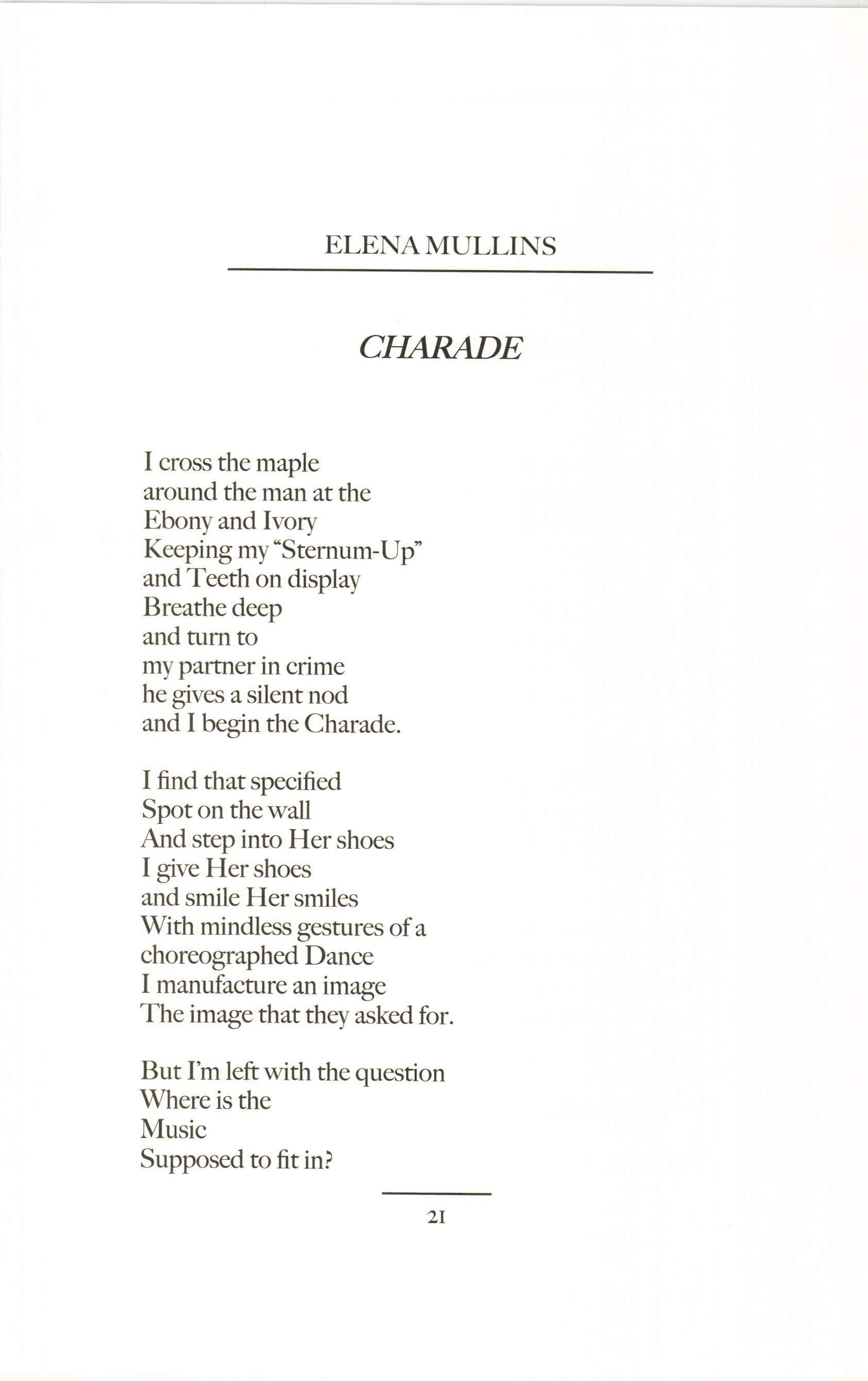 I crossthemaple aroundtheman atthe Ebonyand Ivory Keeping my'Sternum-Up' andTeeth on display Breathedeep and turn to mypartnerin crime hegives asilentnod and I begintheCharade.