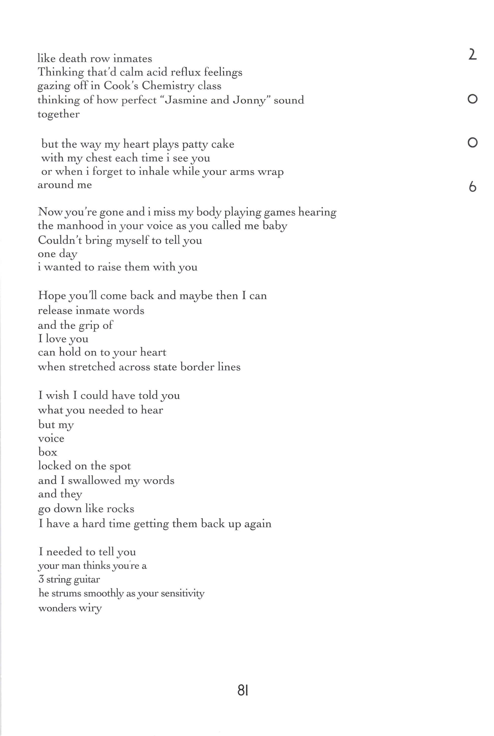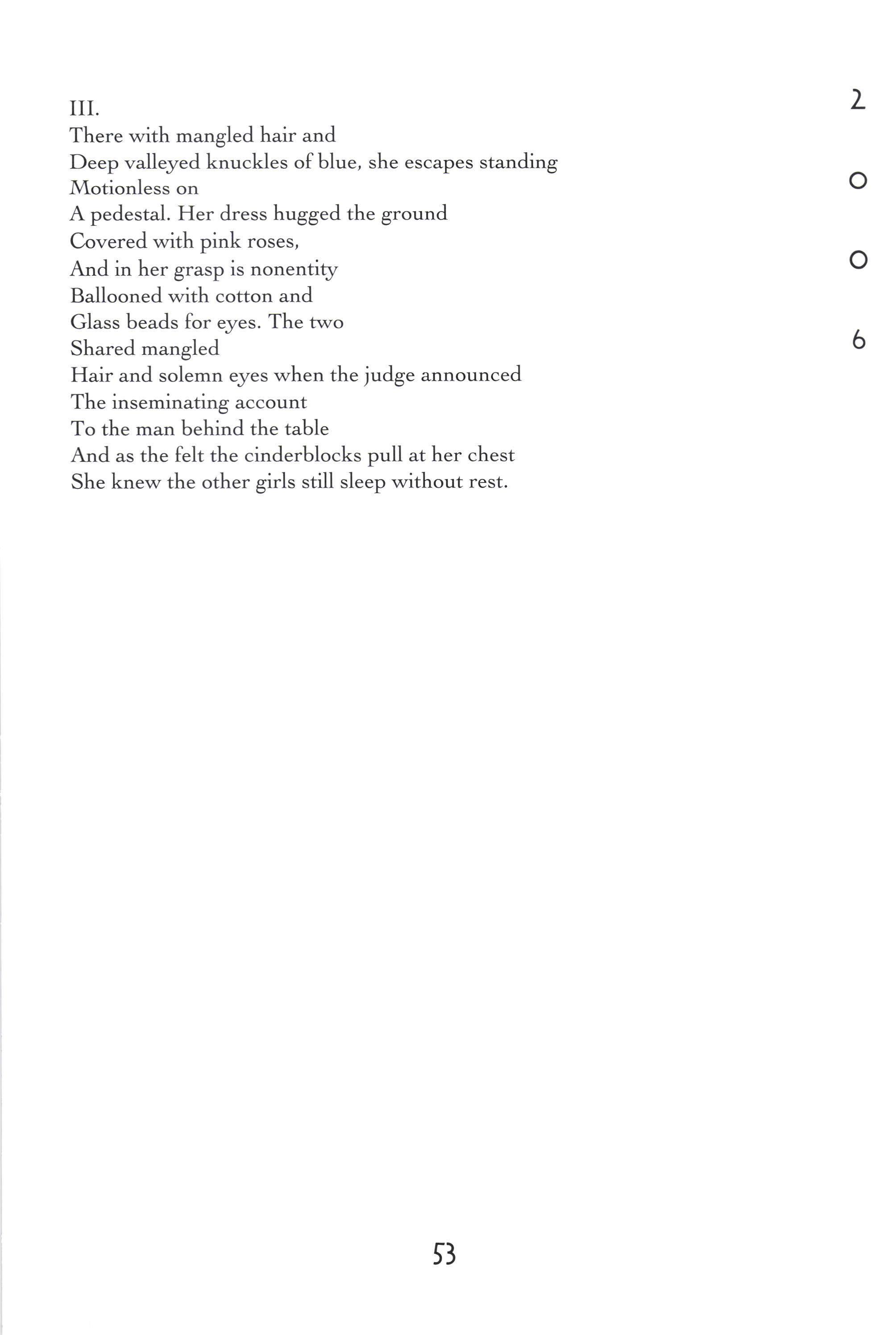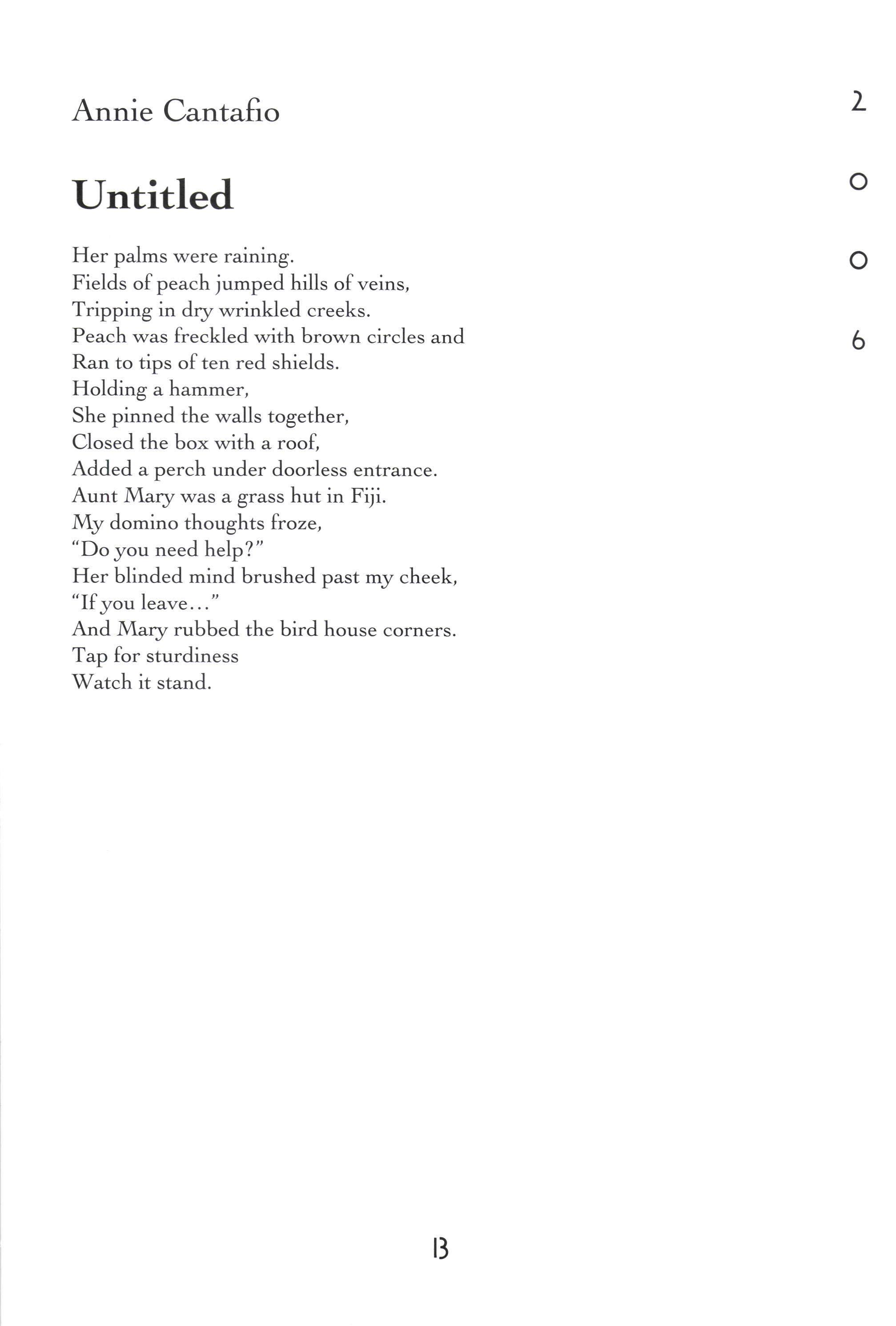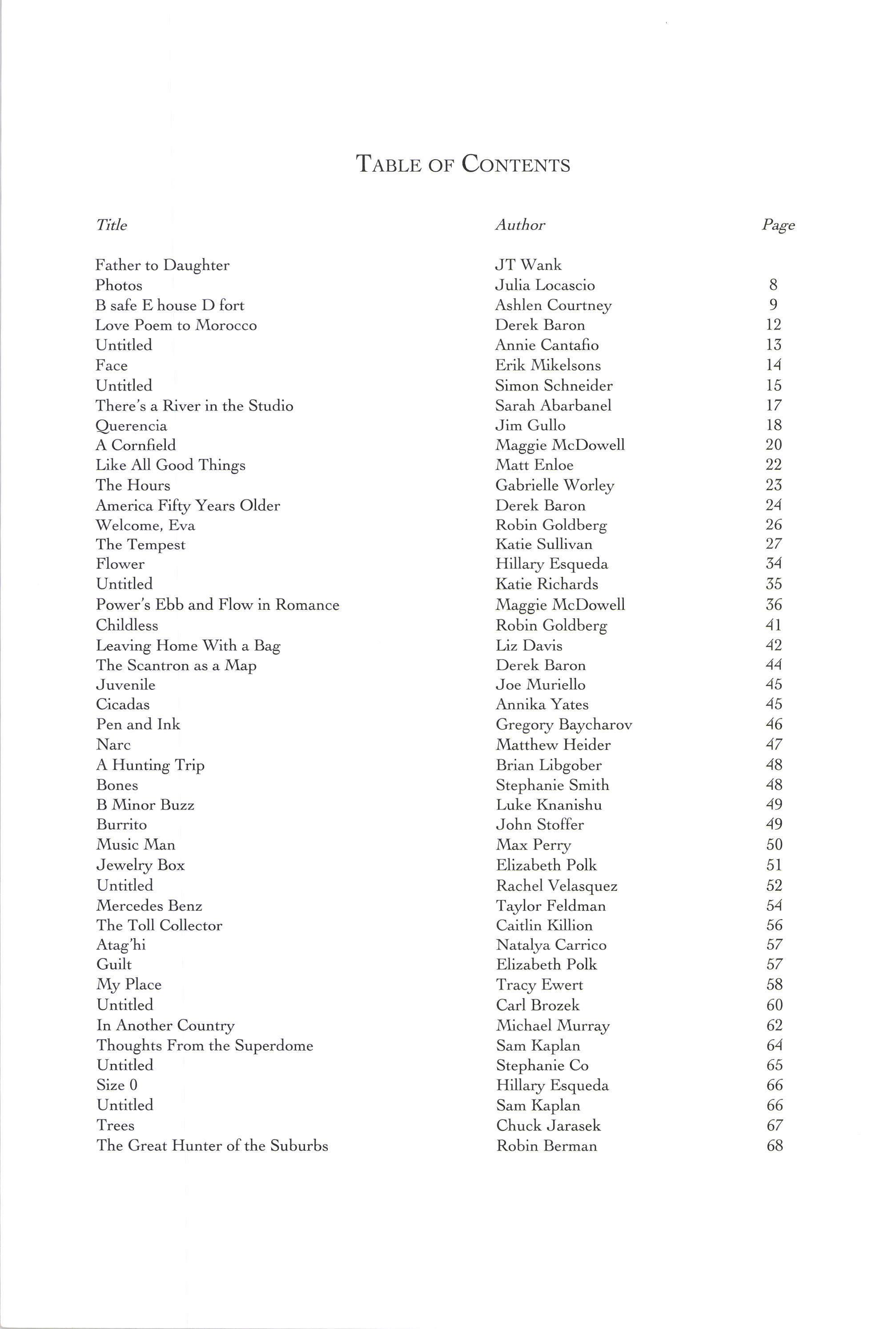 Untitled There's a River in the Studio Querencia A Cornfield Like All Good Things The Hours America Fifty Years Older 'Welcome, Eva The Tempest Flower Untitled Power's Ebb and FIow in Romance Childless [,eaving Home With a Bag The Scantron as a Map Juvenile Cicadas Pen and Ink Narc A Hunting Trip Bones B Minor Buzz Burrito Music Man Jewelry Box Untitled Mercedes Benz The Toll Collector Atag'hi Guilt