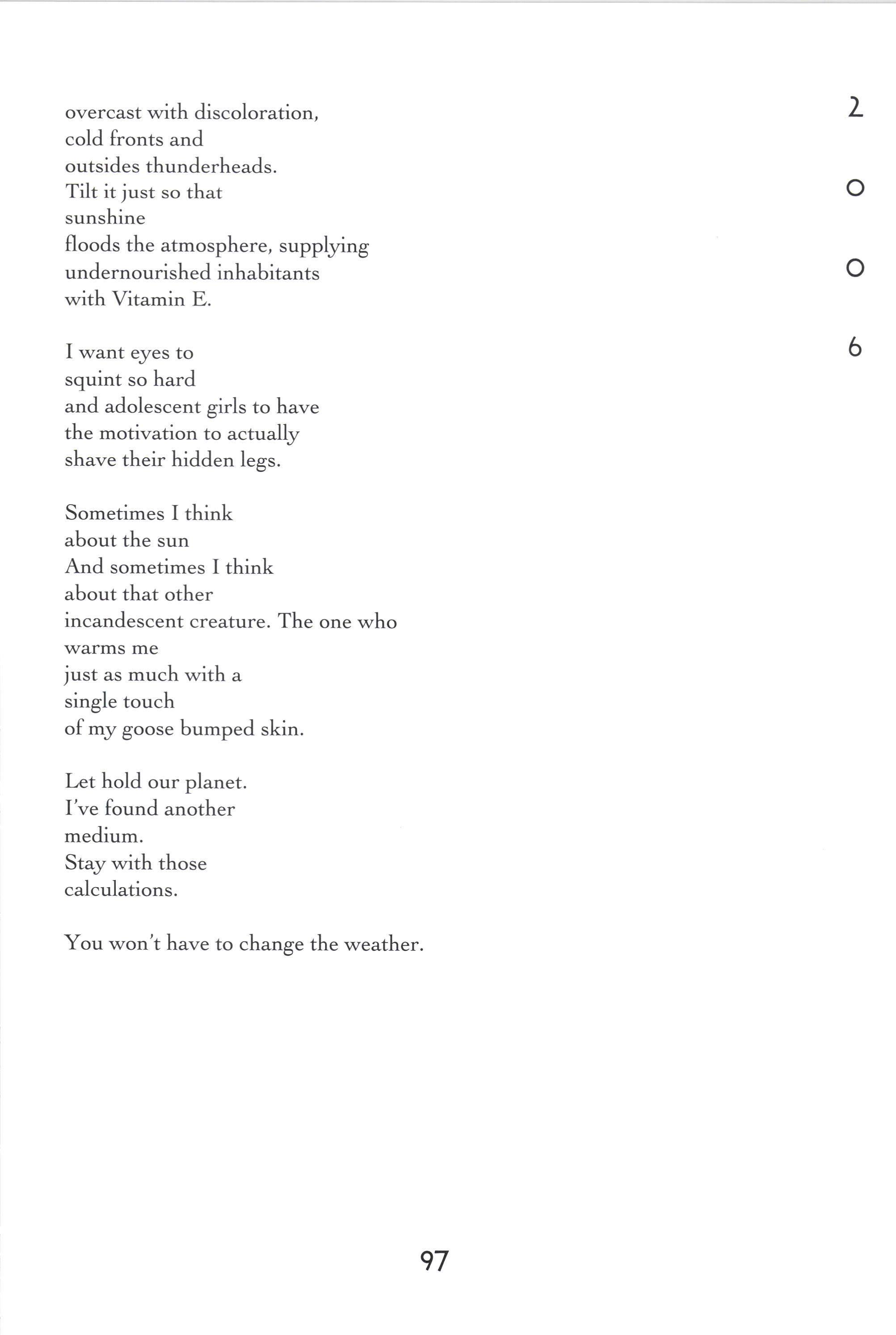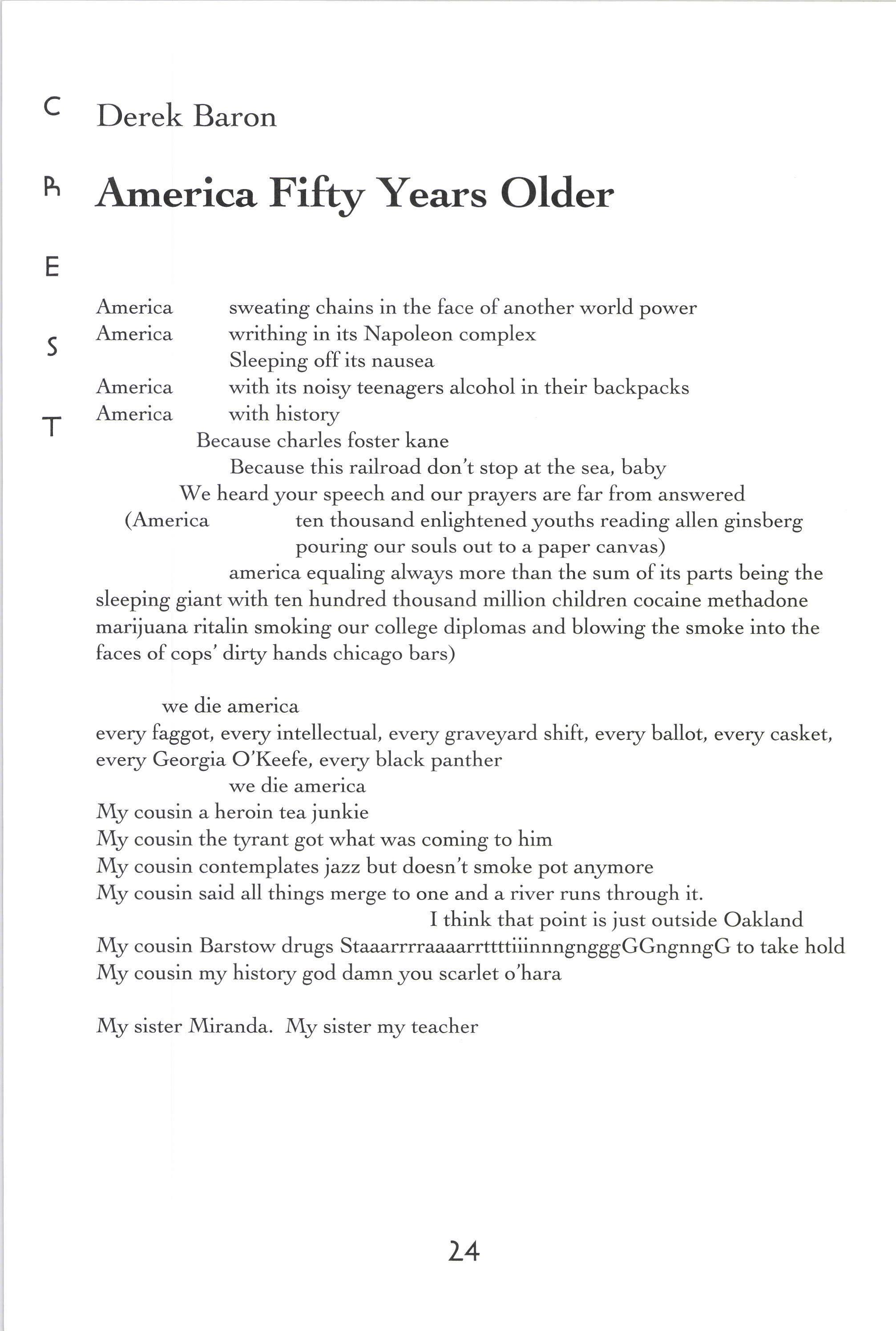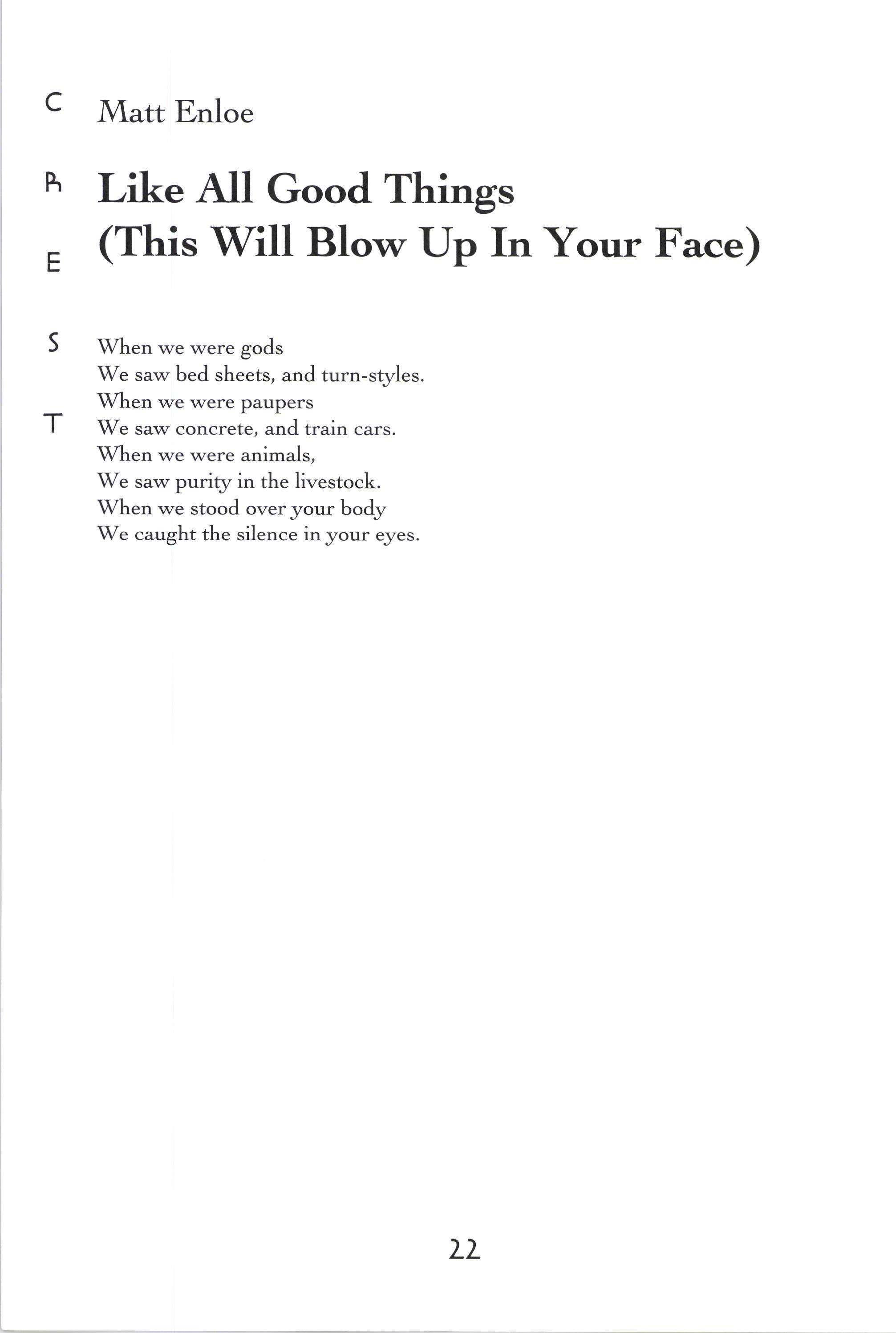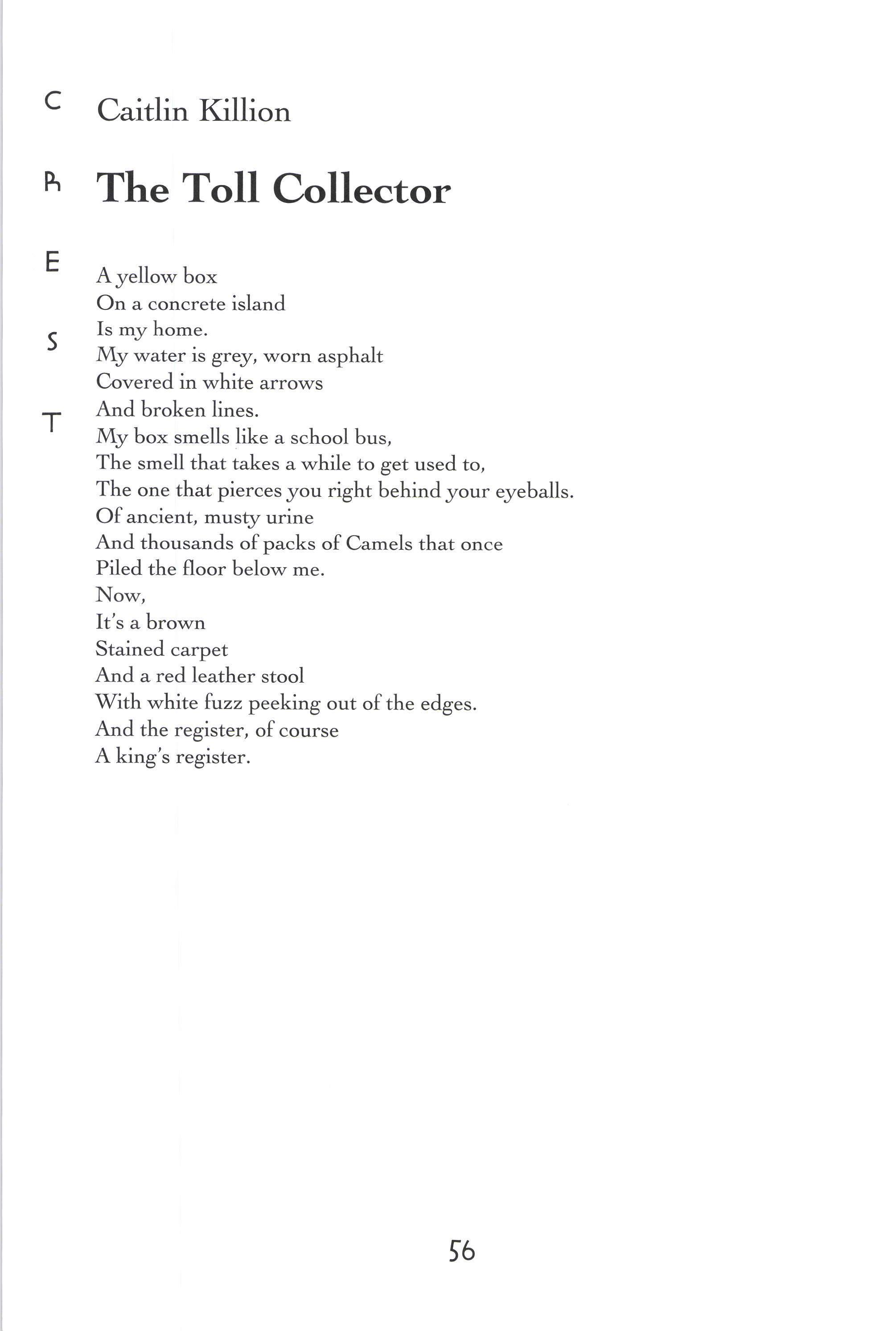 Untitled There's a River in the Studio Querencia A Cornfield Like All Good Things The Hours America Fifty Years Older 'Welcome, Eva The Tempest Flower Untitled Power's Ebb and FIow in Romance Childless [,eaving Home With a Bag The Scantron as a Map Juvenile Cicadas Pen and Ink Narc A Hunting Trip Bones B Minor Buzz Burrito Music Man Jewelry Box Untitled Mercedes Benz The Toll Collector Atag'hi Guilt