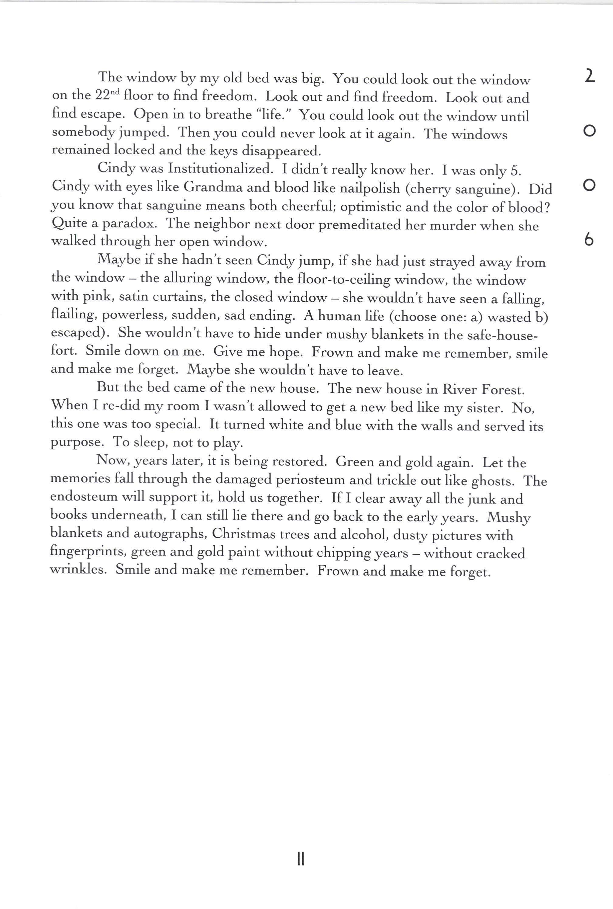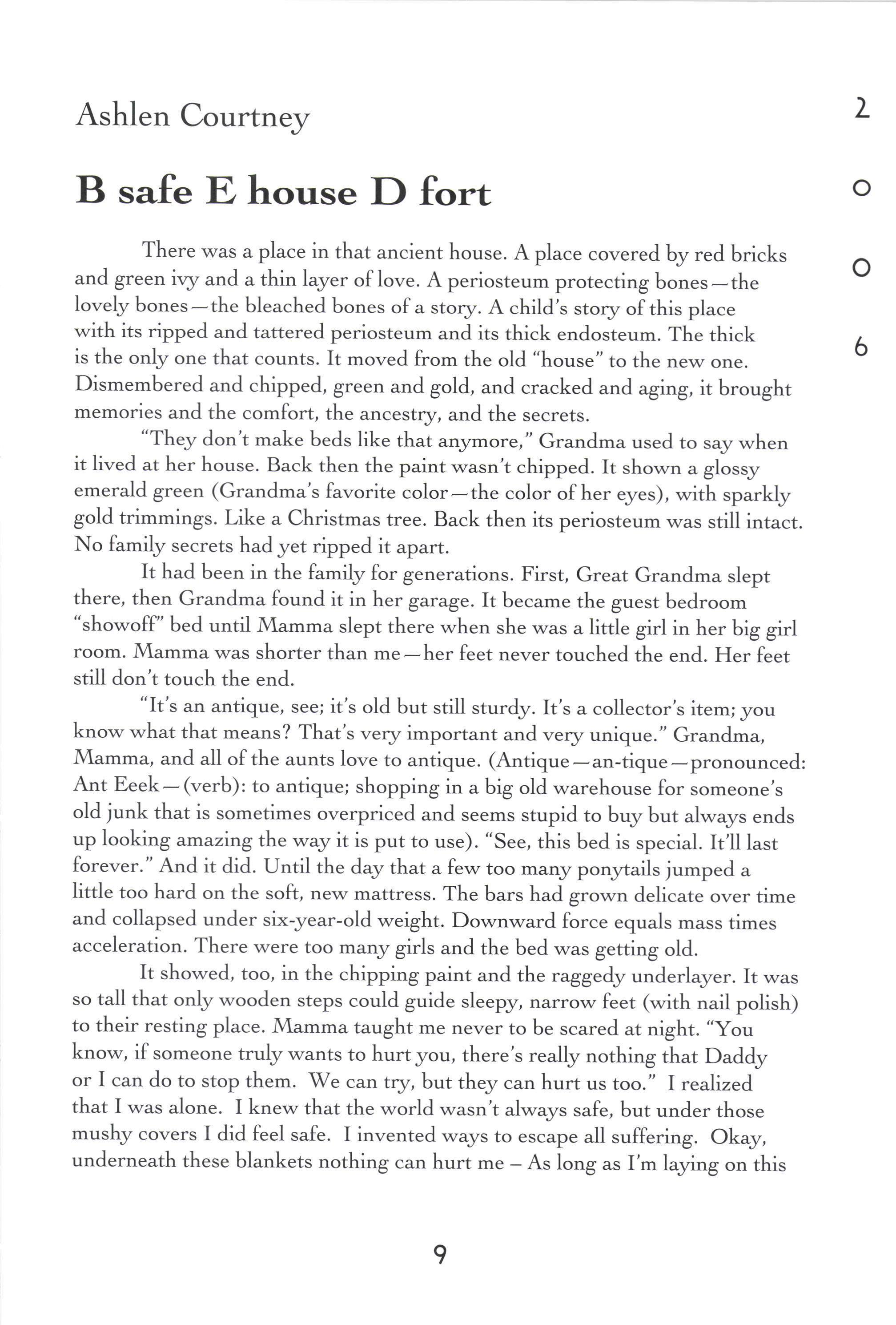 "They don't make beds like that anJrmore," Grandma used to say when it lived at her house. Back then the paint wasn't chipped. It shown a glossy emerald green (Grandma's favorite color-the color of her eyes), with sparkly gold trimmings. Like a Christmas tree. Back then its periosteum was still intact. No family secrets had yet ripped it apart.