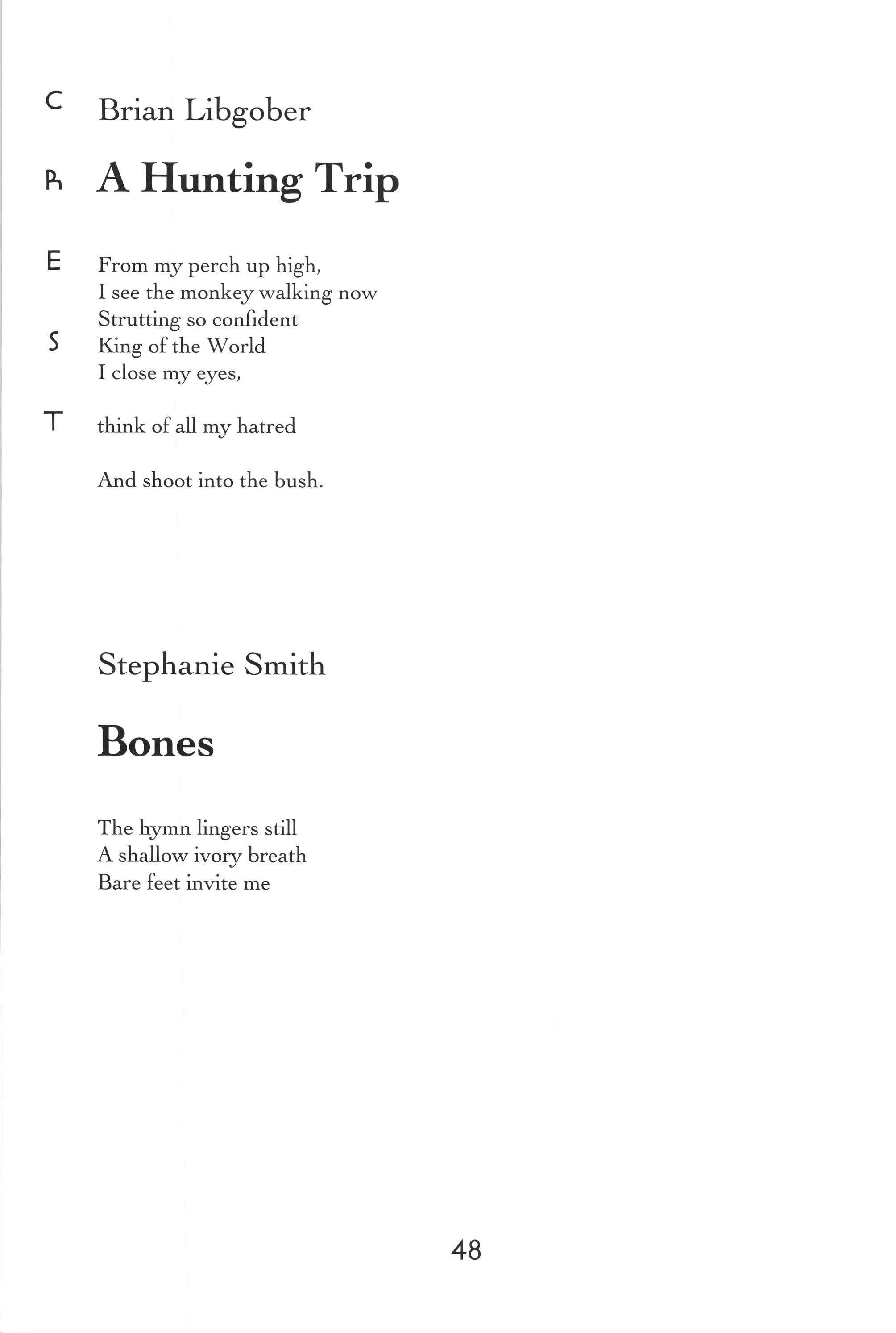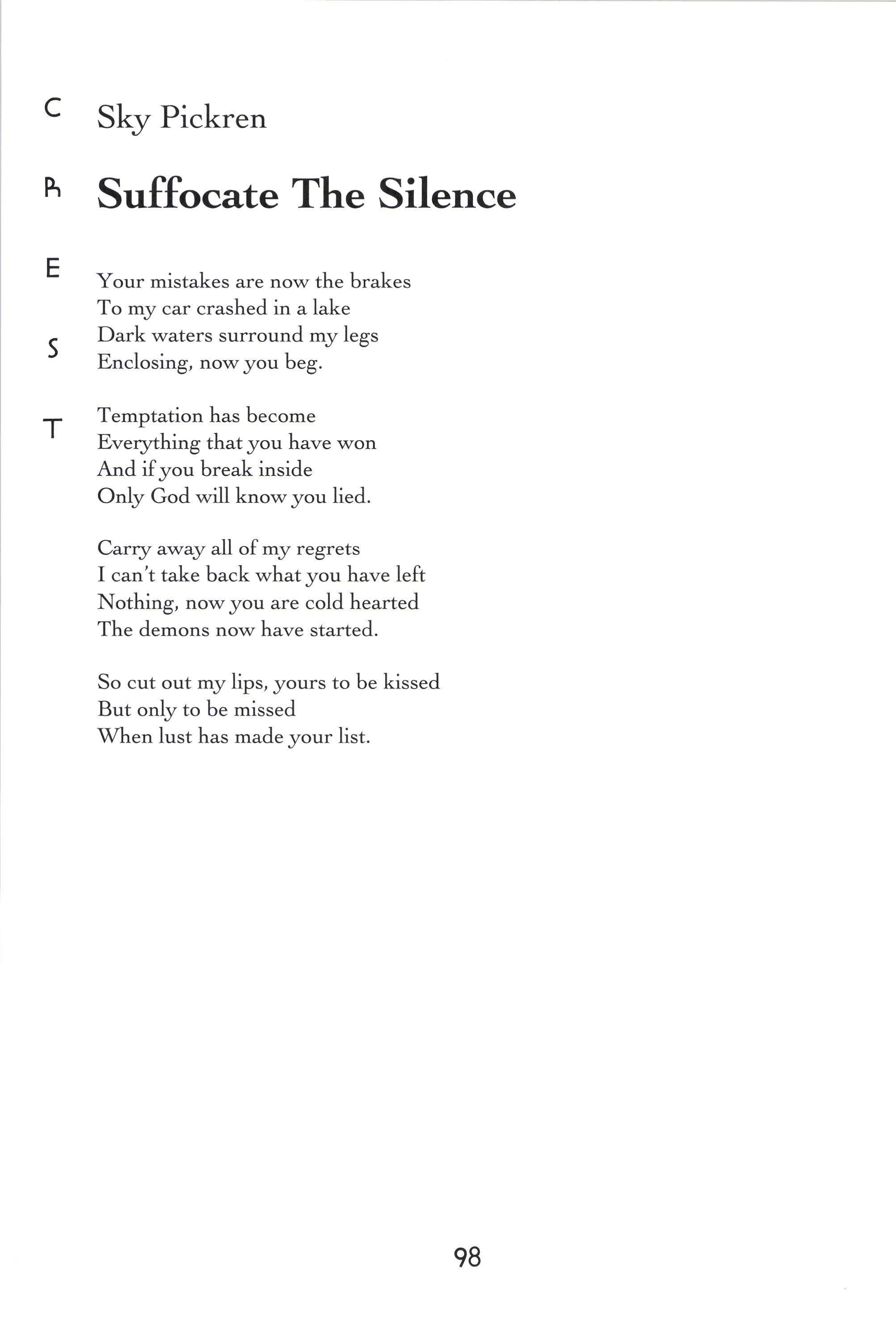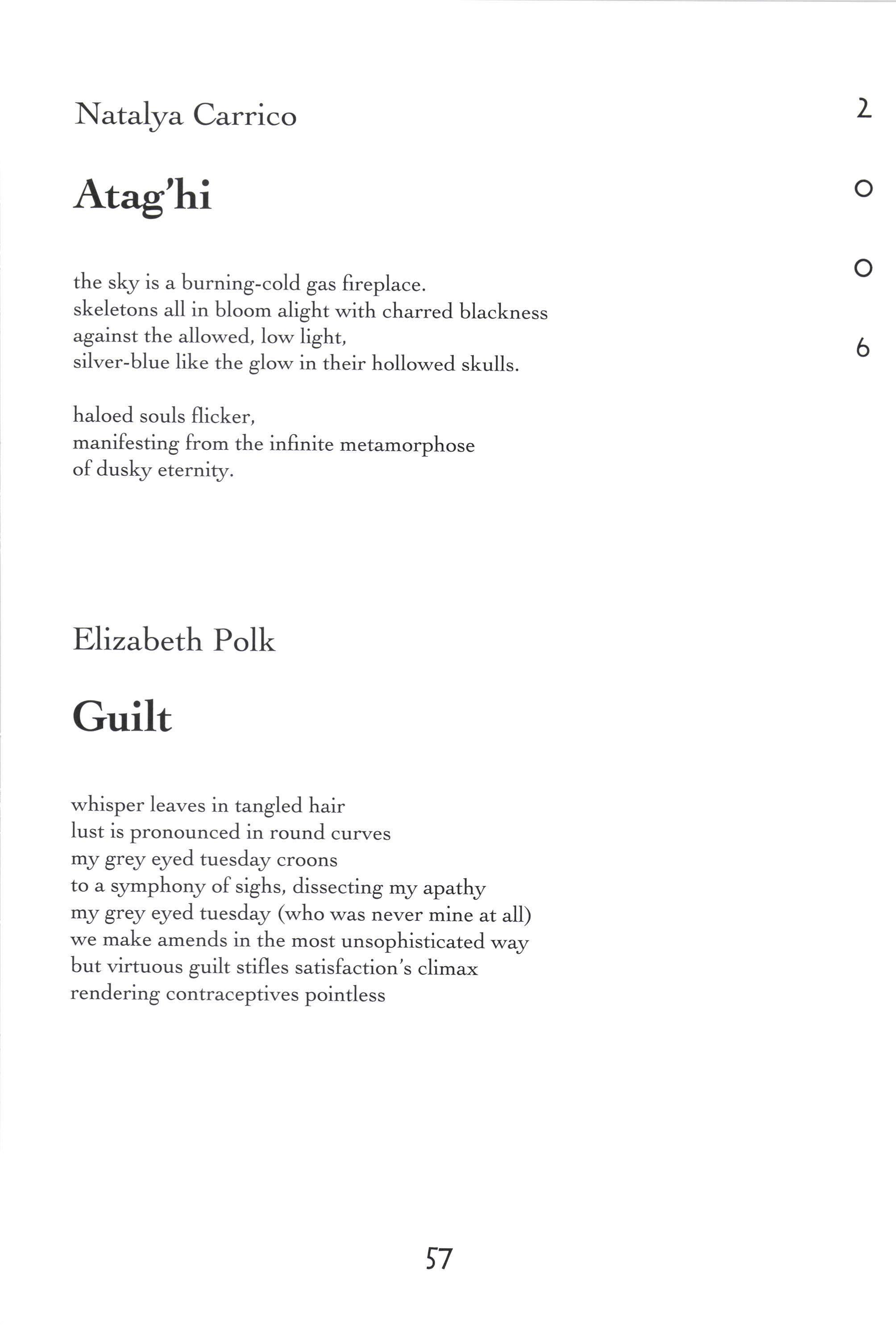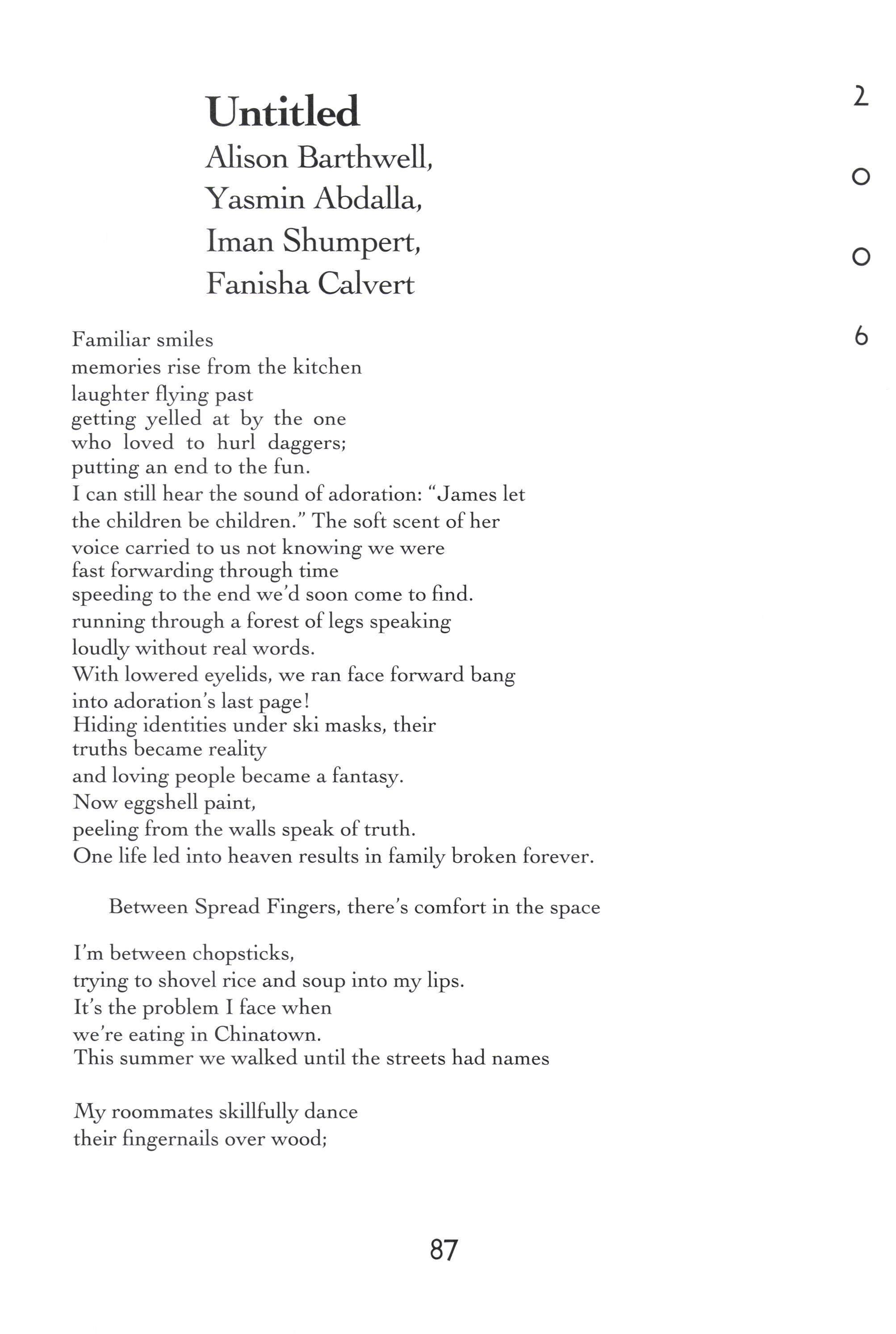 Donorica Harris, Brandon Long, Maria Villeda, Amy Lutz, Sarah Chambliss, Alicia Ludwig, Julius Cousin, Jasmine Grayer, Gabrielle'W'orley, Tabitha Watson, Michael Willis, Jacquanet Goggins, Alison Barthwell, Yasmin Abdalla, Iman Shumpert, Fanisha Calvert A Joke on a Drunken Beggar Stephanie [,ee Five Hundred Eighqz Seven Sarah I-eitson Mr. Weatherman Kirsten Rusinak Suffocate the Silence Sky Pickren Solo Teddy Swenson Letter to Dr. King Alex MacMillan Ice Peter Kahn No Longer A Sonnet Carling FitzSimmons Peppered Peter Kahn Play-Fighting Tom Re;,molds-Ejzak Intelligent Elephant Richard Zabransky