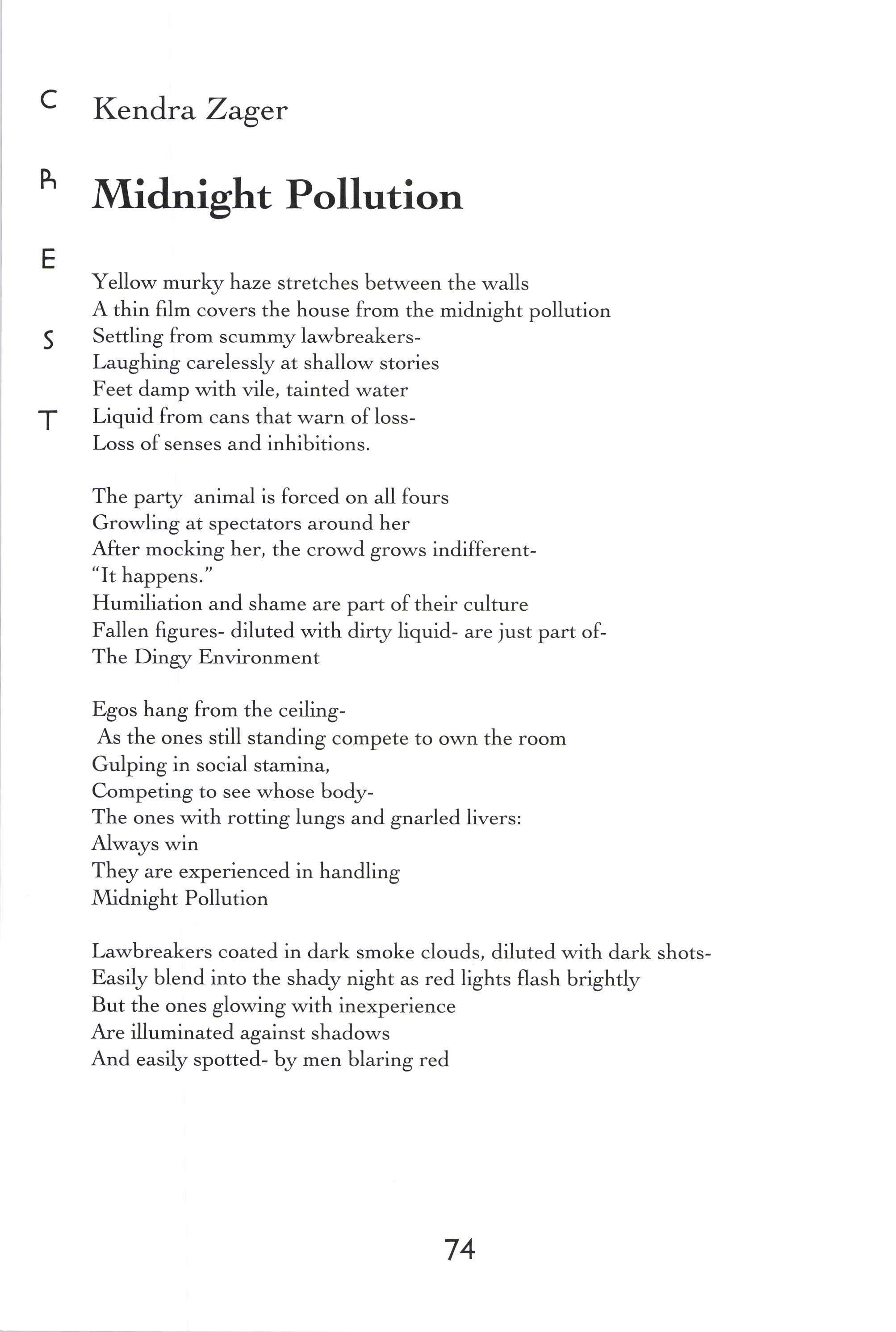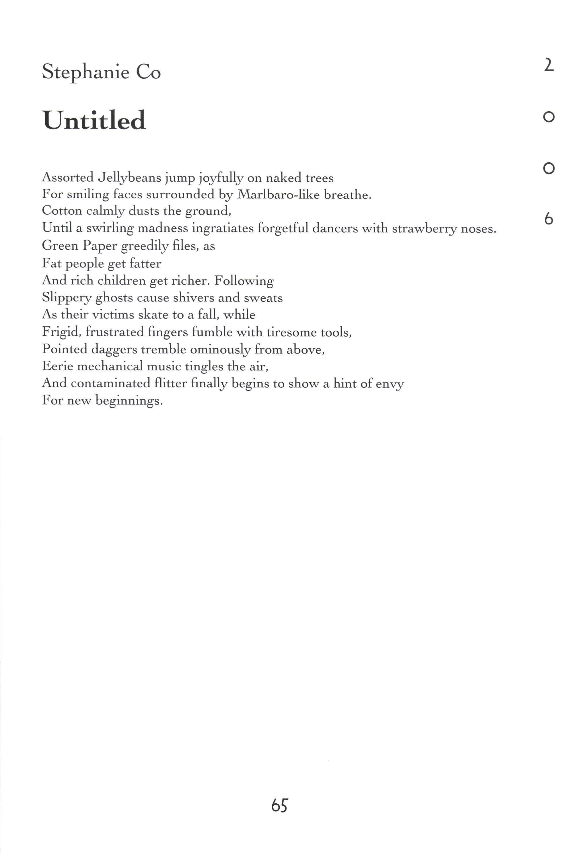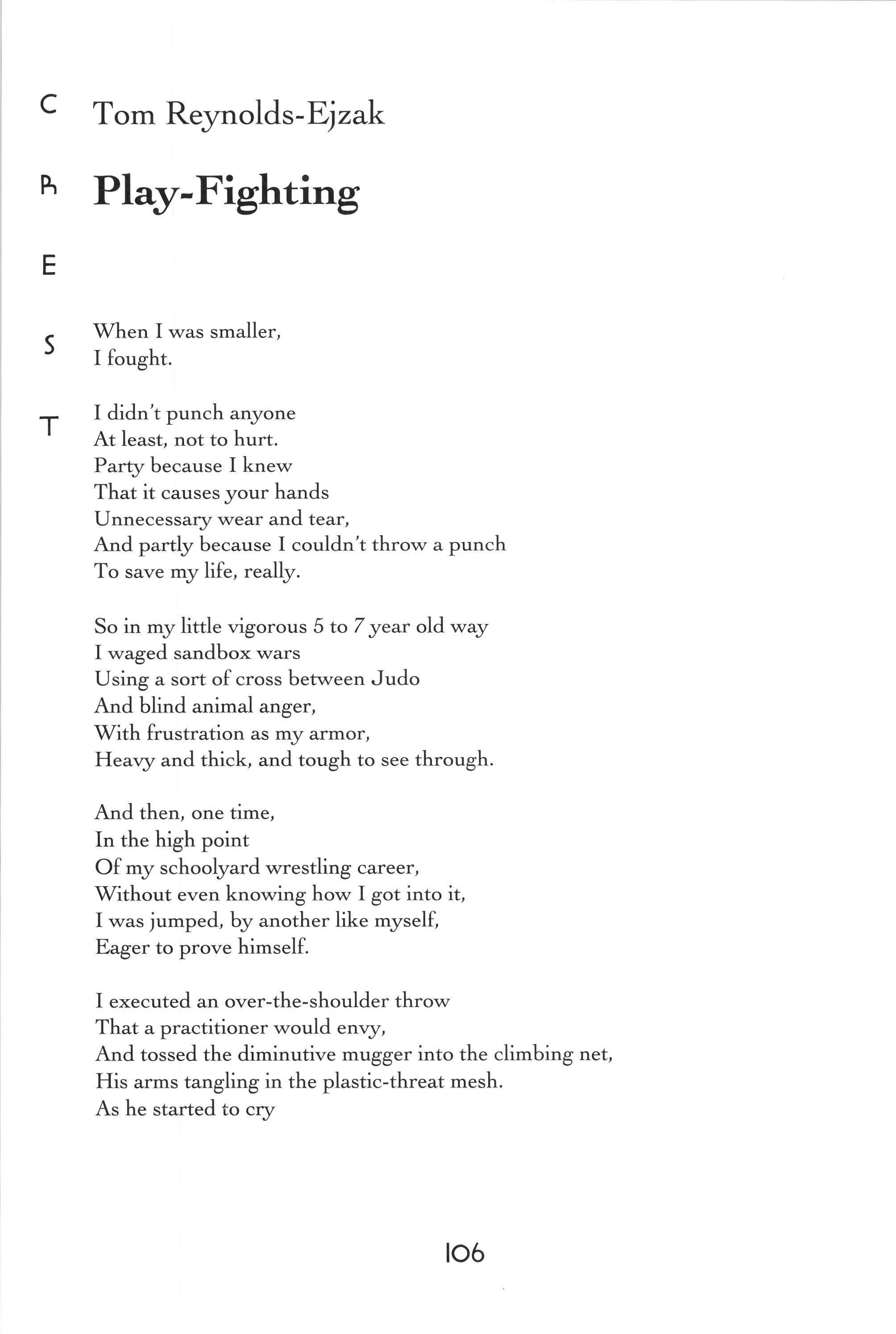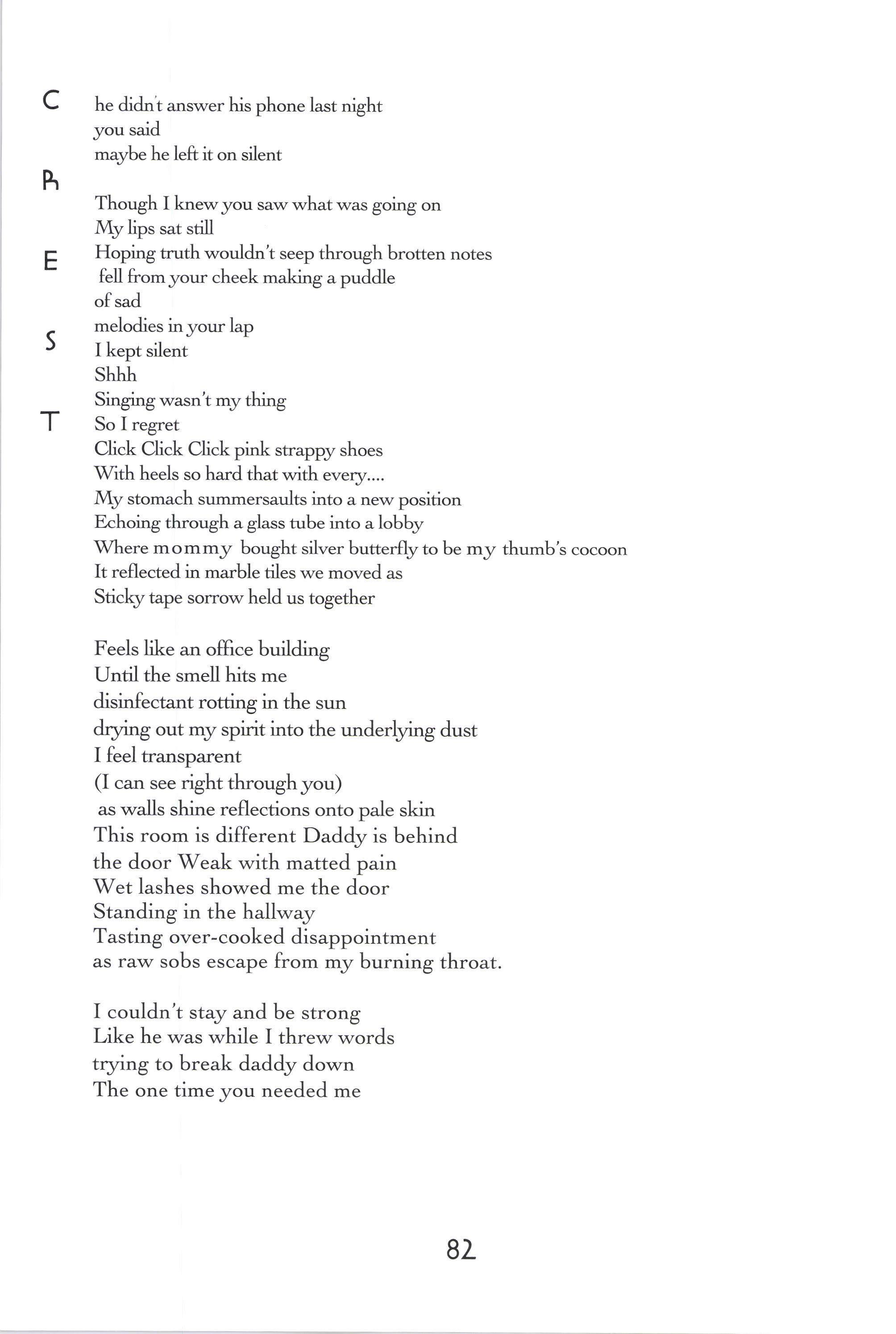 Donorica Harris, Brandon Long, Maria Villeda, Amy Lutz, Sarah Chambliss, Alicia Ludwig, Julius Cousin, Jasmine Grayer, Gabrielle'W'orley, Tabitha Watson, Michael Willis, Jacquanet Goggins, Alison Barthwell, Yasmin Abdalla, Iman Shumpert, Fanisha Calvert A Joke on a Drunken Beggar Stephanie [,ee Five Hundred Eighqz Seven Sarah I-eitson Mr. Weatherman Kirsten Rusinak Suffocate the Silence Sky Pickren Solo Teddy Swenson Letter to Dr. King Alex MacMillan Ice Peter Kahn No Longer A Sonnet Carling FitzSimmons Peppered Peter Kahn Play-Fighting Tom Re;,molds-Ejzak Intelligent Elephant Richard Zabransky
