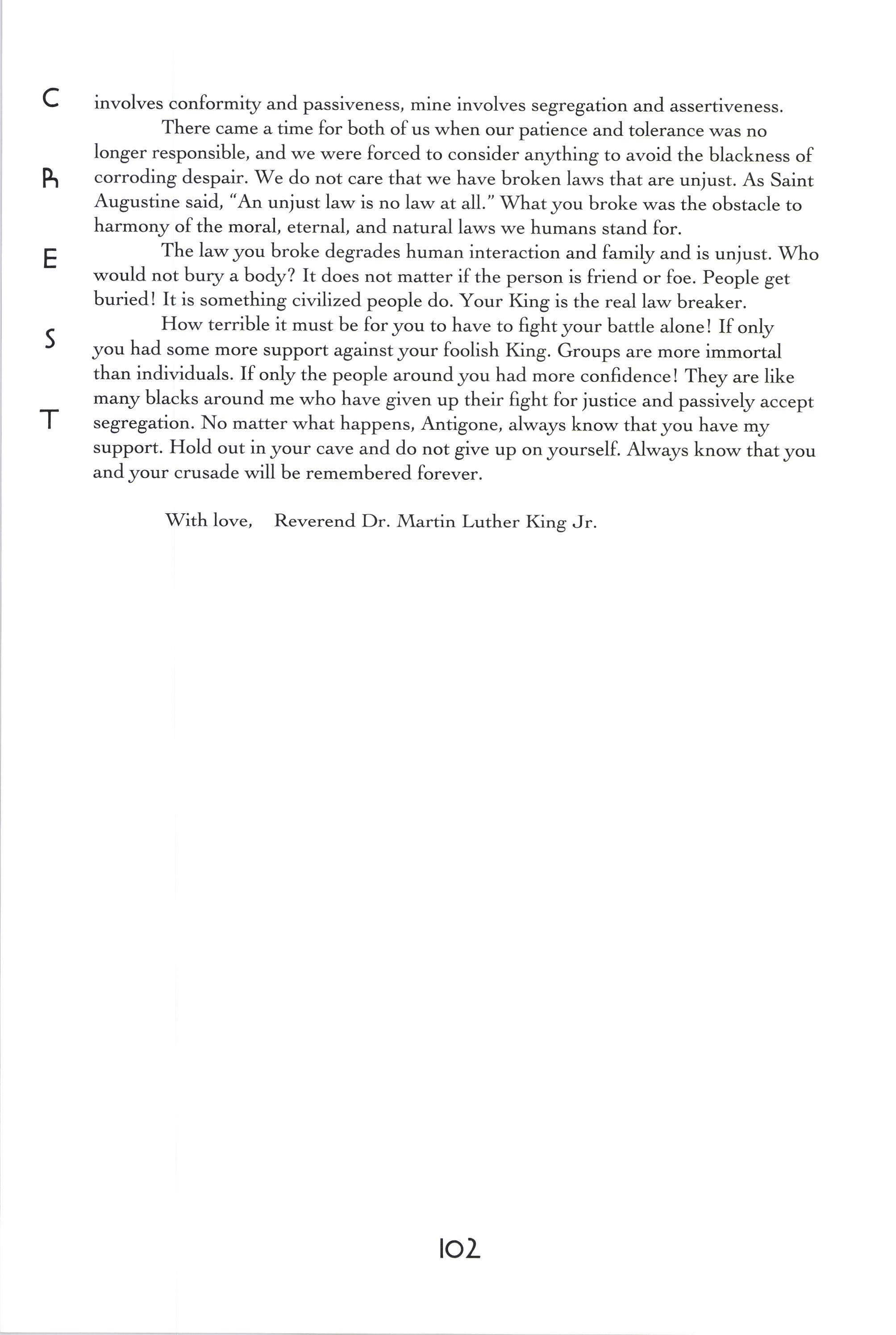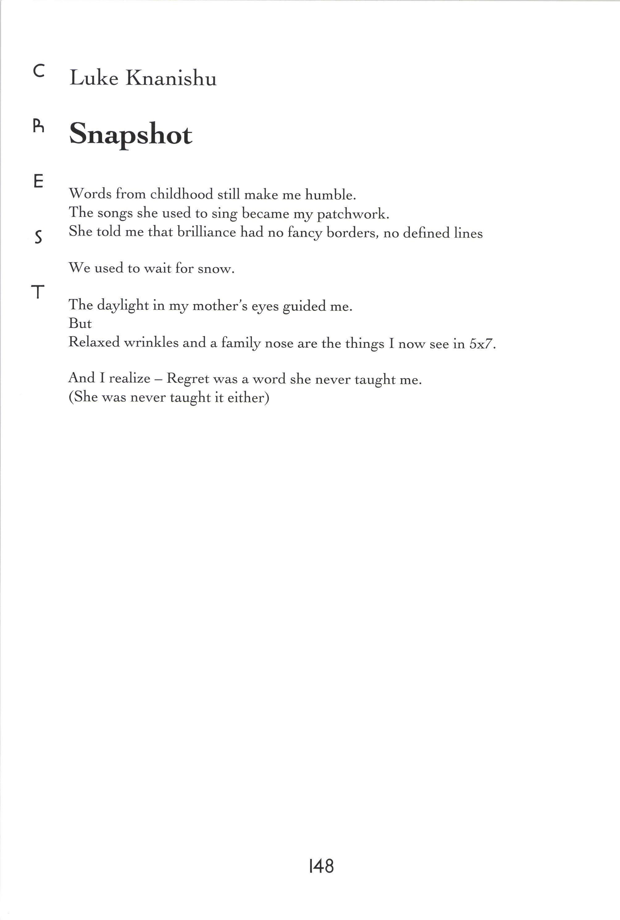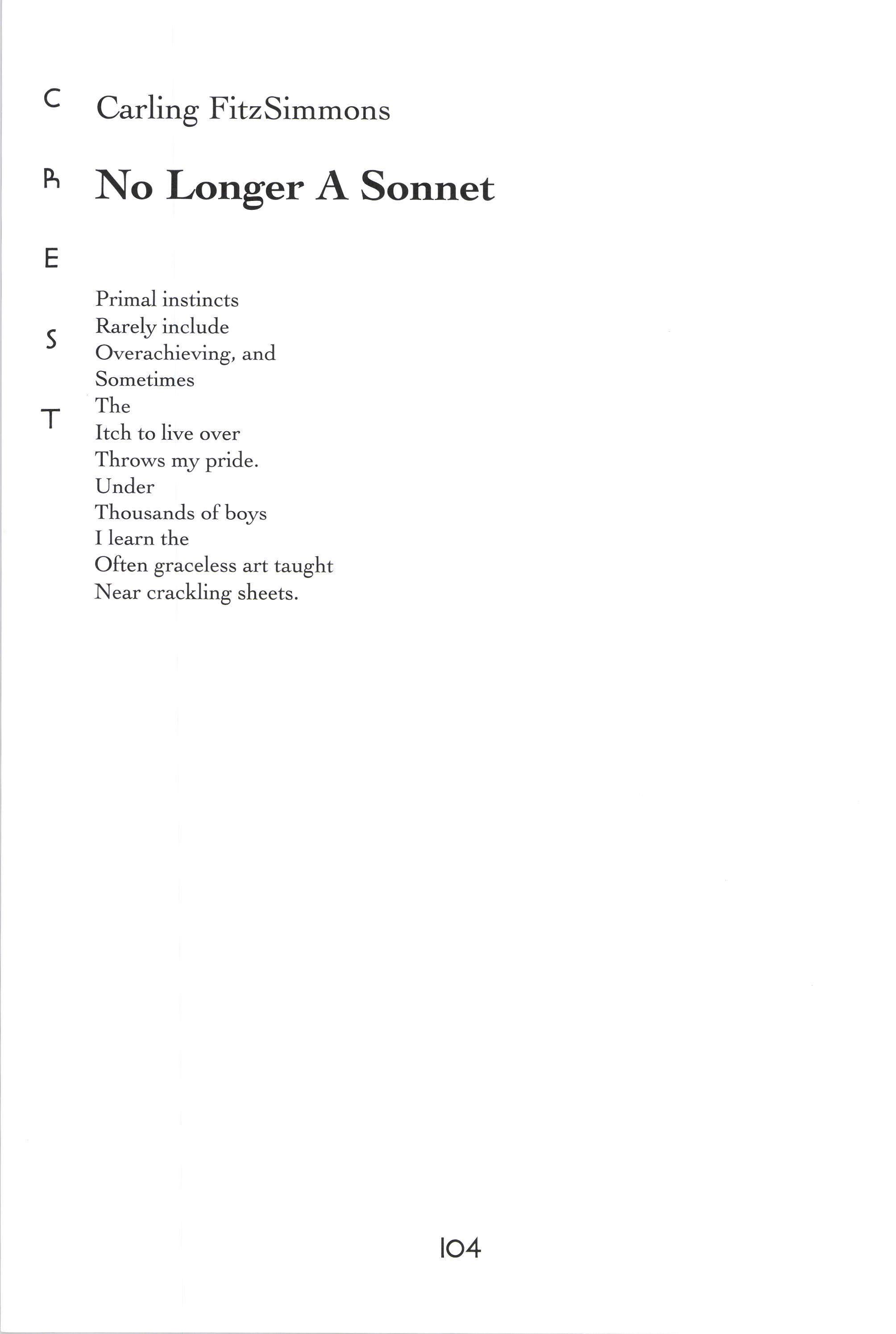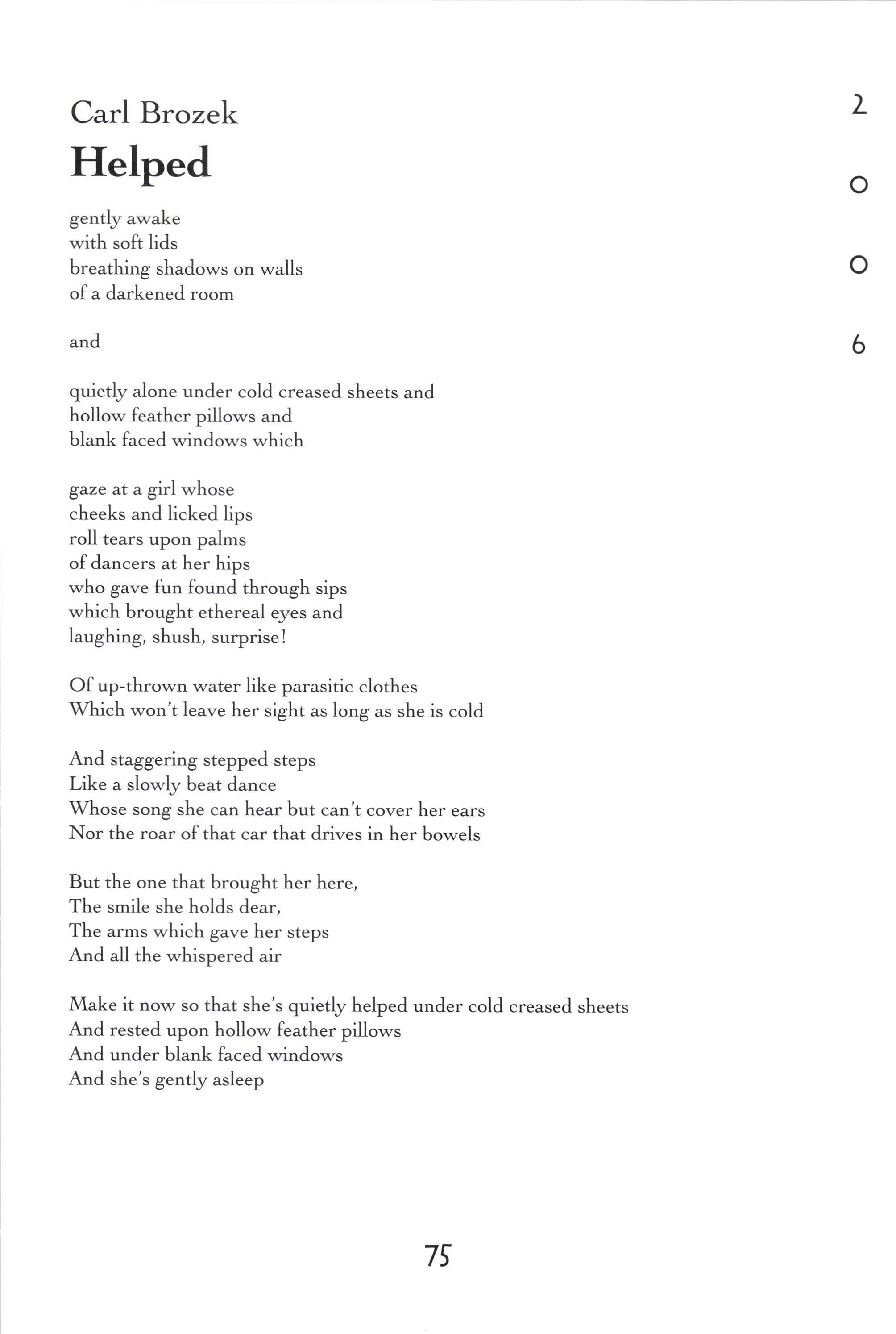 Donorica Harris, Brandon Long, Maria Villeda, Amy Lutz, Sarah Chambliss, Alicia Ludwig, Julius Cousin, Jasmine Grayer, Gabrielle'W'orley, Tabitha Watson, Michael Willis, Jacquanet Goggins, Alison Barthwell, Yasmin Abdalla, Iman Shumpert, Fanisha Calvert A Joke on a Drunken Beggar Stephanie [,ee Five Hundred Eighqz Seven Sarah I-eitson Mr. Weatherman Kirsten Rusinak Suffocate the Silence Sky Pickren Solo Teddy Swenson Letter to Dr. King Alex MacMillan Ice Peter Kahn No Longer A Sonnet Carling FitzSimmons Peppered Peter Kahn Play-Fighting Tom Re;,molds-Ejzak Intelligent Elephant Richard Zabransky