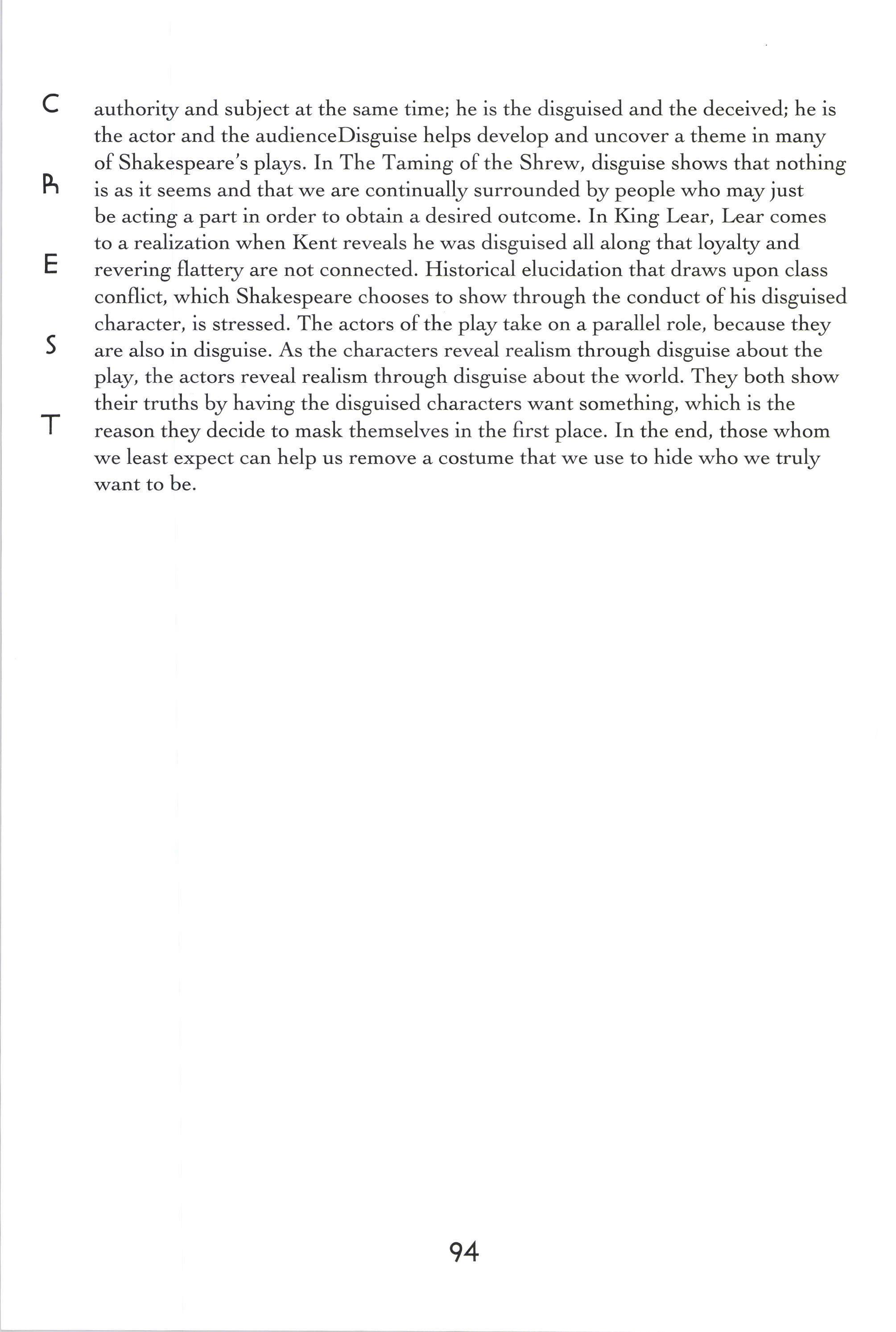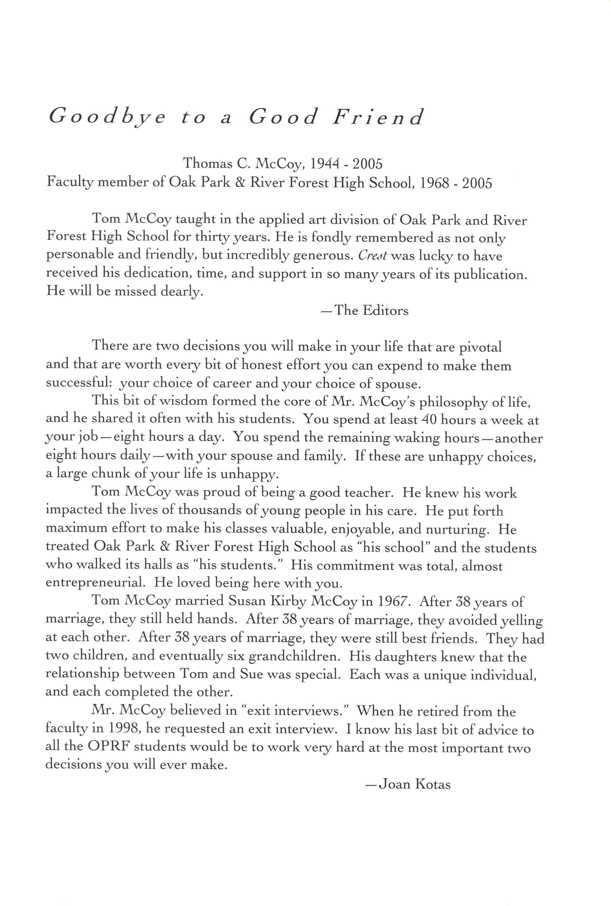Tom McCoy taught in the applied art diwision of Oak Park and River Forest High School for thirqzyears. He is fondly remembered as not only personable and friendly, but incredibly generots. Crettwas lucky to have received his dedication, time, and support in so manyyears of its publication. He will be missed dearly.