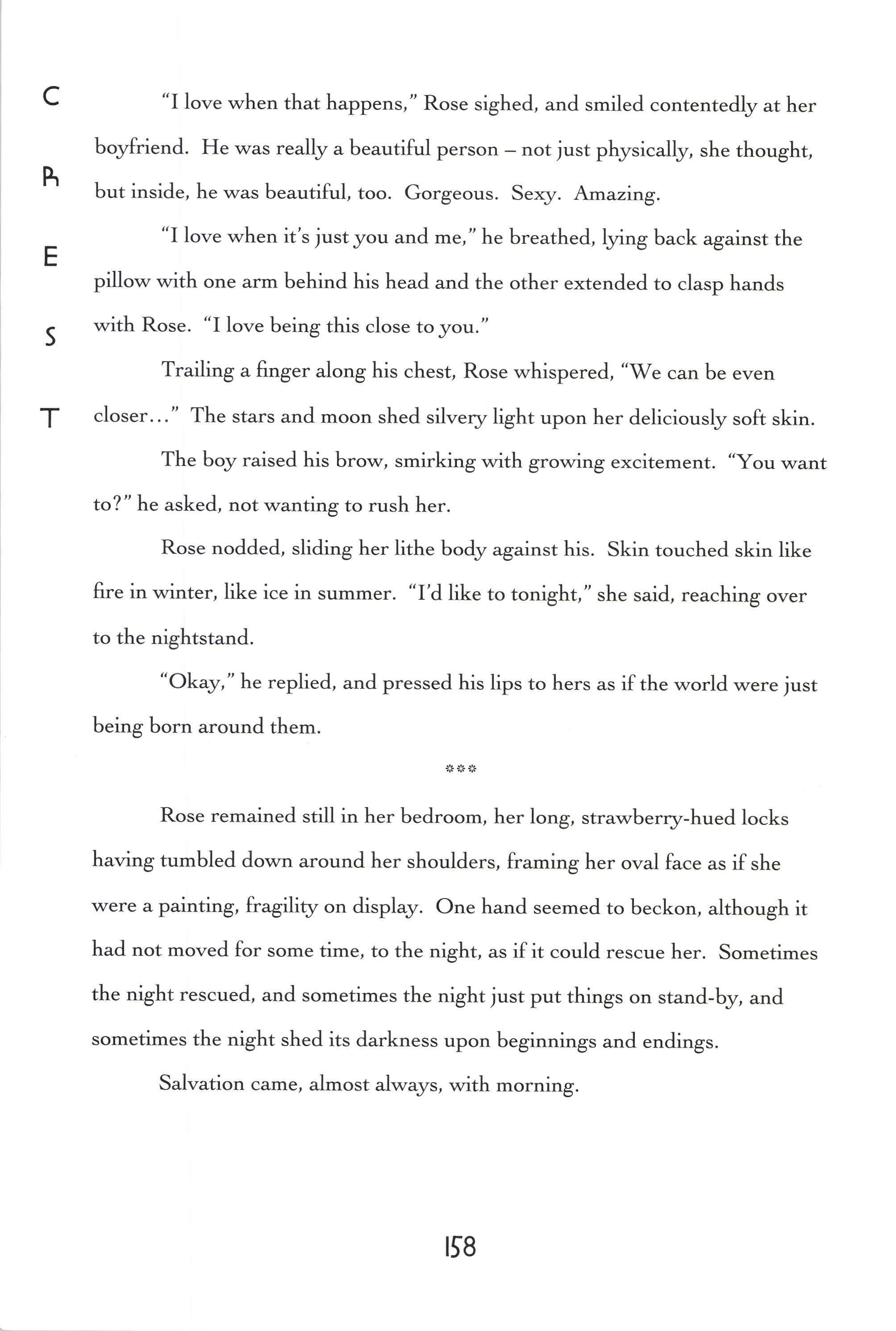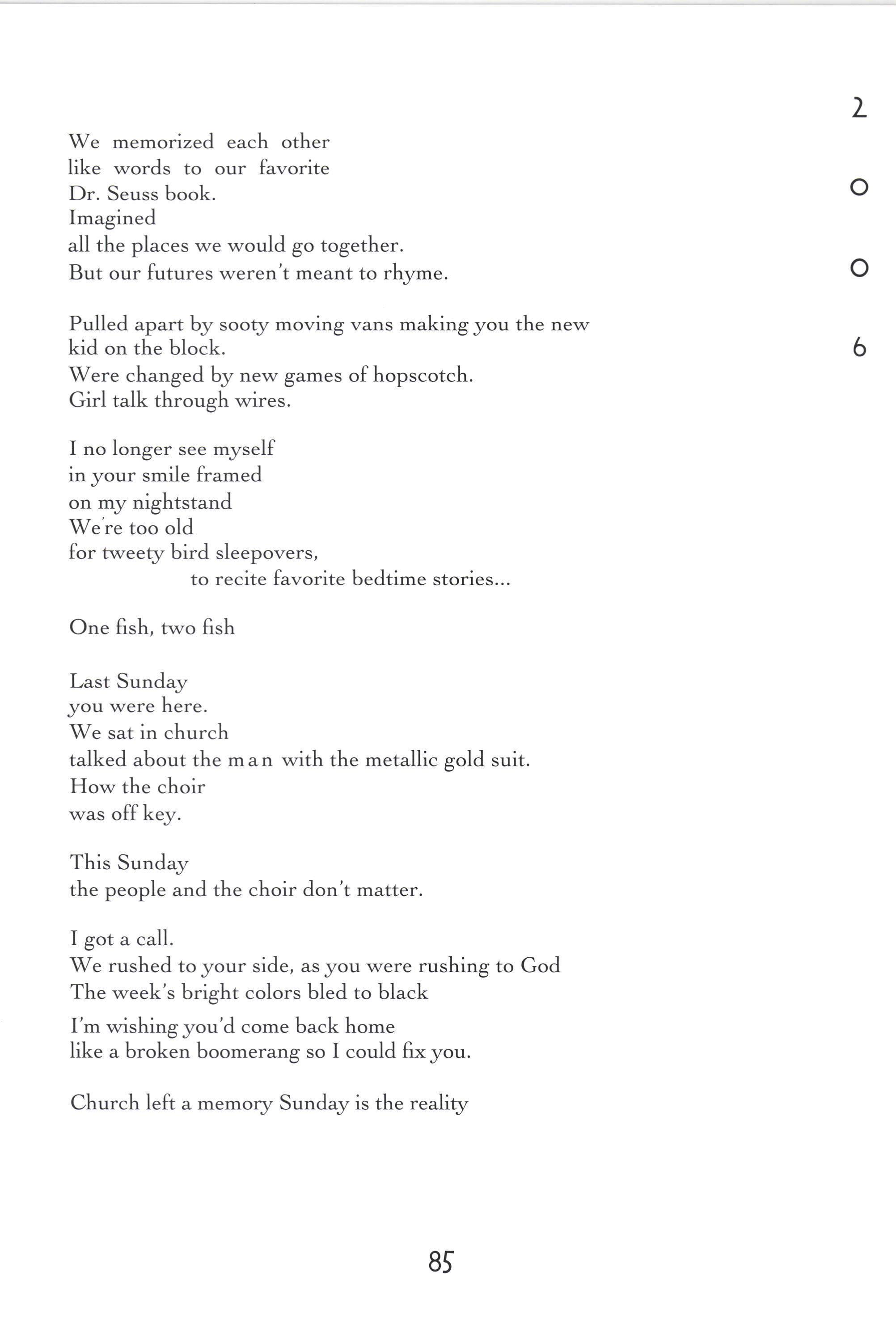 TThere are things I can't remember and things I can't forget. Things still hidden inside our periosteum and things stashed away in Grandma's drawers, Iong-gone. Books stacked one on the other, filling the emp[r space between the old bars and the new mattress. Pictures with fingerprints. Autumn leaves, sticks, small rocks and seashells, pencils and crayons - out of the lines, out of the boundaries. Thieved food, an old and broken pistol stuffed with play, A pinky, 5 notebooks (Hilary, Carter, Paige, Ashlen, Kelsey), tubes of purple, pink, red lipstick. AII sorts of treasures.