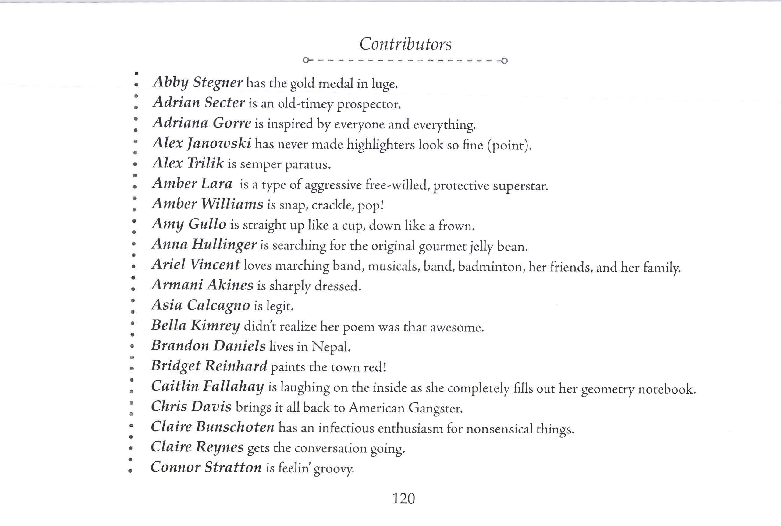 Paul Deziel is psyched to be apart of CREST, and hed like to thank Emily Smith for literary advice and Mr. Goldberg for inspiration (Philosophy).