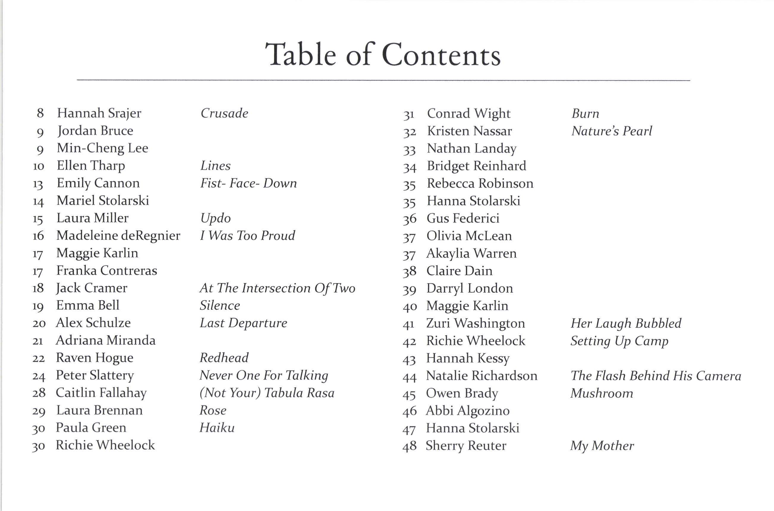 I'd like to thank my fellow editors and our faculty advisor, Mr. Noble, for all their hard and earnest work, but most of all, I'd like to thank you for allowing us to showcase your immeasurable talent. I hope you enjoy Crest zou! I wish you well in all your present and future travels and hope you find what you're looking for.