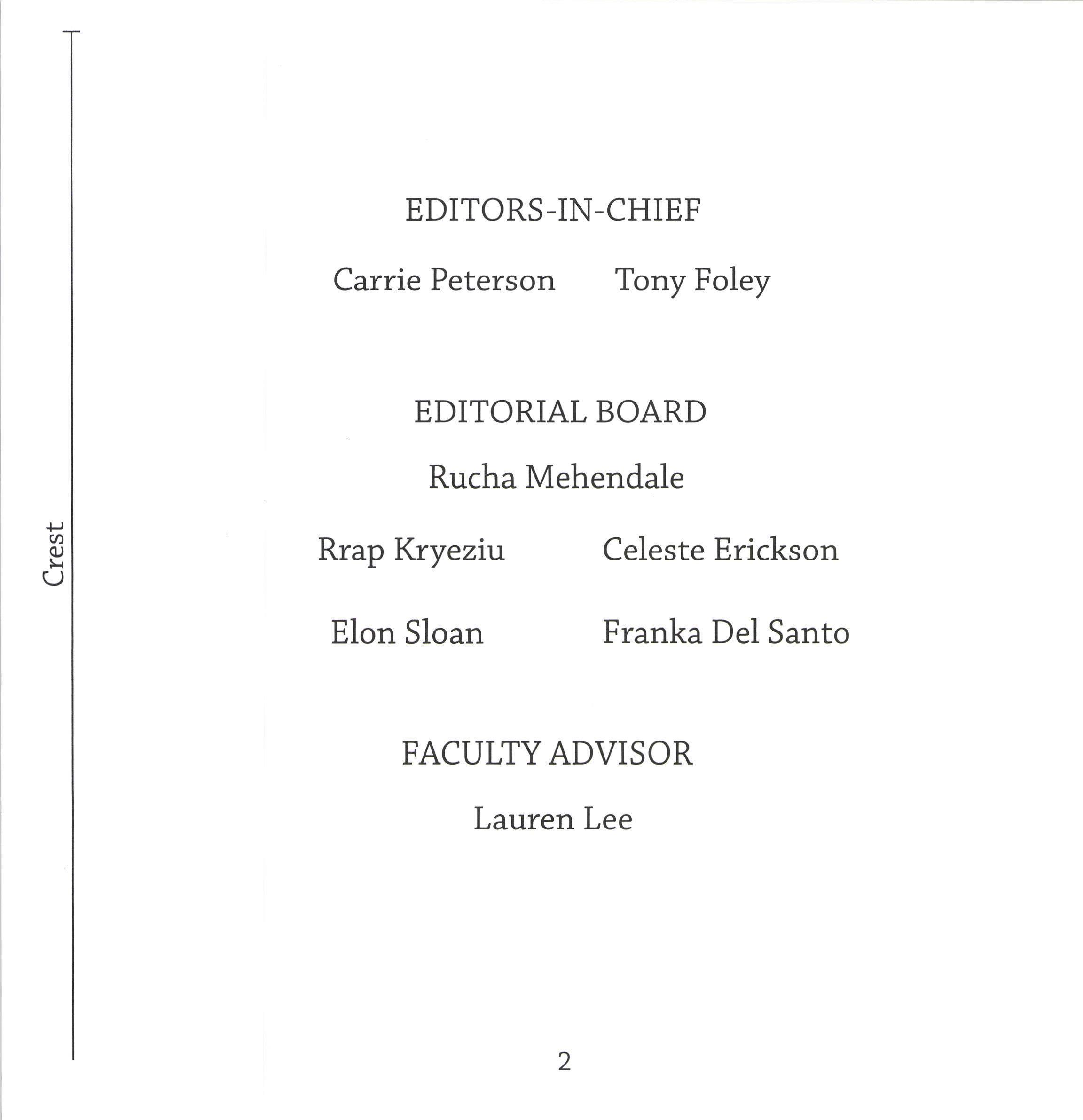 Crest would be simply an empty set of pages if not for the students who shuttle their work to our room, the continued support of the faculty throughout the building, the exceptional skill of our editorial board, and the guidance of our advisor, Ms. Lee.