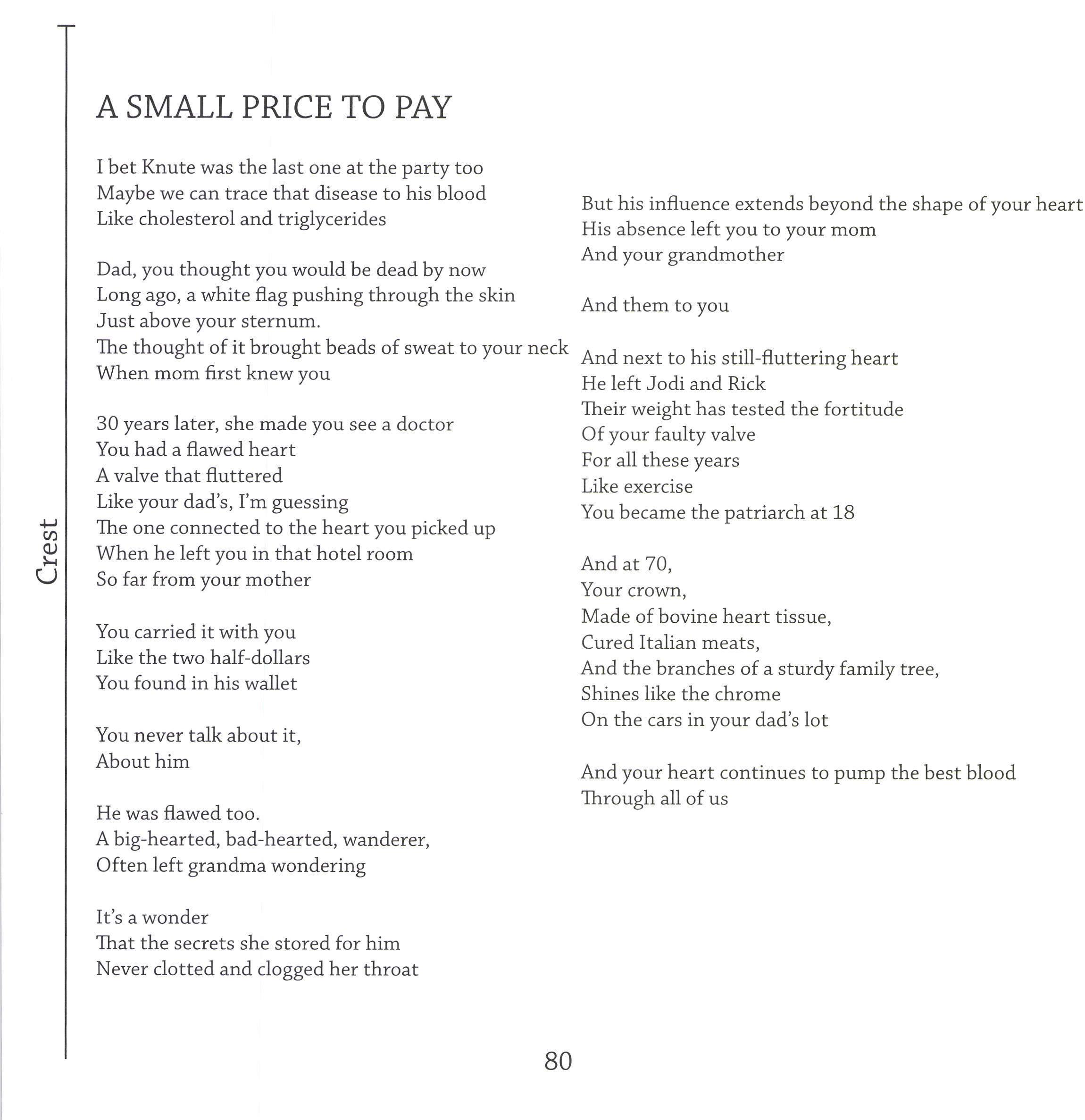 Winter of 201L. A silent chair looks lonesome without the burden of your presence. It waits. Metal arms speckled with chipped paint may have grown as cold as you must be, yet the burnt-orange leather still seems to hold your indent. A lingering memory of your musky soap smacks me in the chest. I'm as reluctant to accept your absence as the worn lawn furniture. We wait.