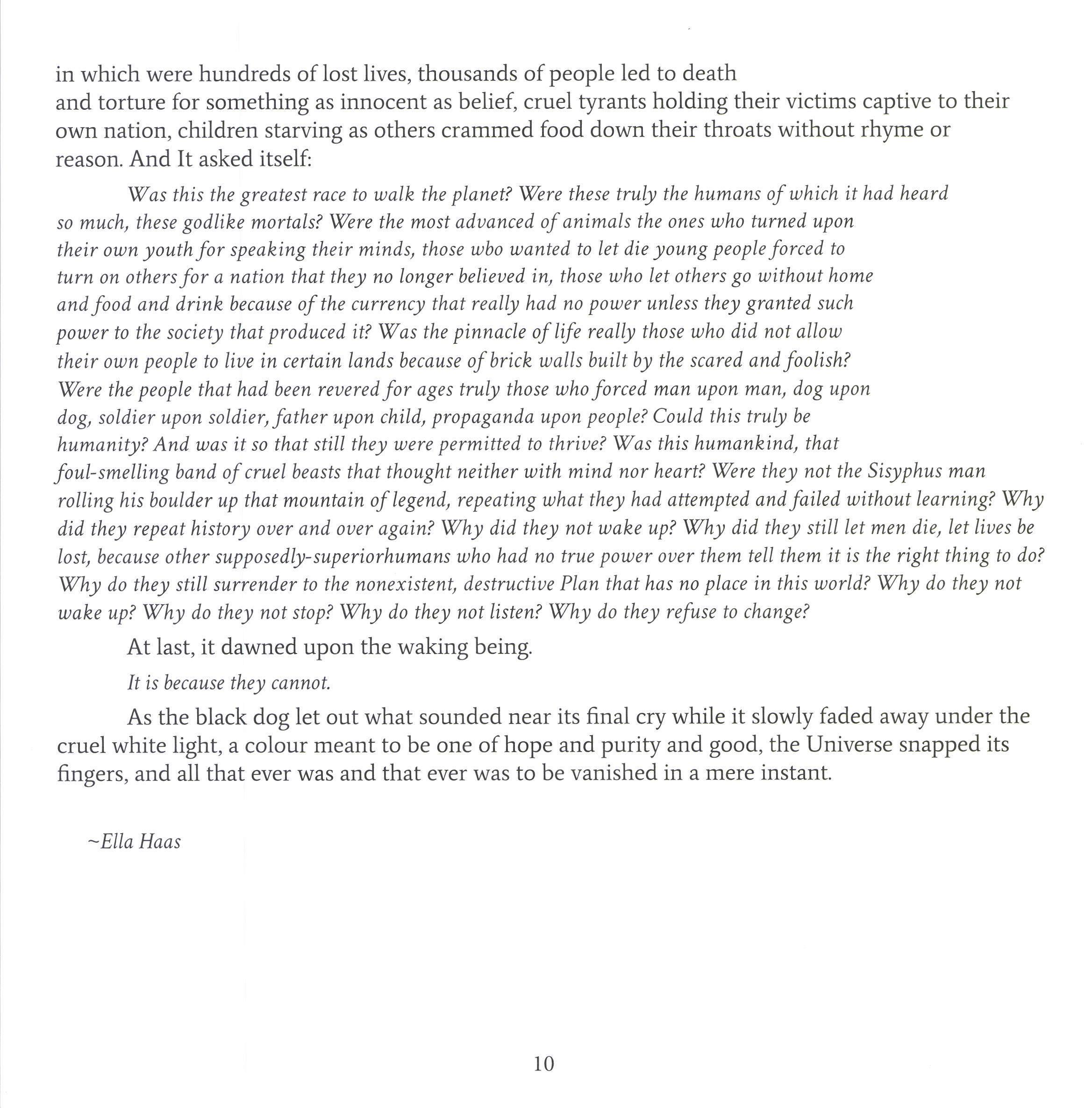 As the black dog let out what sounded near its final cry while it slowly faded away under the cruel white light, a colour meant to be one of hope and purity and good, the Universe snapped its fingers, and all that ever was and that ever was to be vanished in a mere instant.