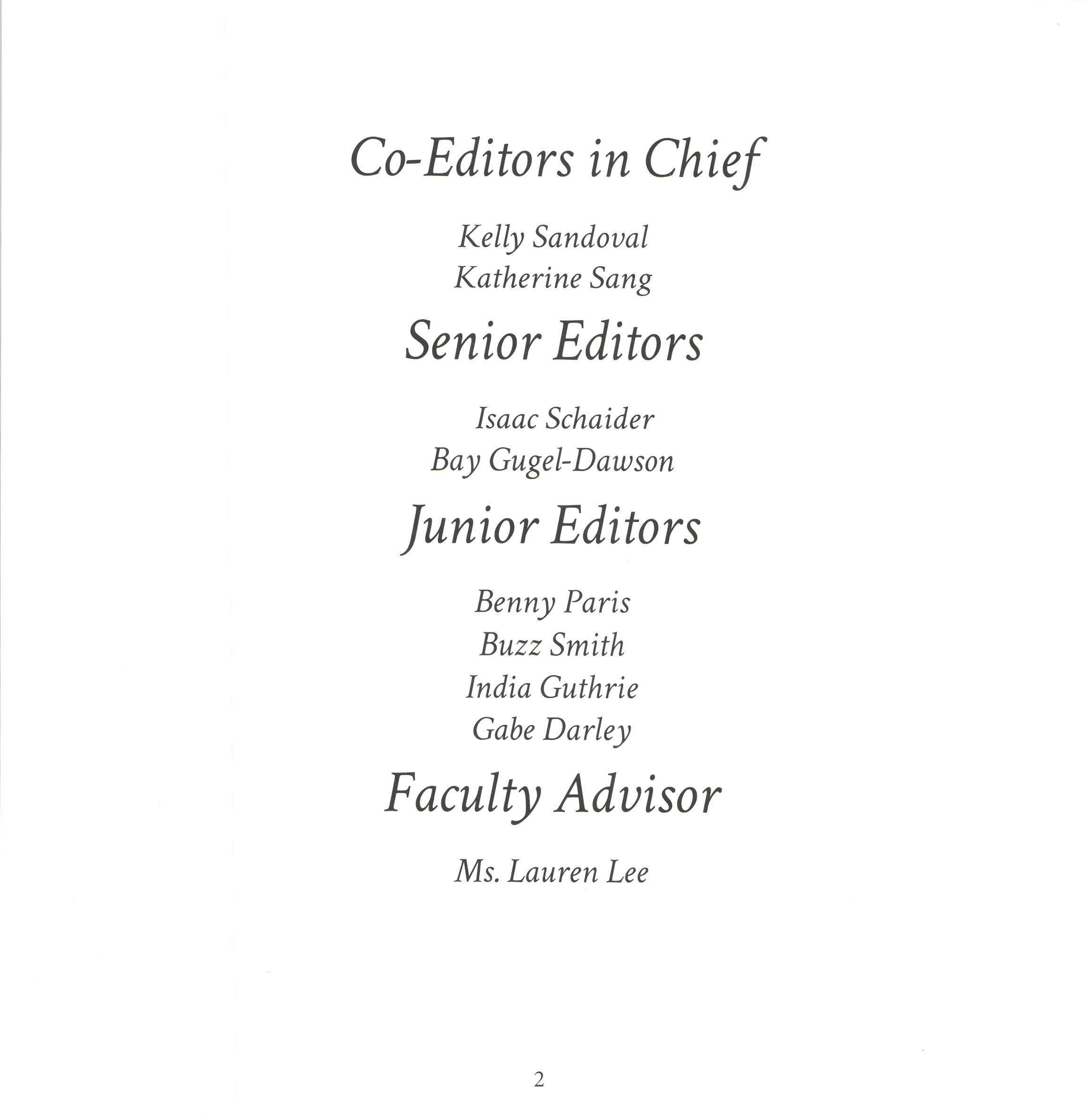 All our love, Kelly Sandoval and Katherine Sang Co-Editors-in-Chief, Crest 20L7