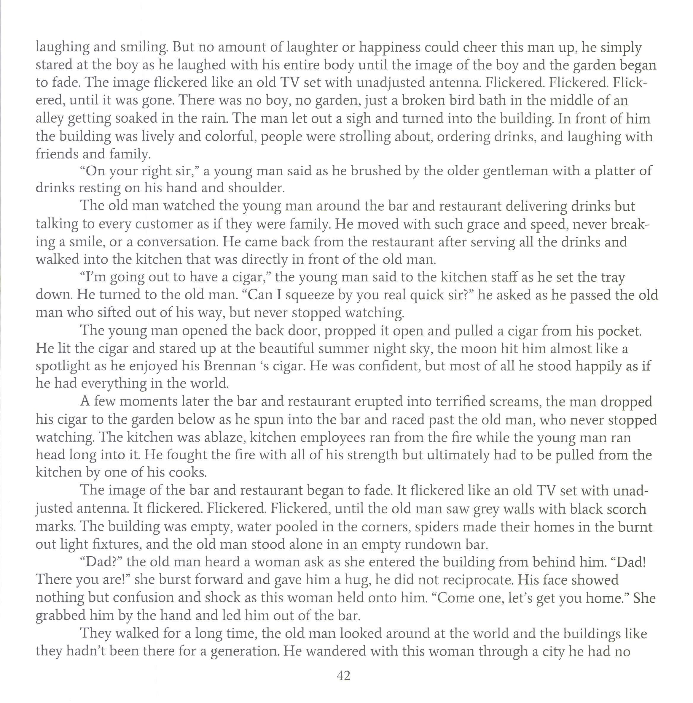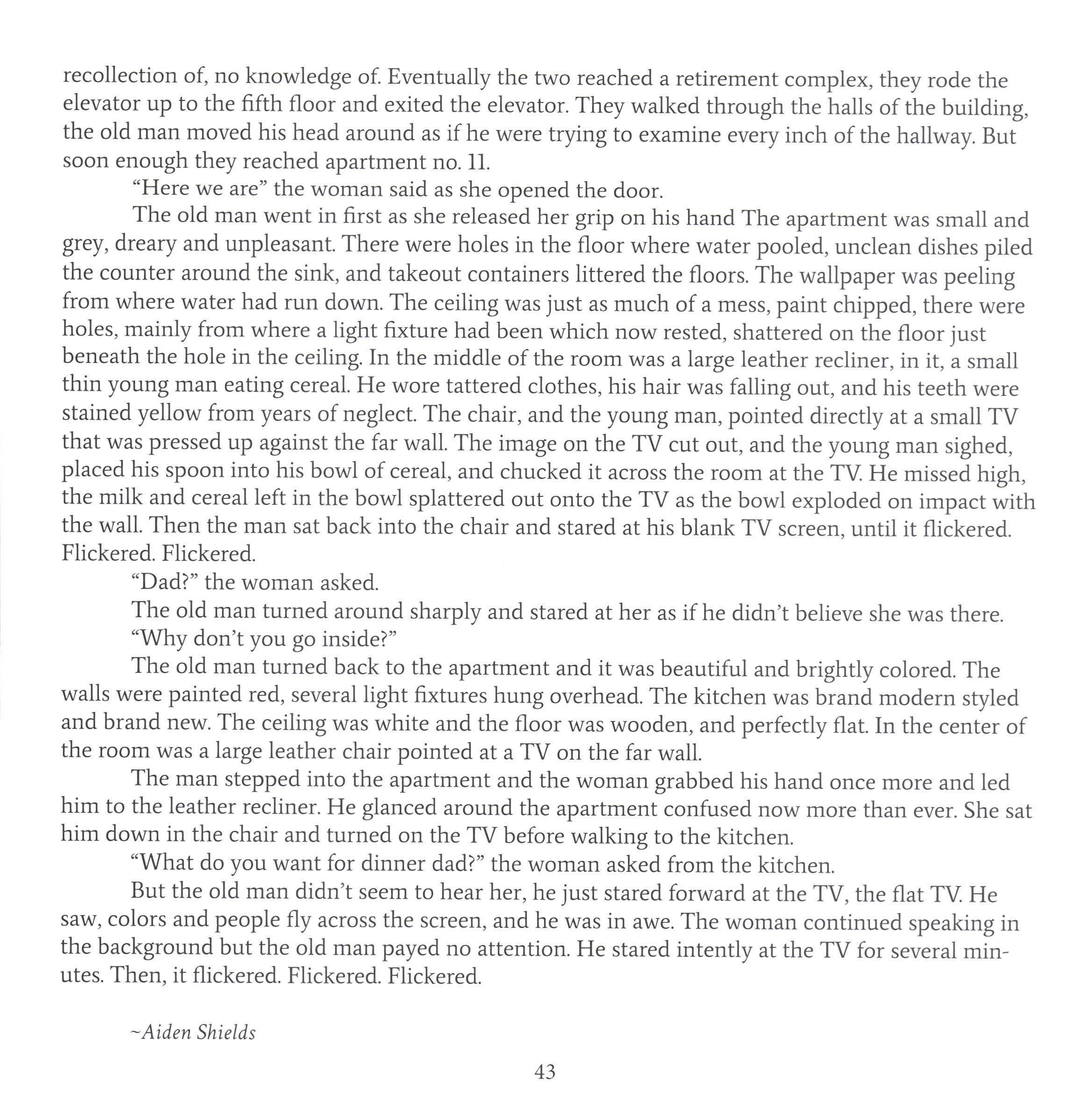 My great grandpa died in the fall. After the funeral I watched my grandfather traipse around the back yard. He picked up sticks as he went around and around until the lawn was well manicured. My father went out to join him. I watched them talk and the sky turn gray. The leaves were burnt orange and brown, but the image became black and white. I went outside. Both of their similarly shaped heads faced the garden as they pointed to different parts of its collage. \Mhen my grandpa heard my foot snap a twig, he turned around, eyes wide and glaring at the twig he missed.