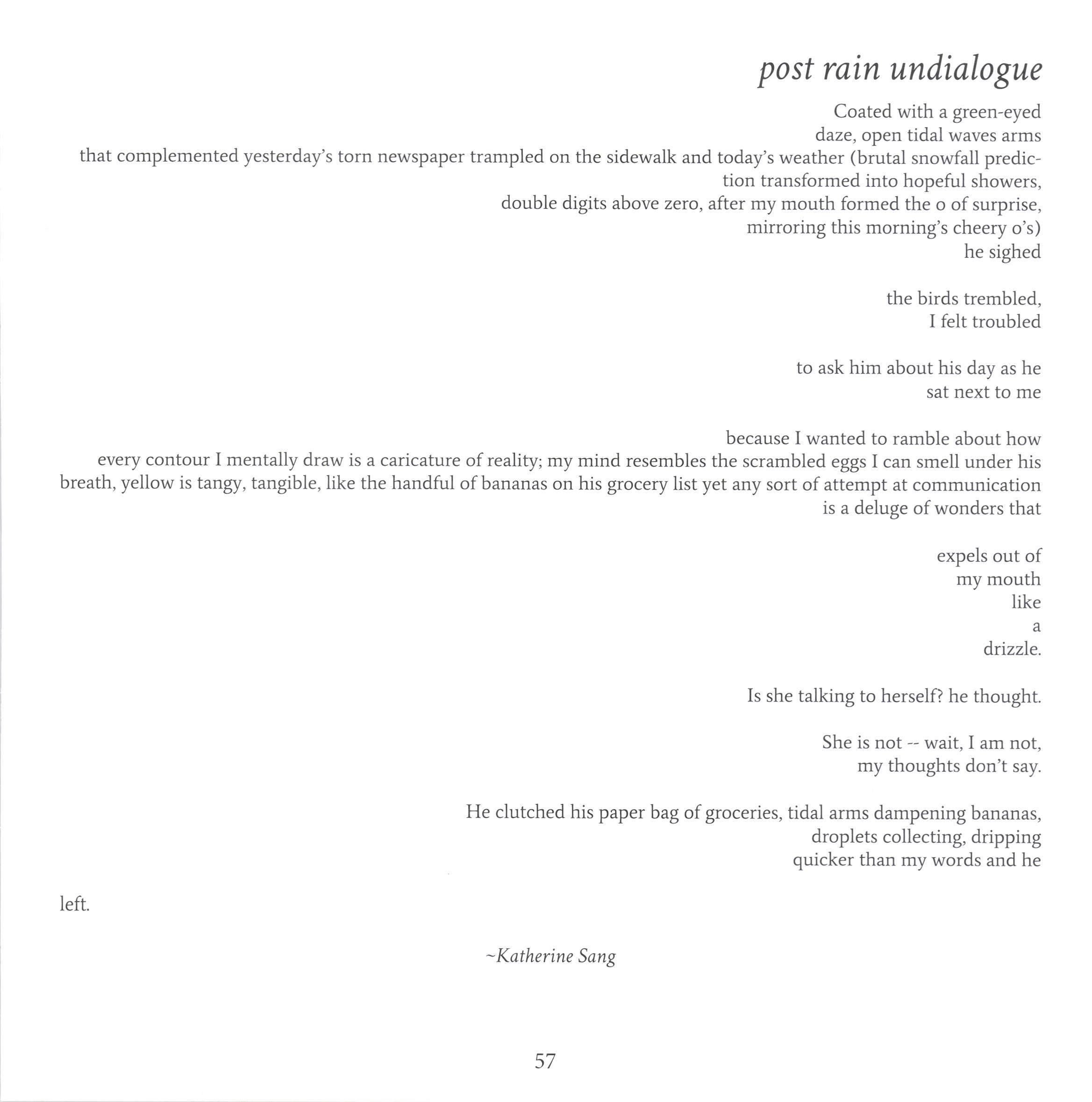 There was once a Mayan queen who pulled rope through her tongue to satisf,i a man who only appeared in the clouds. And the people warned her that bloodletting would leave nothing but half drained veins and a dislocation of her values. IvIy grandfather asks if I want to get married when I grow up. He assumes that a woman should curl around a man like welded iron on the crown of a king. As if I could pull my lover down from the clouds with my rope, because I am always the pulley in the relationship. Counterweights would never break even, ropes would splinter and spur. So do not tie me down with those loop-knots, those don't-taik-to-other-guy-knots, those you-have-to-do-all-the-work-and-not-break-a-sweat-knots, because I untie your standards.