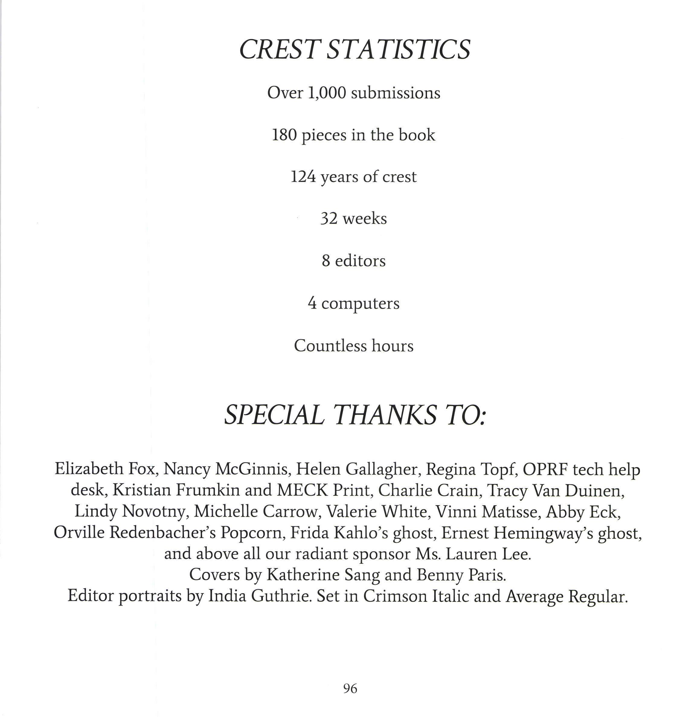 As you read through this 96 page magazine we hope you appreciate all the beautiful works produced by students and truly recognize the undeniable display of OPRF's tradition of excellence. We profusely thank the school for generously supporting Crest for so many years. It is easy to take for granted this publication but we must remember it is rare to have such an opportunity as this. We want to thank everyone for submitting and the continued support of Crest, the encouragement of the OPRF faculty, the support of the administration, and our lovely sponsor, lv1s. Lauren Lee. Every submission we've received this year attests to the talent and bravery of the students. We can only hope you cherish Crest as much as we do.