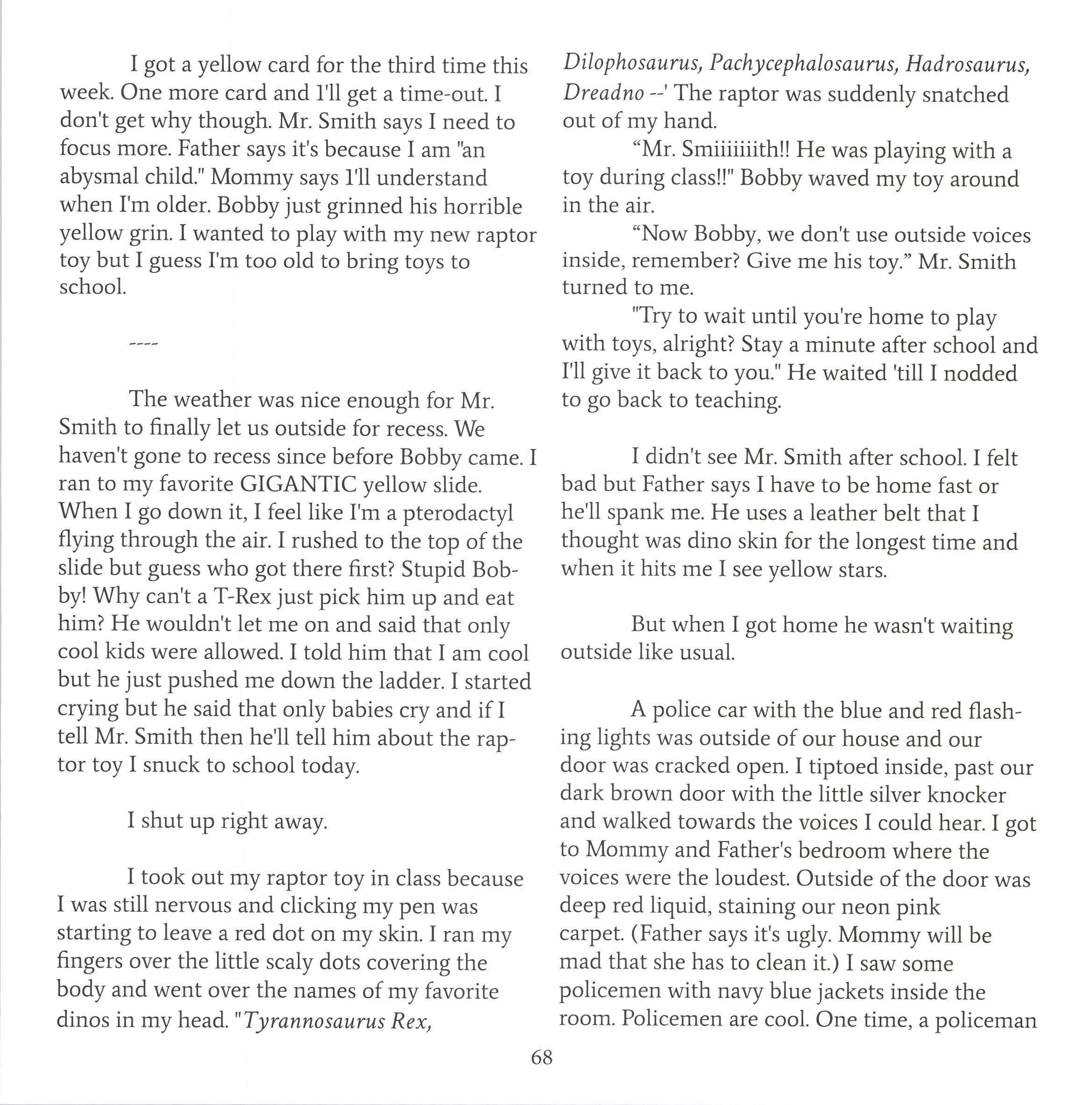 I didn't see IVlr. Smith after school.I felt bad but Father says I have to be home fast or he'lI spank me. He uses a leather belt that I thought was dino skin for the longest time and when it hits me I see yellow stars.