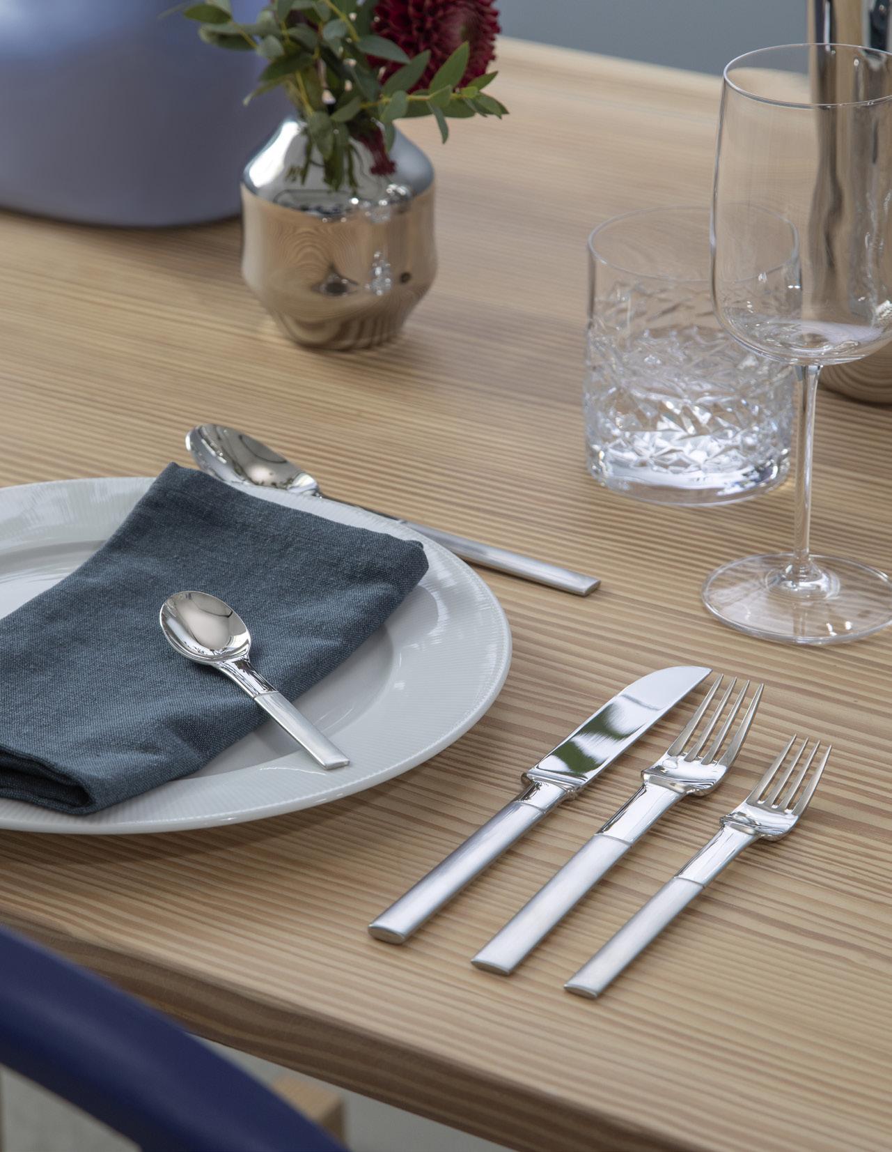 With its simplicity and long lines, the soft sculptural curves and the calmly crafted details underline the modern and Nordic look. An understated, clean design creates elegant flatware that almost floats above the table.